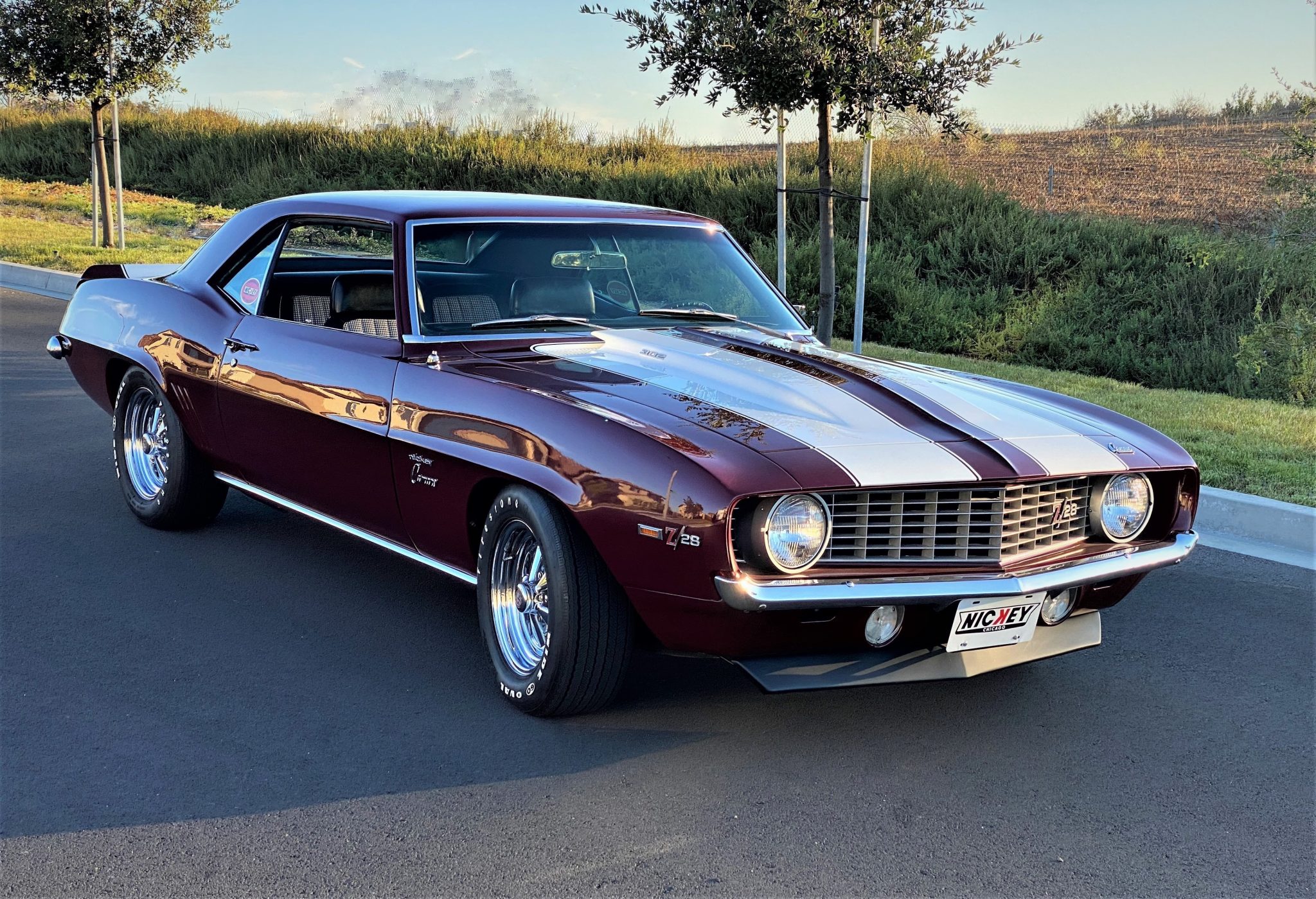 Radir wheels are fitted with Nickey Camaro-logo center caps and are wrapped in 15″ Firestone white-letter tires. Braking is handled by power-assisted disc brakes up front and drums at the rear, and the car is equipped with power steering and Nickey Chevrolet-installed traction bars.