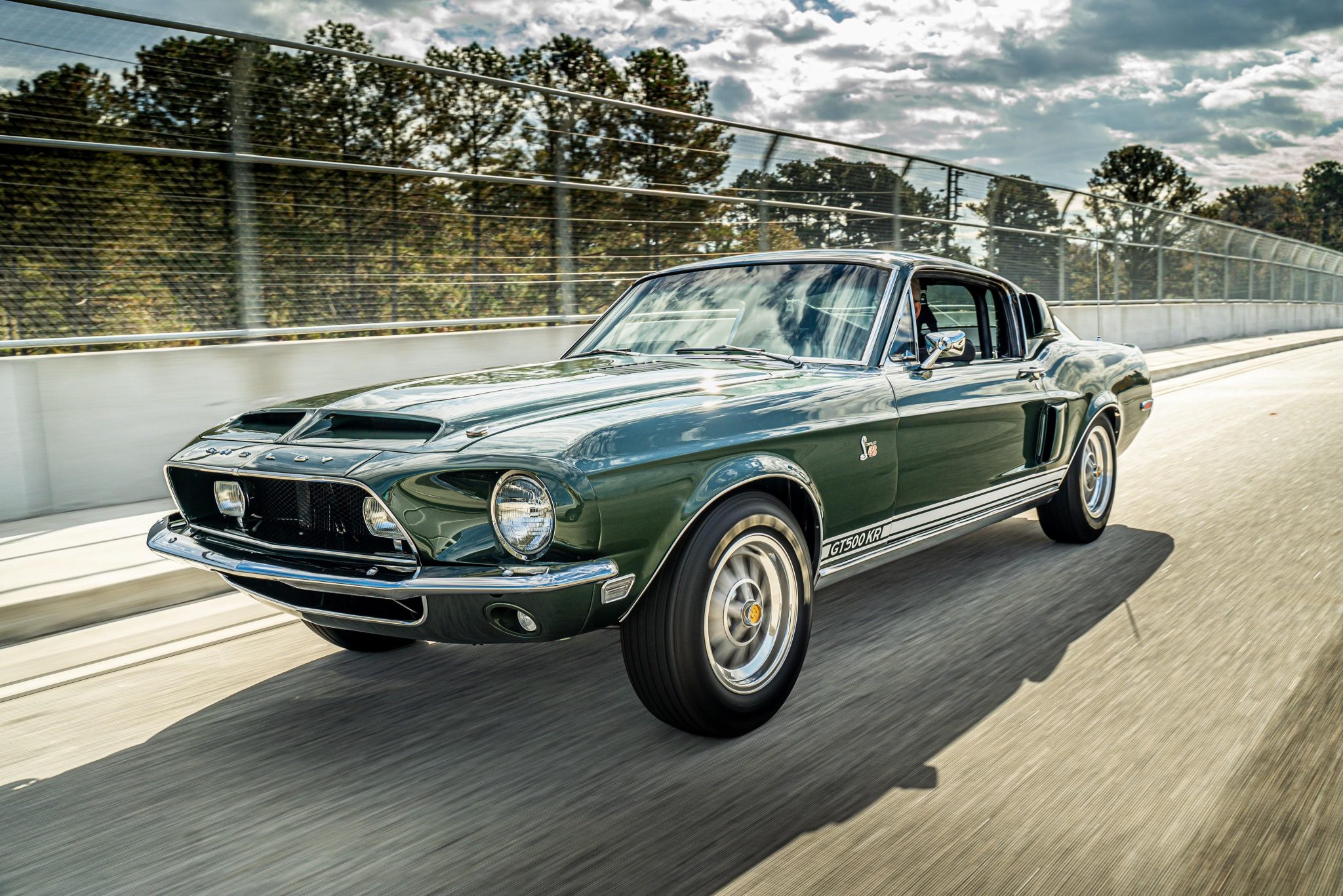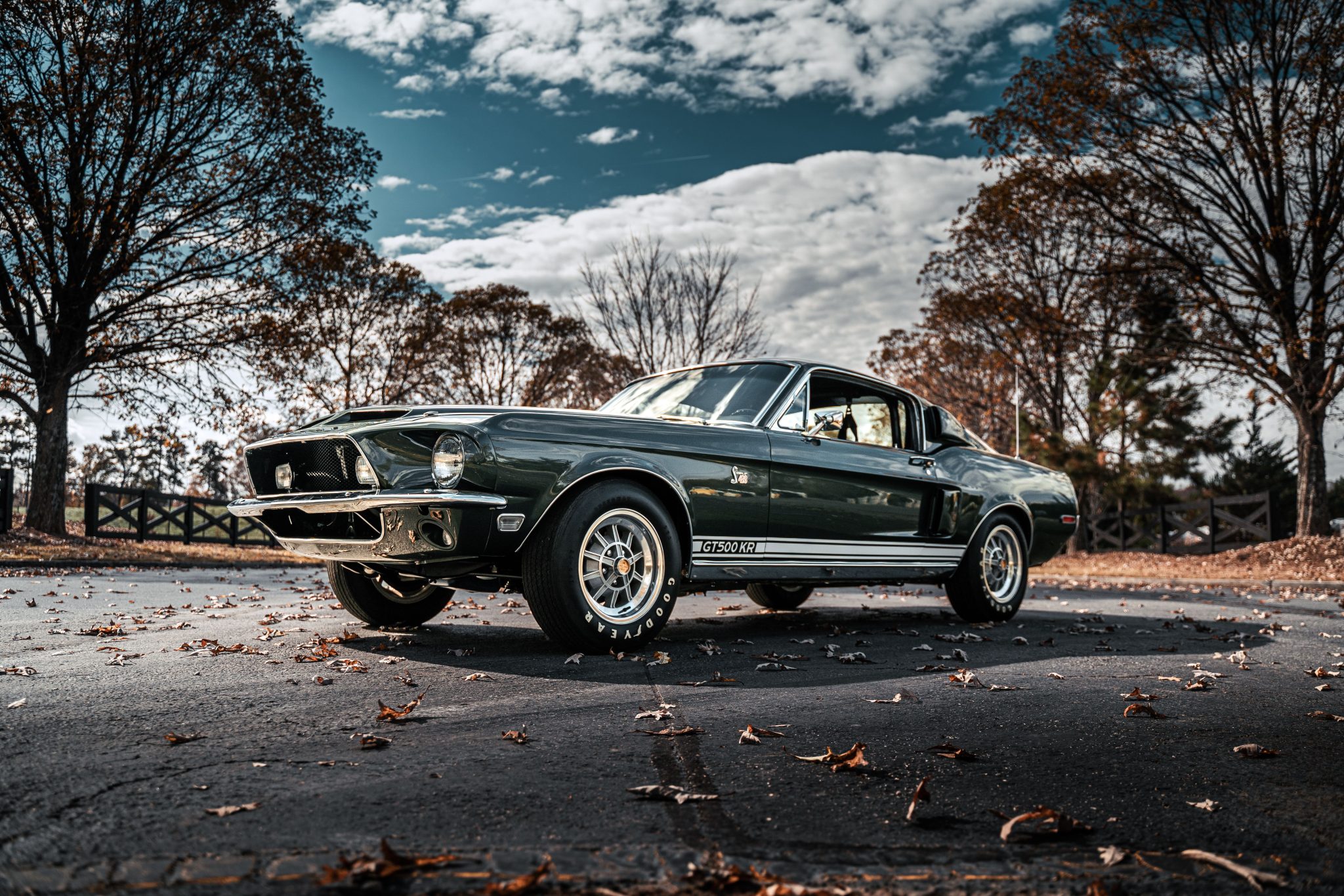 The refurbishment reportedly consisted of media blasting the body and stripping the car to bare metal prior to a repaint in its factory Highland Green. The car is equipped with a Cobra Jet fuel cap and fender badges, and the white rocker panel stripes feature integrated GT500KR lettering. The selling dealer notes the left quarter panel and floor pans have been replaced, and paint imperfections on the leading edge of the right hood scoop are depicted in the gallery.