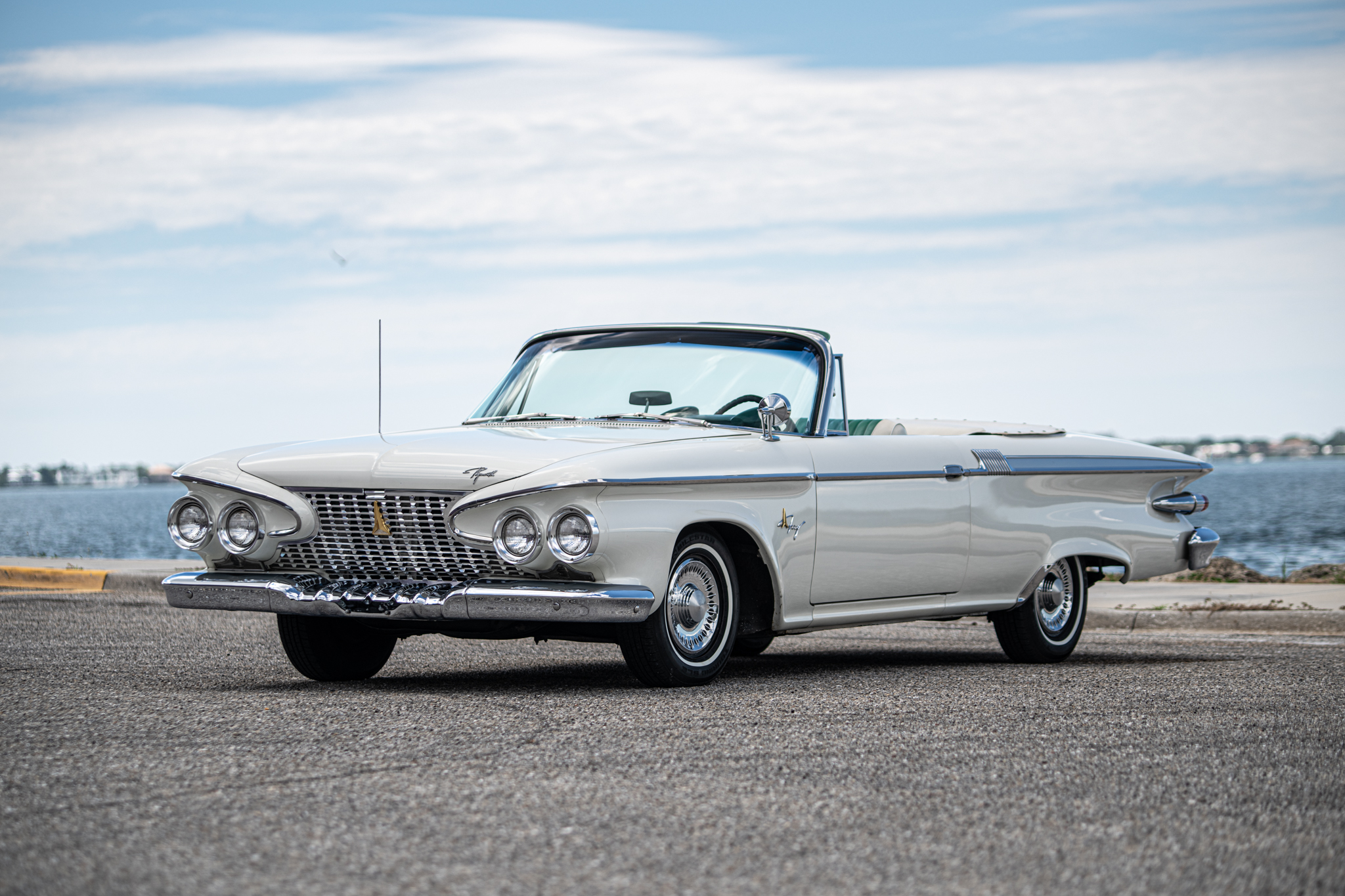 Steel 14″ wheels are fitted with chrome covers and mounted with 205/75 Milestear Touring SLE whitewall radial tires that are said to have been installed under current ownership. A matching spare wheel with a Coker Classic wide whitewall radial tire is stowed in the trunk. The car is equipped with power steering, and braking is handled by drums at all four corners.