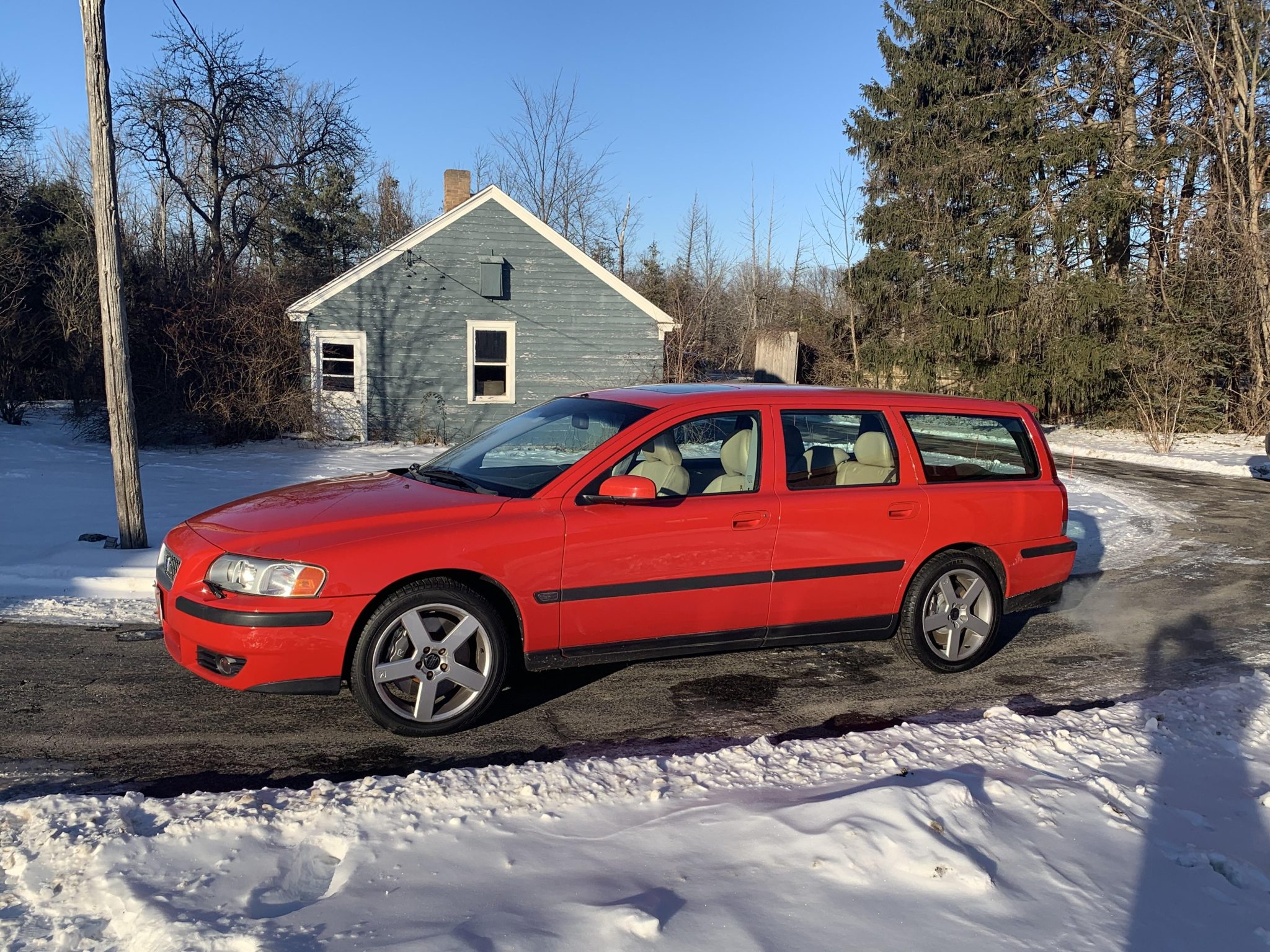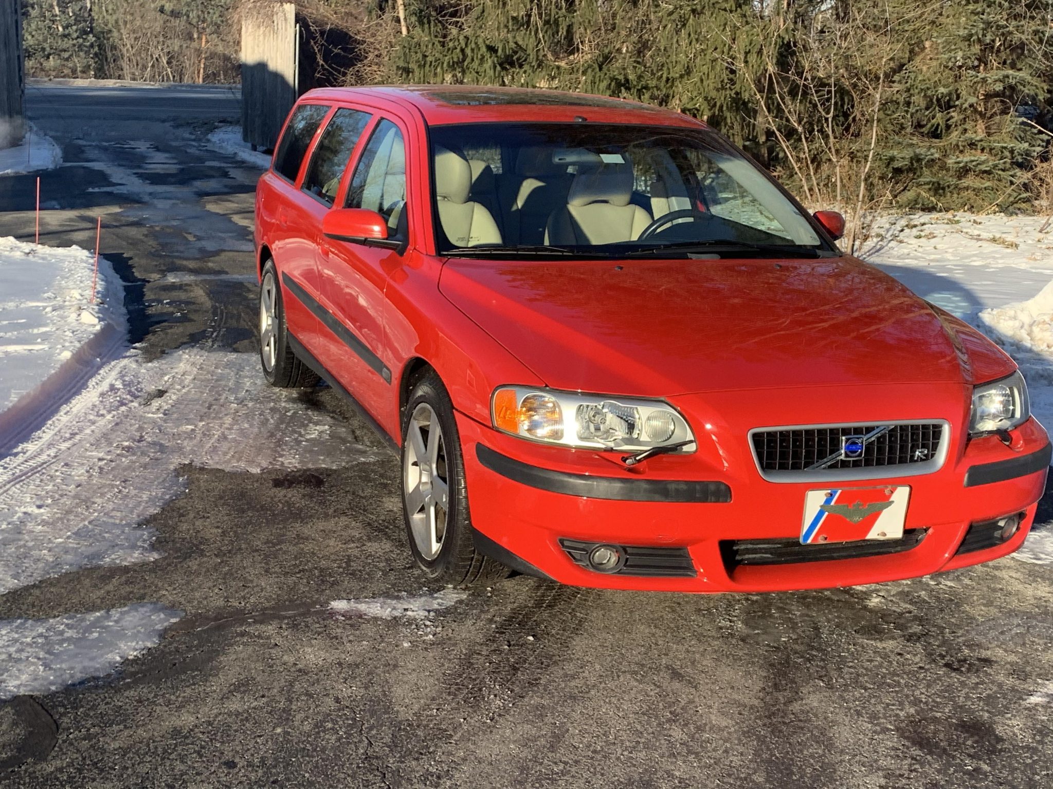 Factory 17″ Pegasus alloy wheels wear Volvo-branded center caps and are mounted with 235/45 Nokian tires. The V70R was upgraded from the factory with a Four-C electronically-adjustable suspension and larger disc brakes with R-branded Brembo calipers. The brake rotors and pads as well as one of the front axle shaft tone rings and hubs were replaced in October 2021 along with the front struts, springs, control arms, ball joints, and sway bar links.