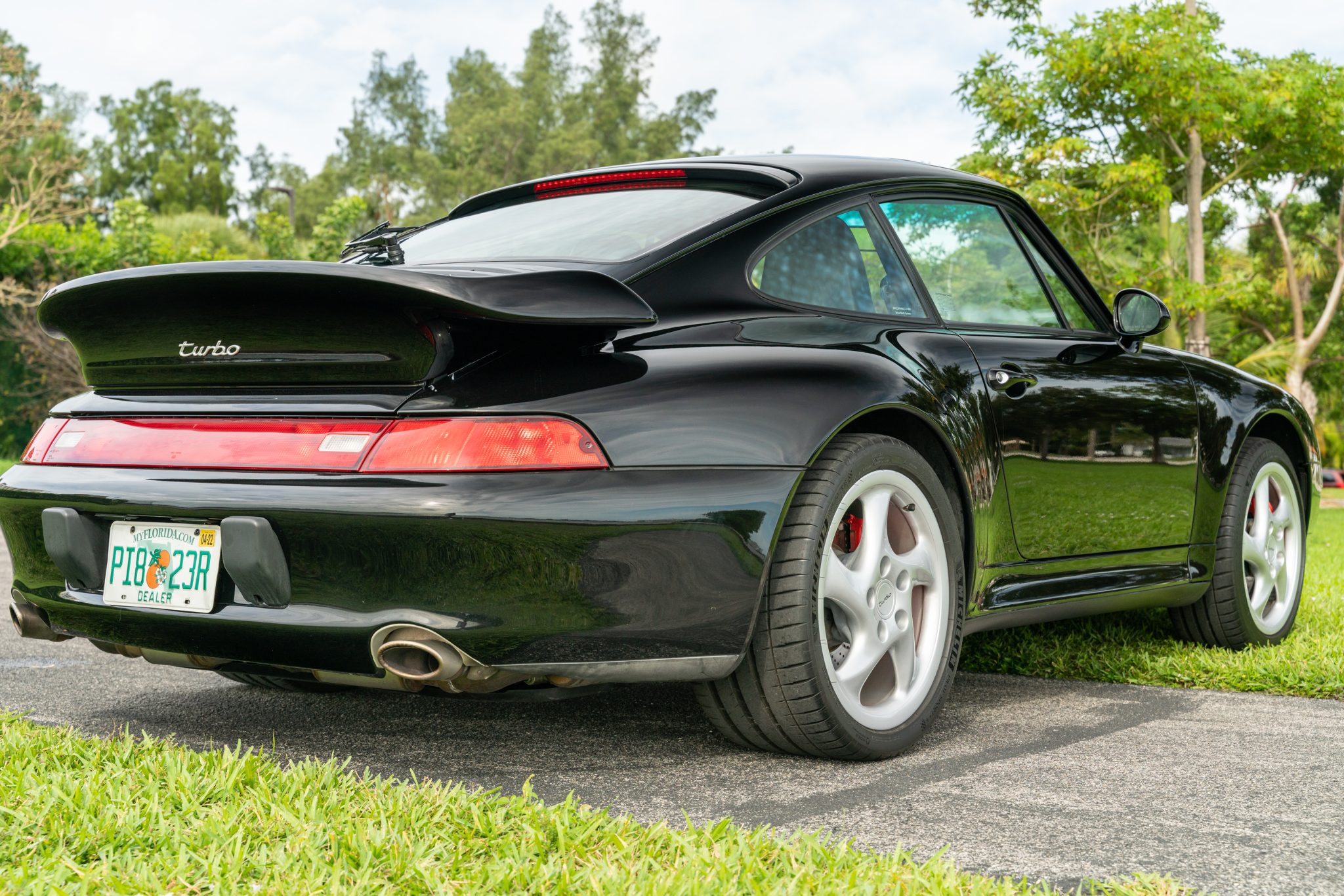 Turbo Twist 18″ wheels with Turbo-script center caps wear staggered-width Michelin Pilot Sport tires fitted during prior ownership and bearing 2020 and 2021 date codes. Braking is provided by four-piston front and two-piston rear red-finished calipers with cross-drilled rotors, and a brake fluid flush was performed and the front pads and rotors were replaced in 2021. The inspection report from June 2021 notes that the rear subframe, front and rear cross members, and right-front suspension components have been replaced, and repairs were made on the left side of the tub.