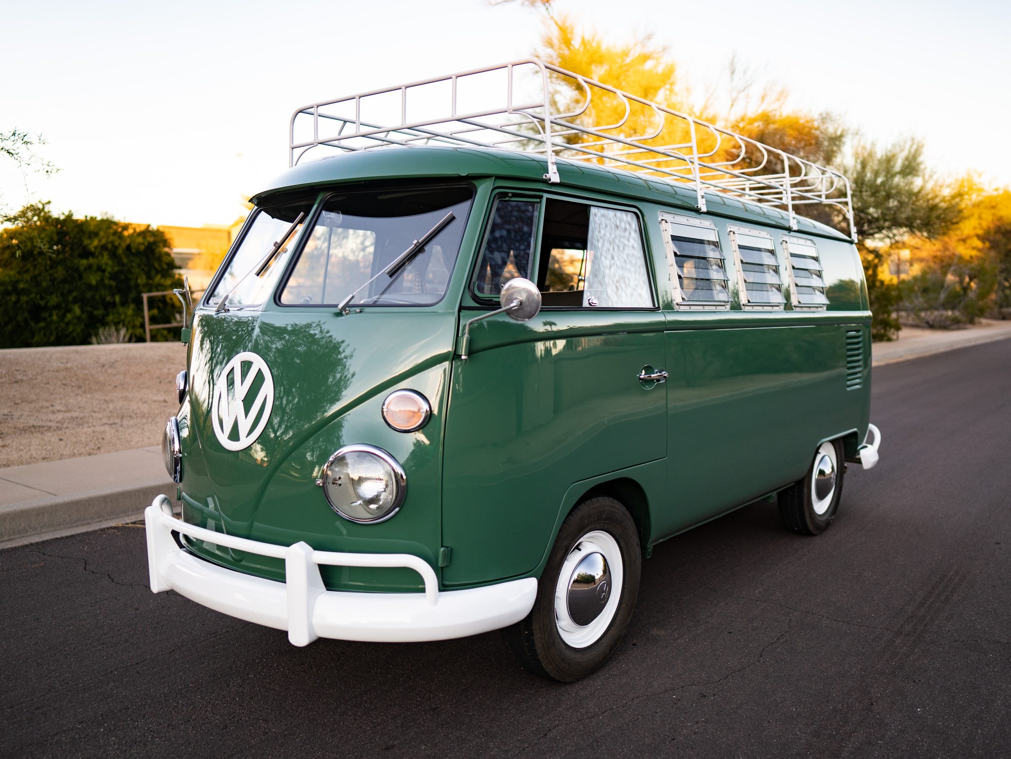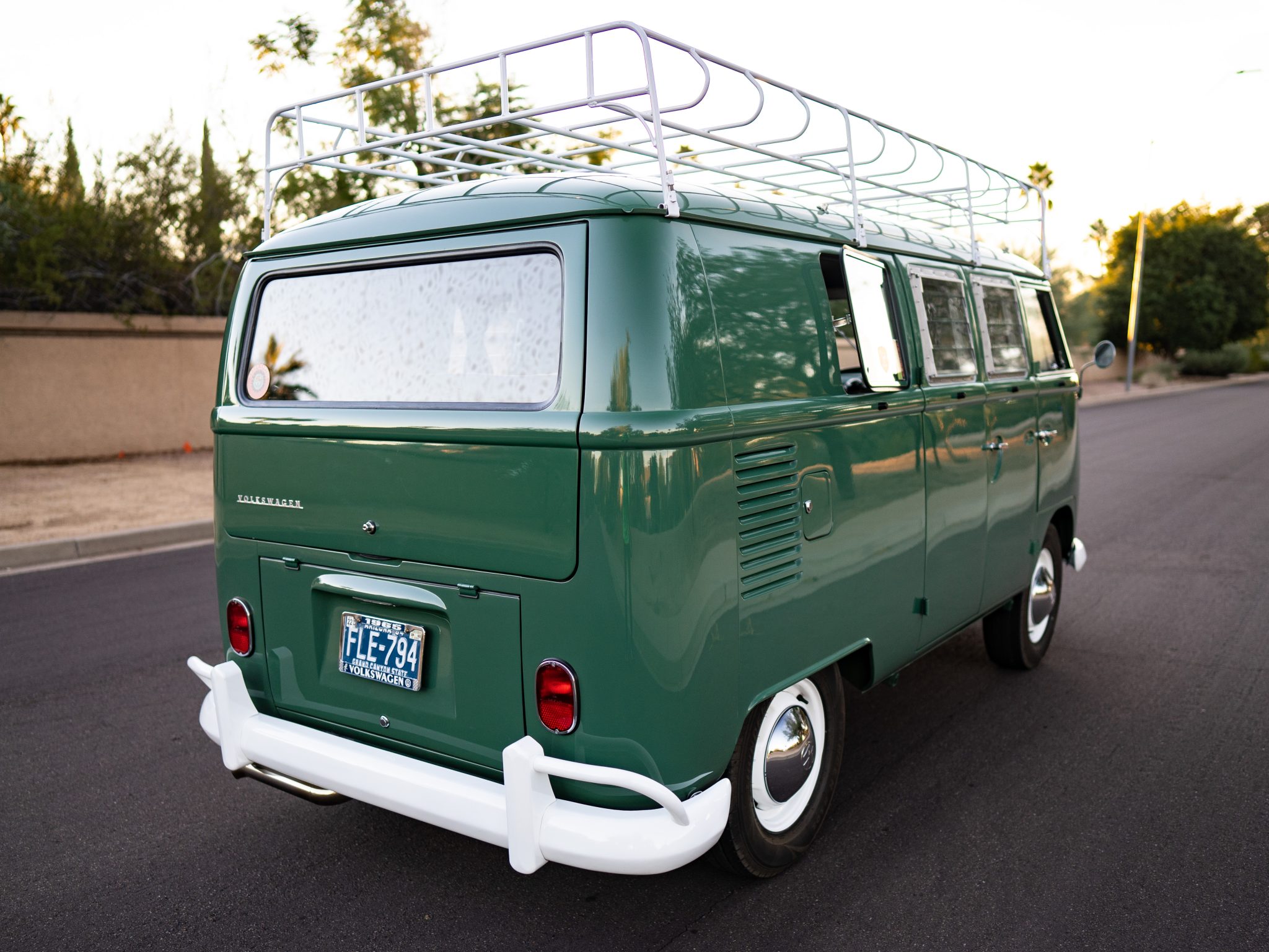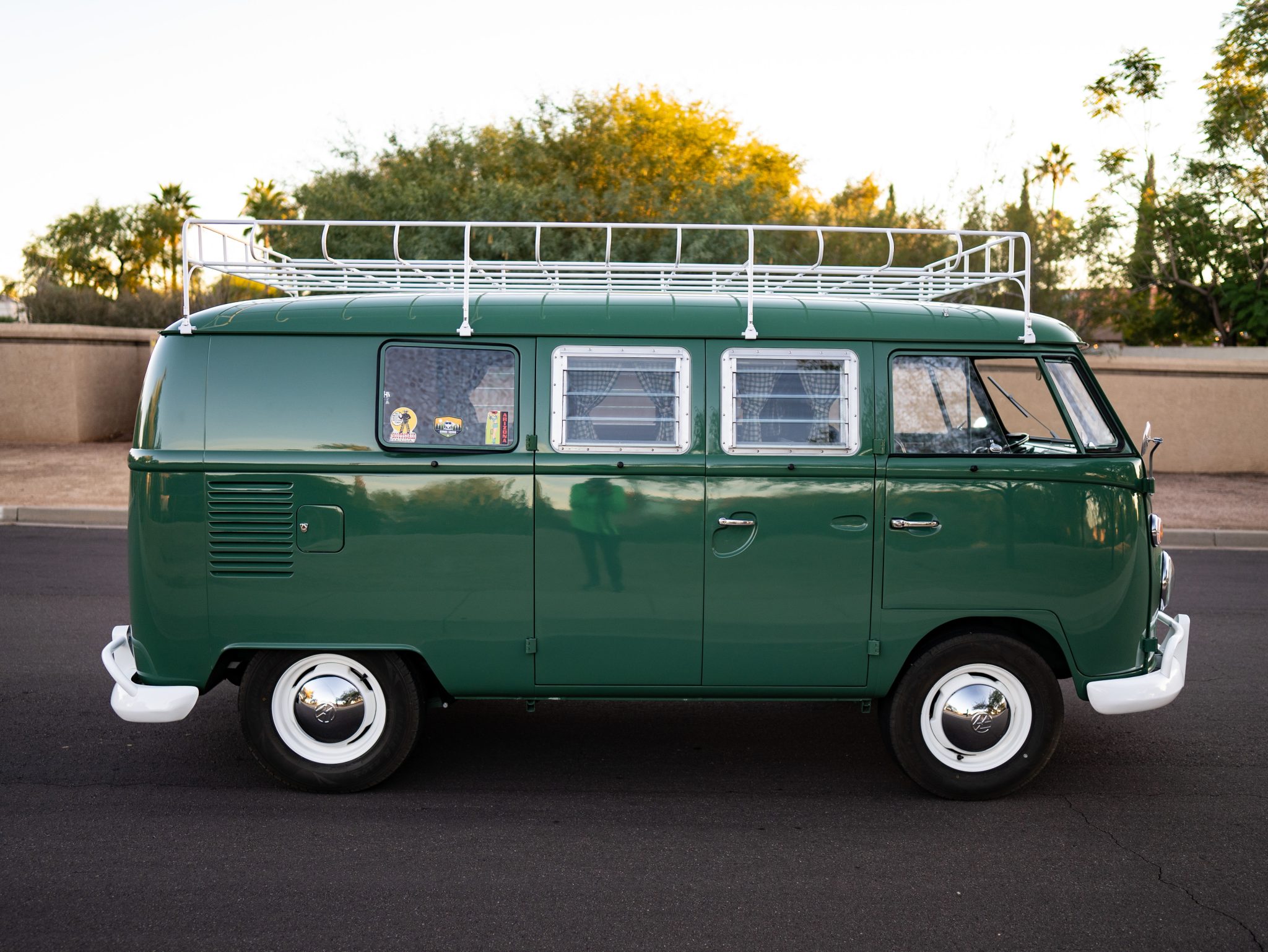 White powder coated 15″ steel wheels wear chrome Volkswagen hubcaps and are wrapped in Thunderer Ranger R101 tires. Work performed under previous ownership included rebuilding the suspension components and installing front disc brakes and a dual-circuit master brake cylinder along with powder coating suspension components.