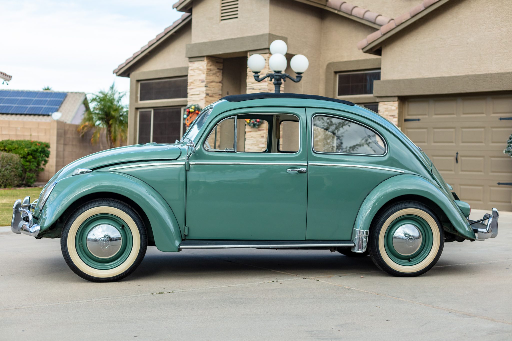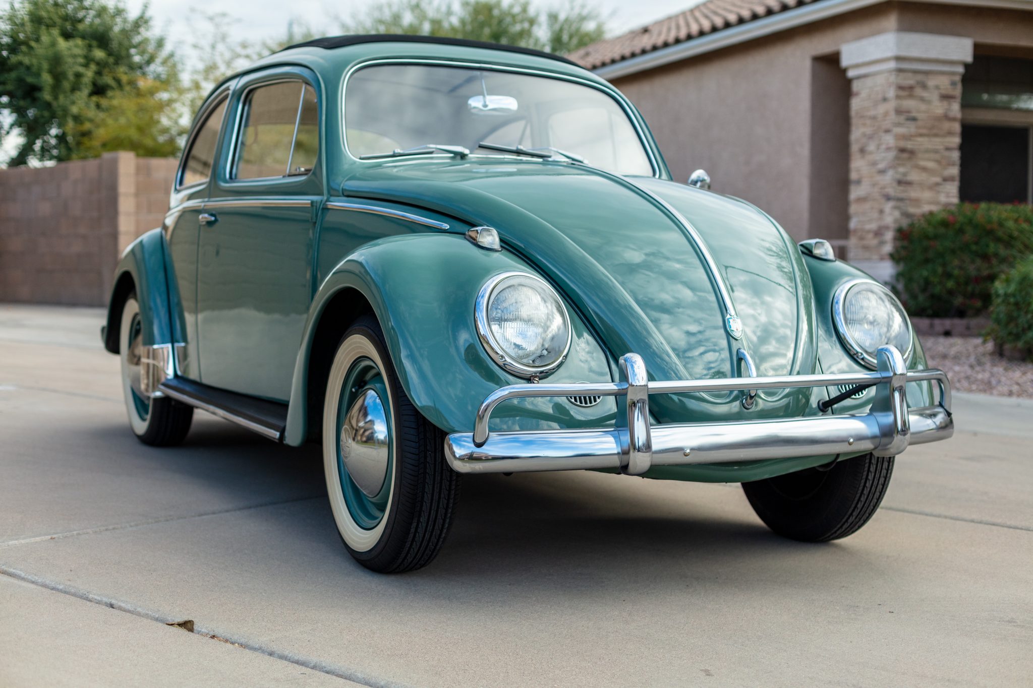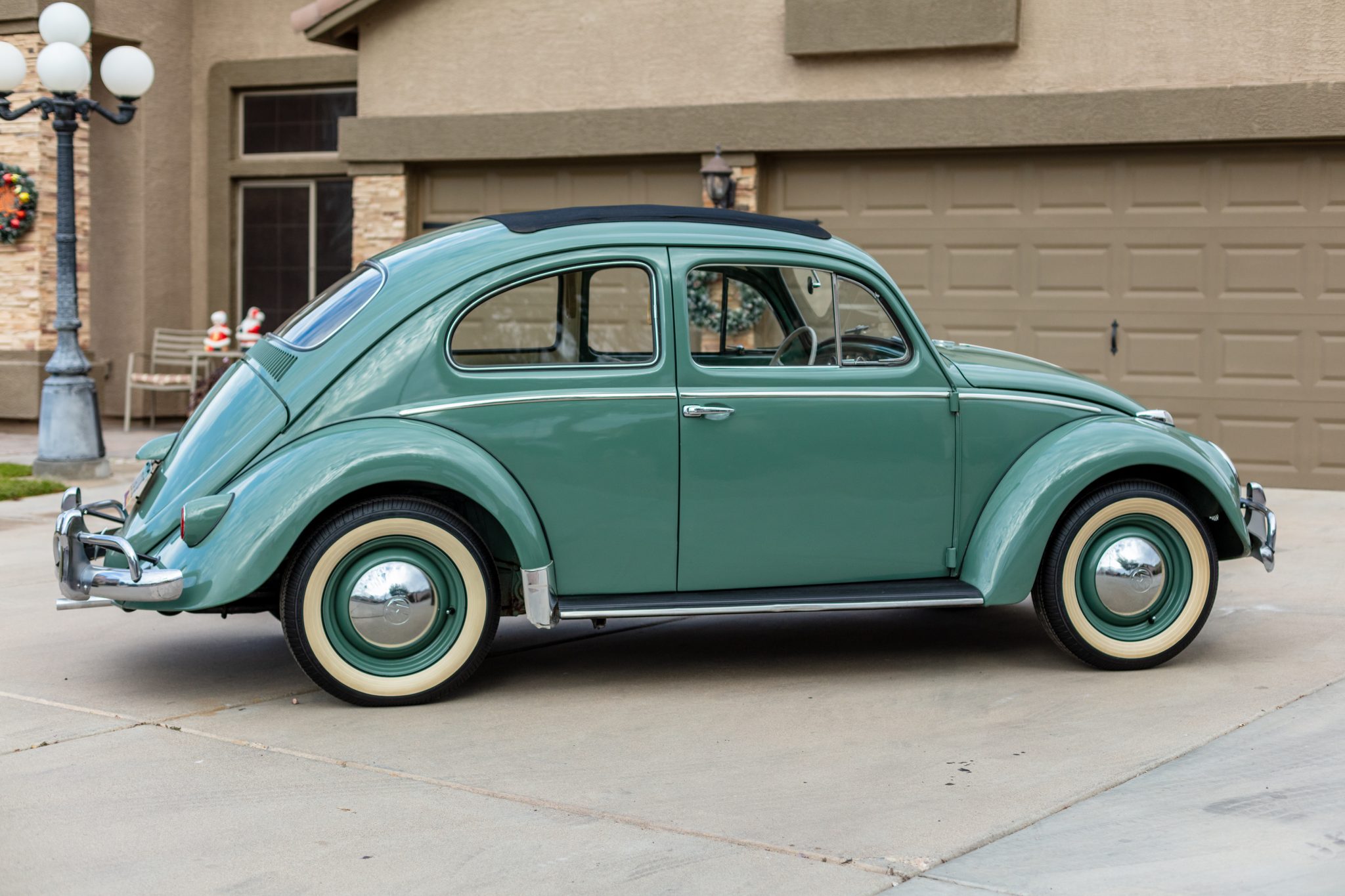 Body-colored 15″ steel wheels wear chrome VW hubcaps and wide-whitewall radial tires that were reportedly mounted under current ownership. Additional work included installation of new braking components and shocks.
