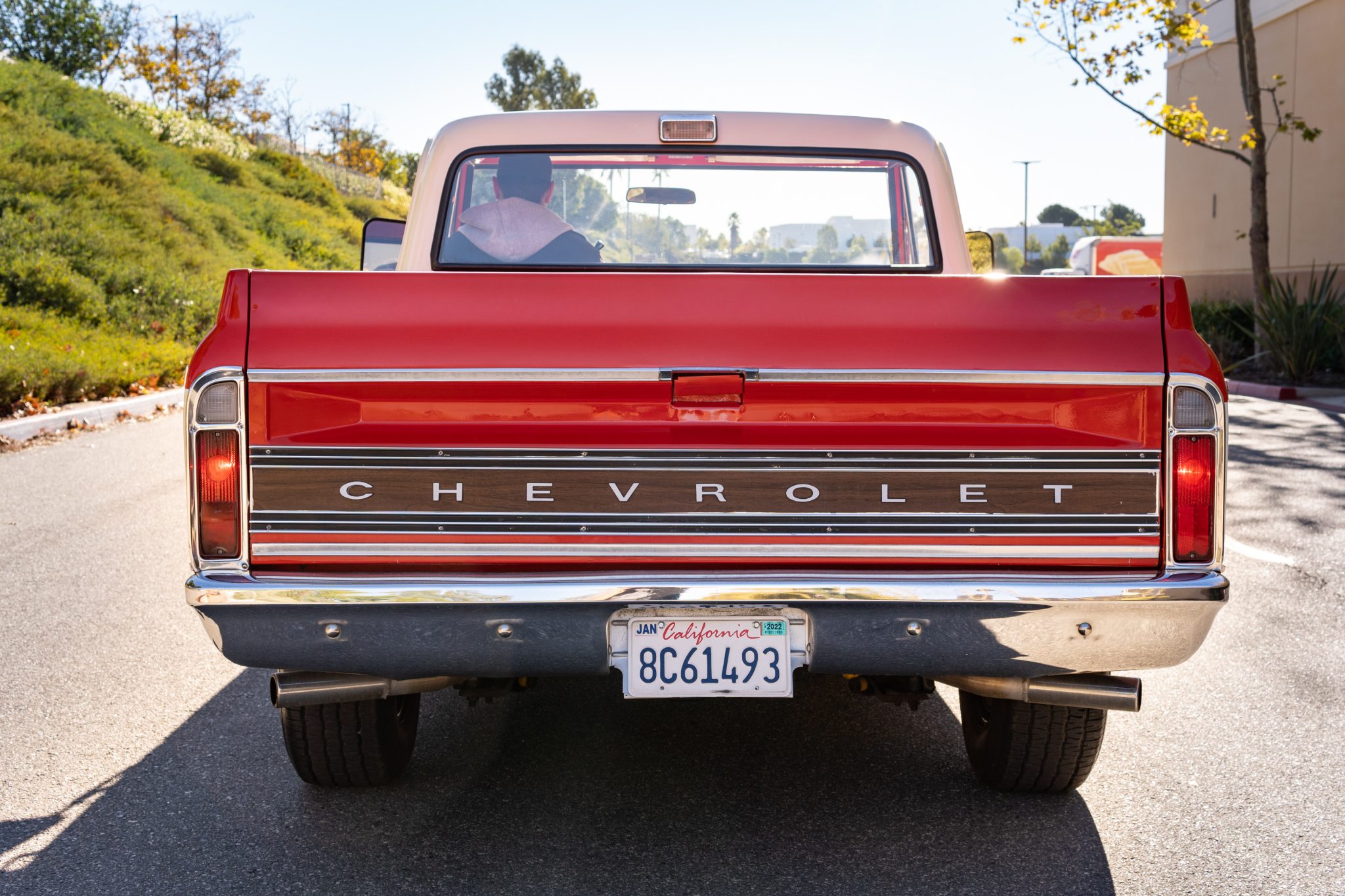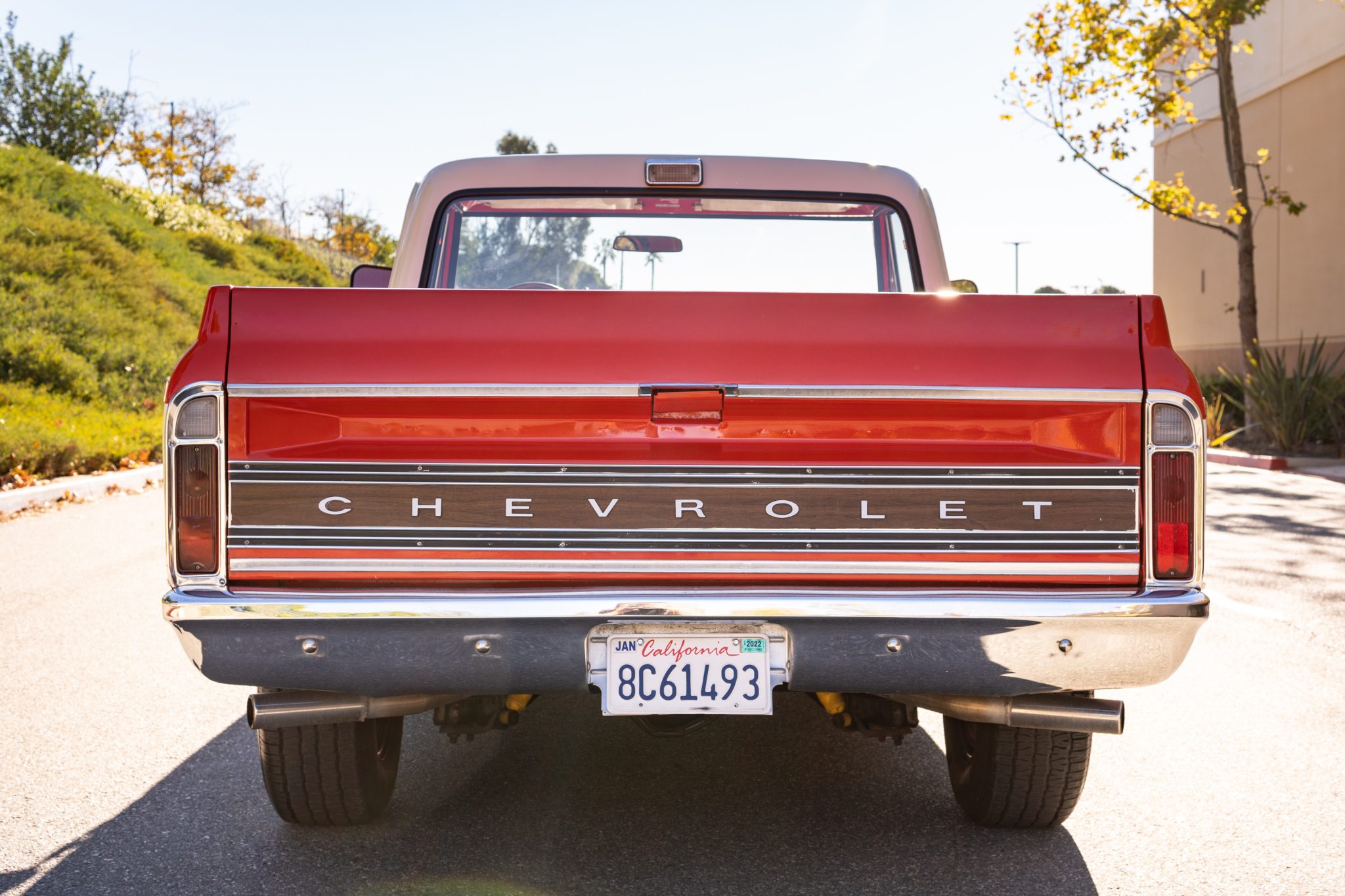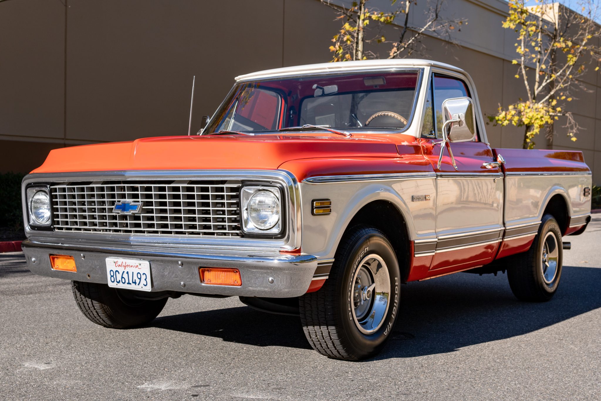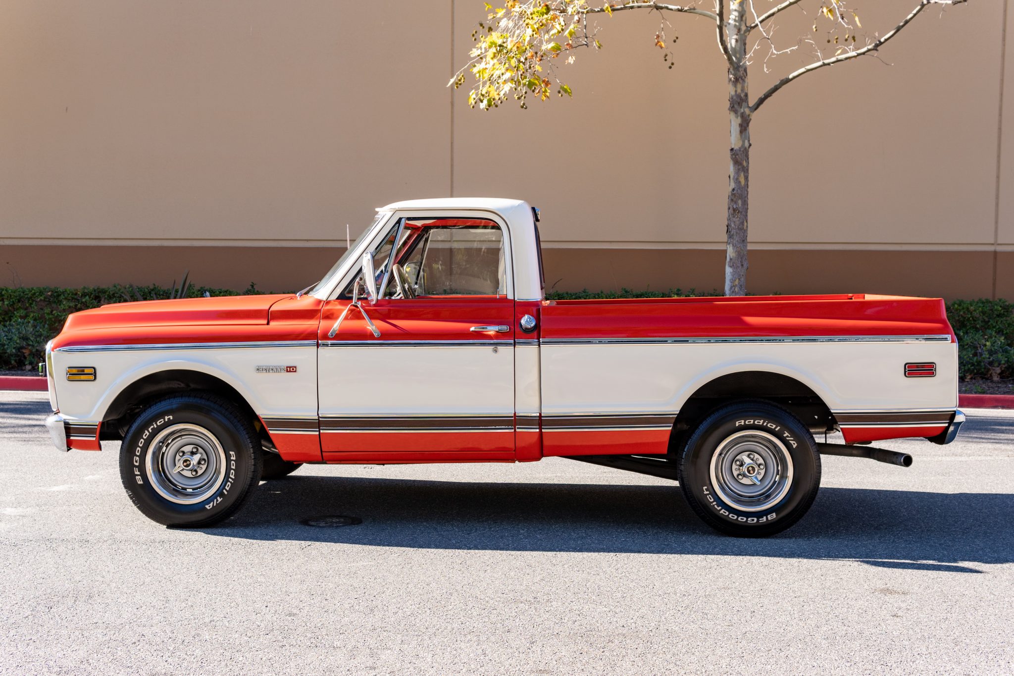 Rally-style 15″ wheels have polished trim rings and knockoff-style centers and are mounted with 255/70 BFGoodrich Radial T/A tires all around.