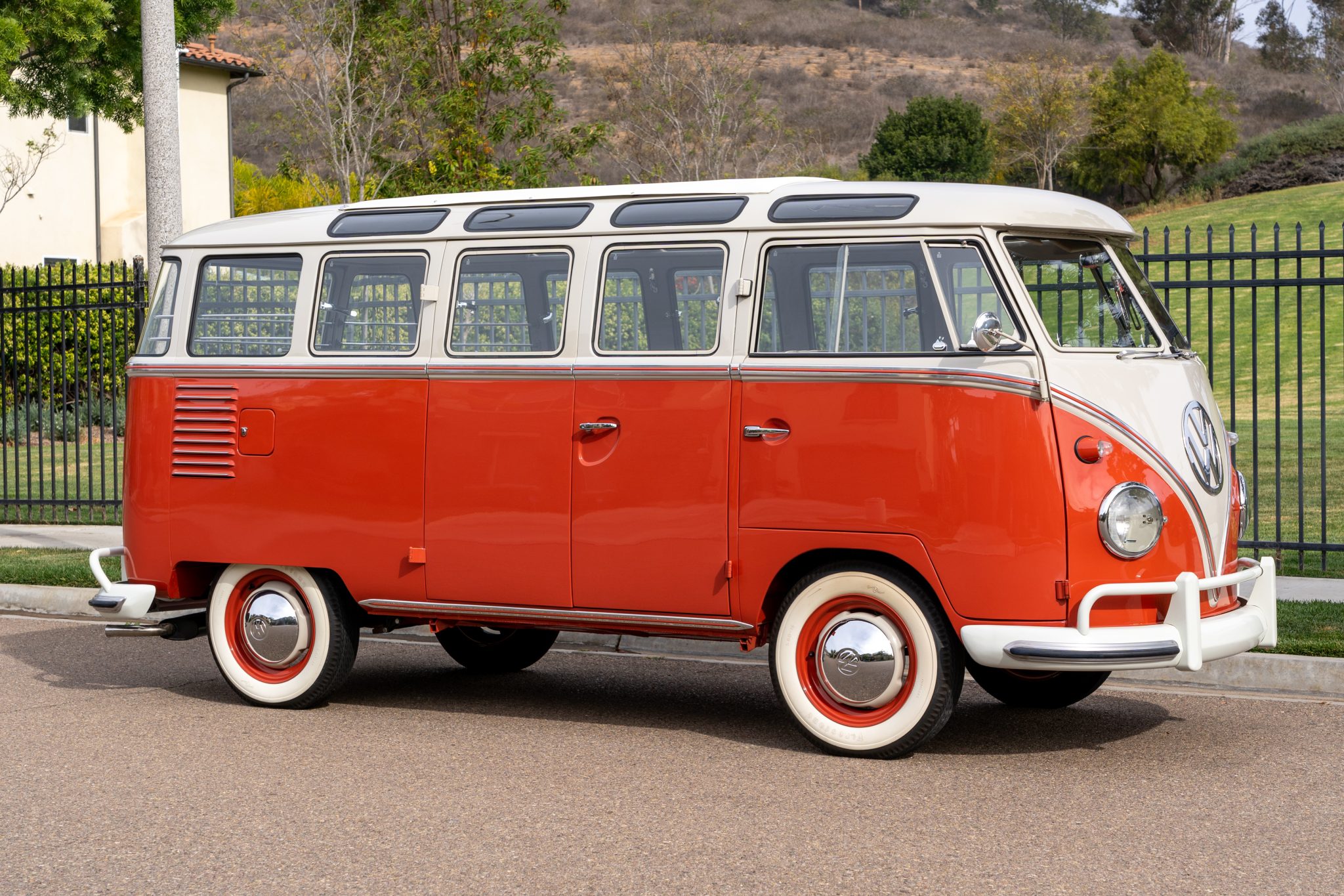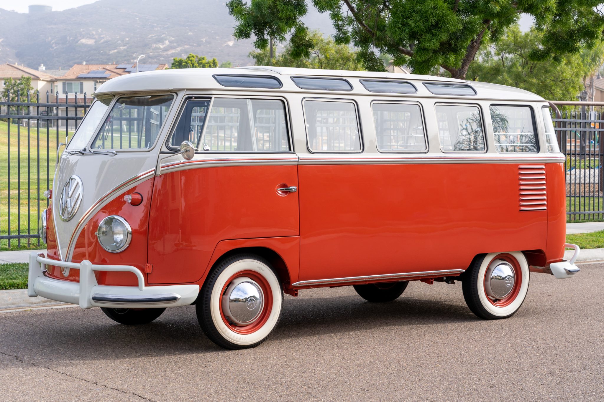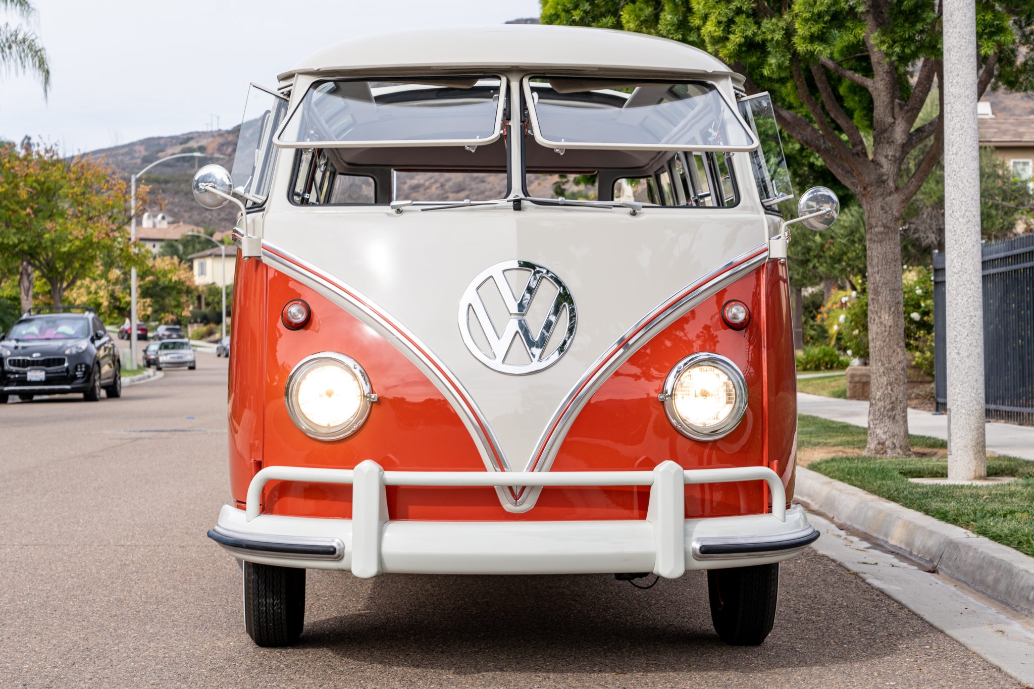 Body-color 15″ steel wheels wear bright VW-stamped hubcaps and are mounted with 5.60-15 Firestone Gum-Dipped whitewall tires. Wilwood disc brakes have been installed at each corner.
