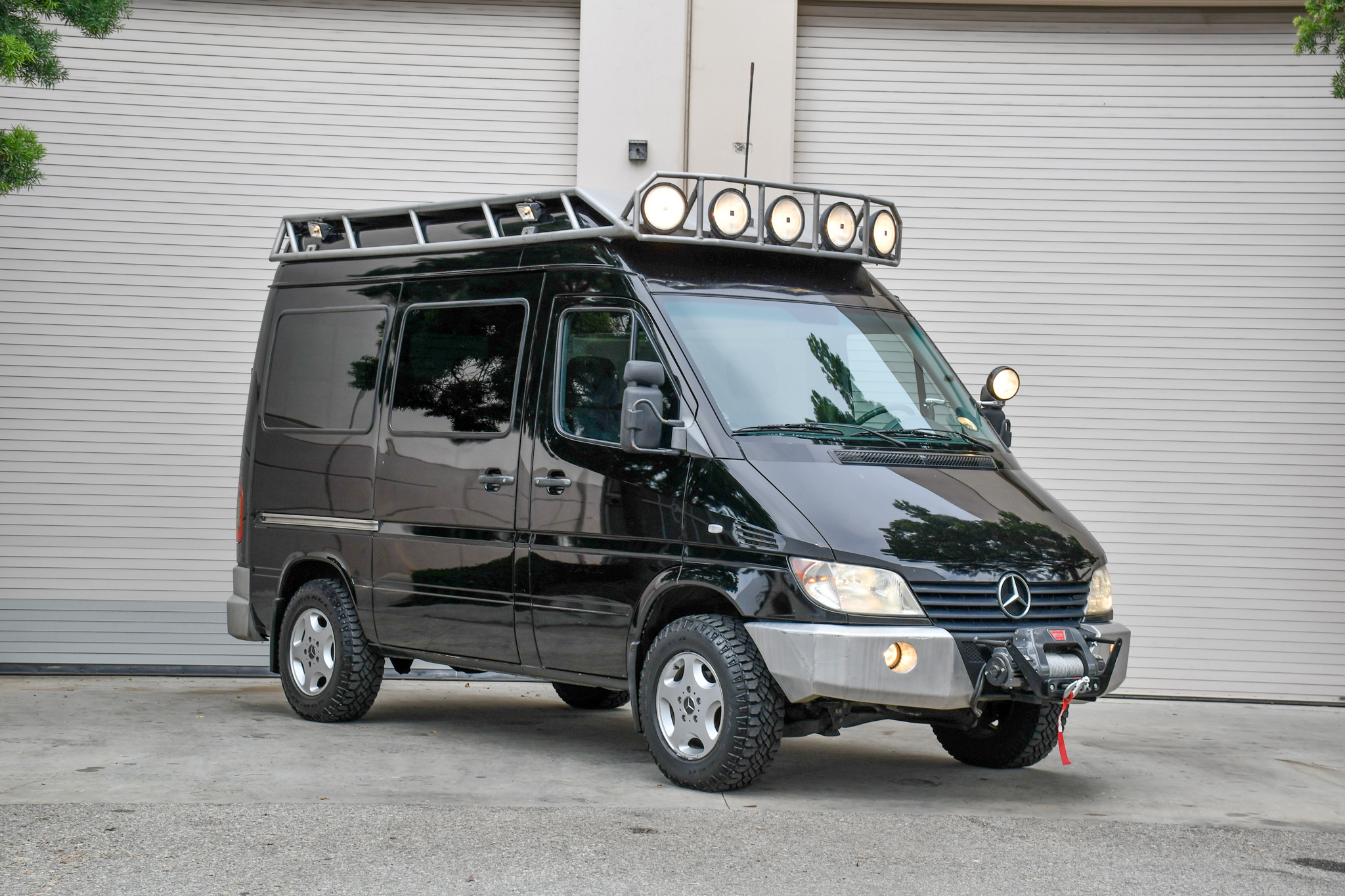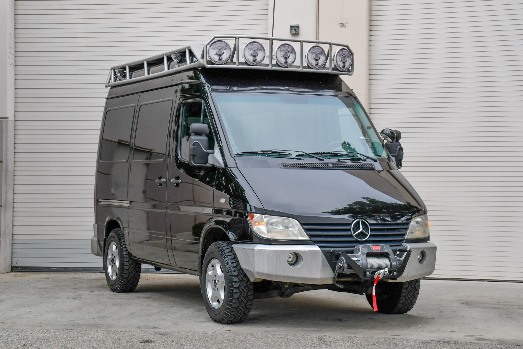 16″ five-hole wheels were sourced from a 1996 G320 and are wrapped in 225/75 Goodyear Wrangler Duratrac tires. The van is fitted with a VanCompass Scout 2” front suspension lift and Bilstein shocks at all four corners. Braking is handled by four-wheel discs.