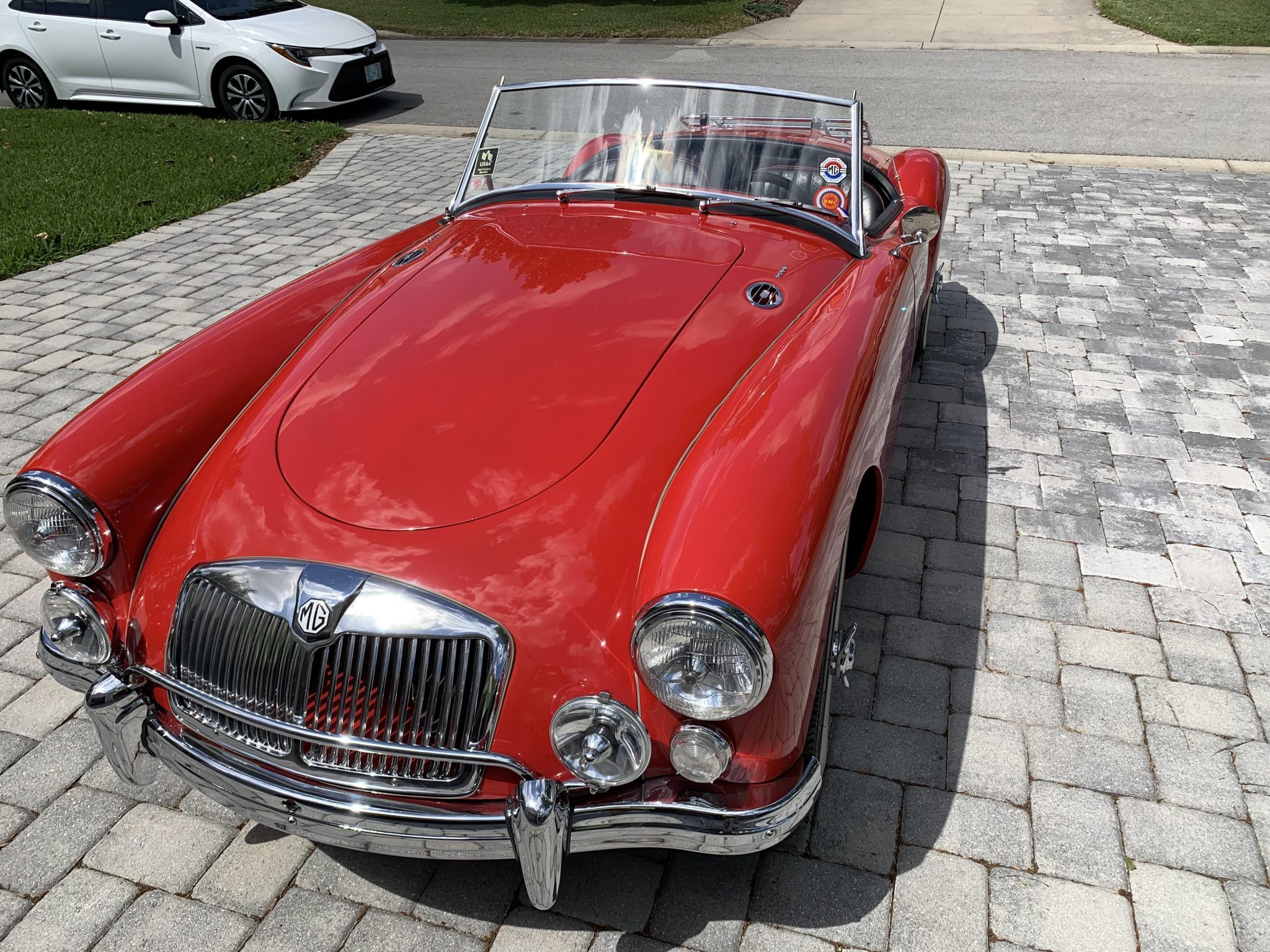 Chrome-finished 15″ knock-off wire wheels wear 165-width Coker Classic wide whitewall tires. A painted wire wheel is mounted inside the trunk. Braking is handled by four-wheel discs with red calipers.