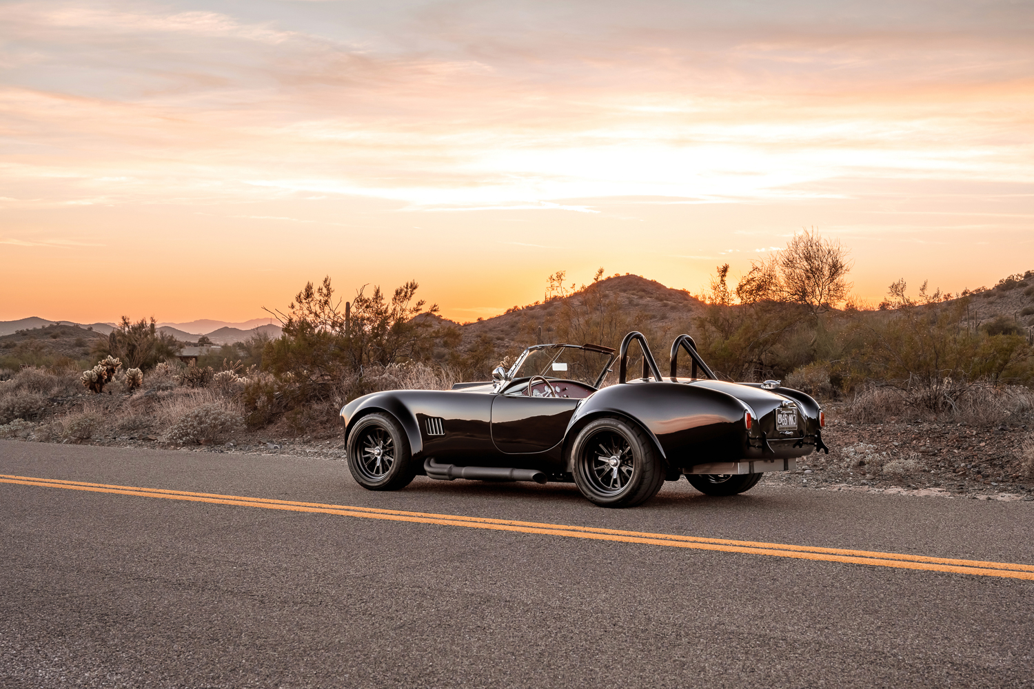 Staggered-width 17″ PS Engineering wheels finished in black are secured with three-ear safety knock-offs, and they are mounted with Nitto NT05 tires measuring 255/40 up front and 315/35 in back. The car is equipped with an independent rear suspension system, height-adjustable Bilstein coilovers, and Vintage Performance Motorcars sway bars, while braking is handled by four-wheel disc brakes with red-finished front dual-piston calipers from a Mustang Cobra, Thunderbird-sourced rear disc brakes, cross-drilled and slotted rotors, Hawk Performance brake pads, and a Wilwood primary hydraulic cylinder.