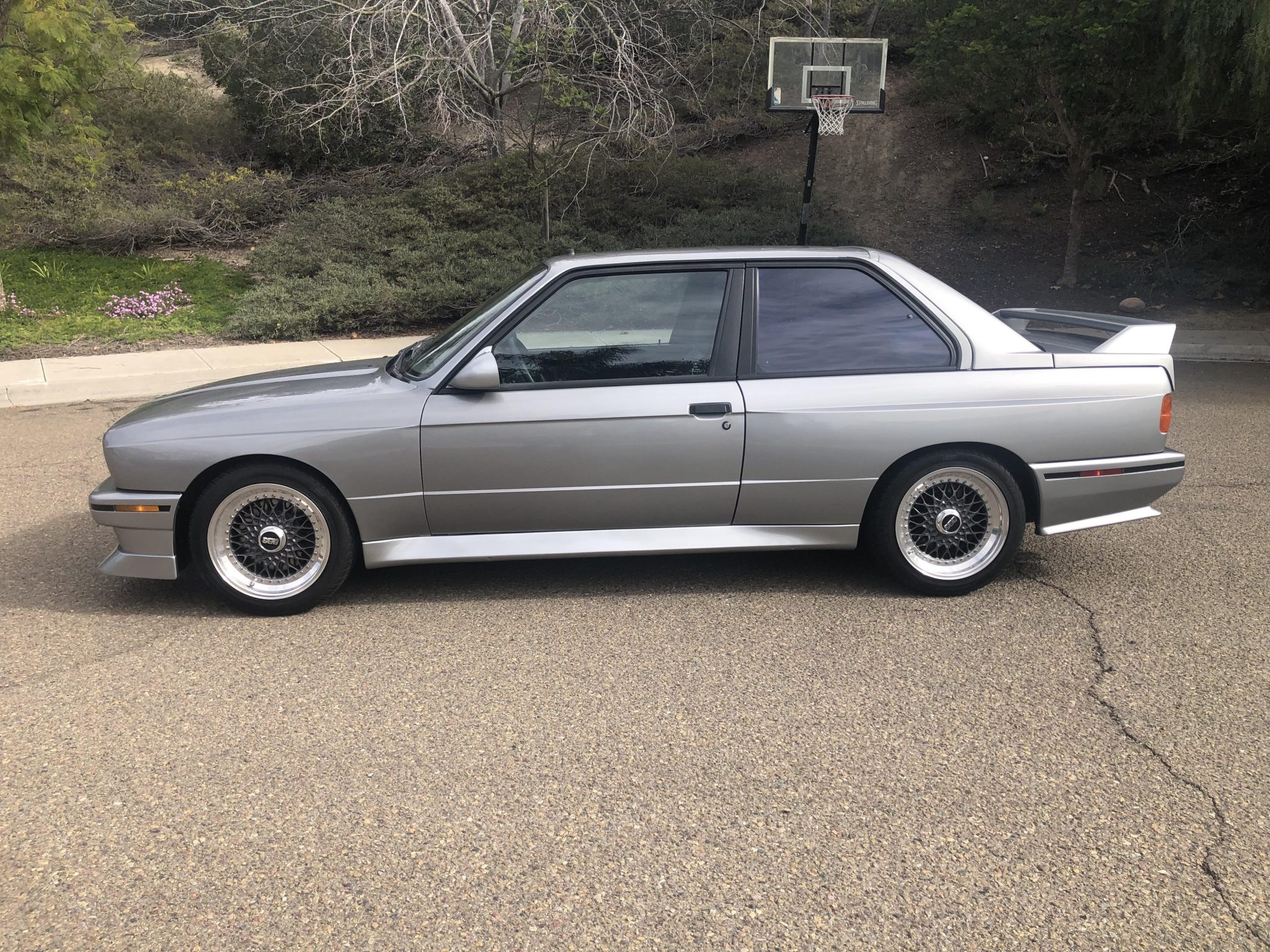 The 16″ BBS RS006 wheels feature gray spokes and polished rims and are wrapped in 225/45 Maxxis Radial MA-V1 tires. The MacPherson strut/semi-trailing arm suspension was revised for the M3 with a thicker rear anti-roll bar as well as shorter and stiffer springs. Modifications include Bilstein shocks and H&R lowering springs. Zimmerman front brake rotors and Textar pads were reportedly fitted in 2018. A spare set of 15″ basketweave wheels and removed springs will accompany the car.