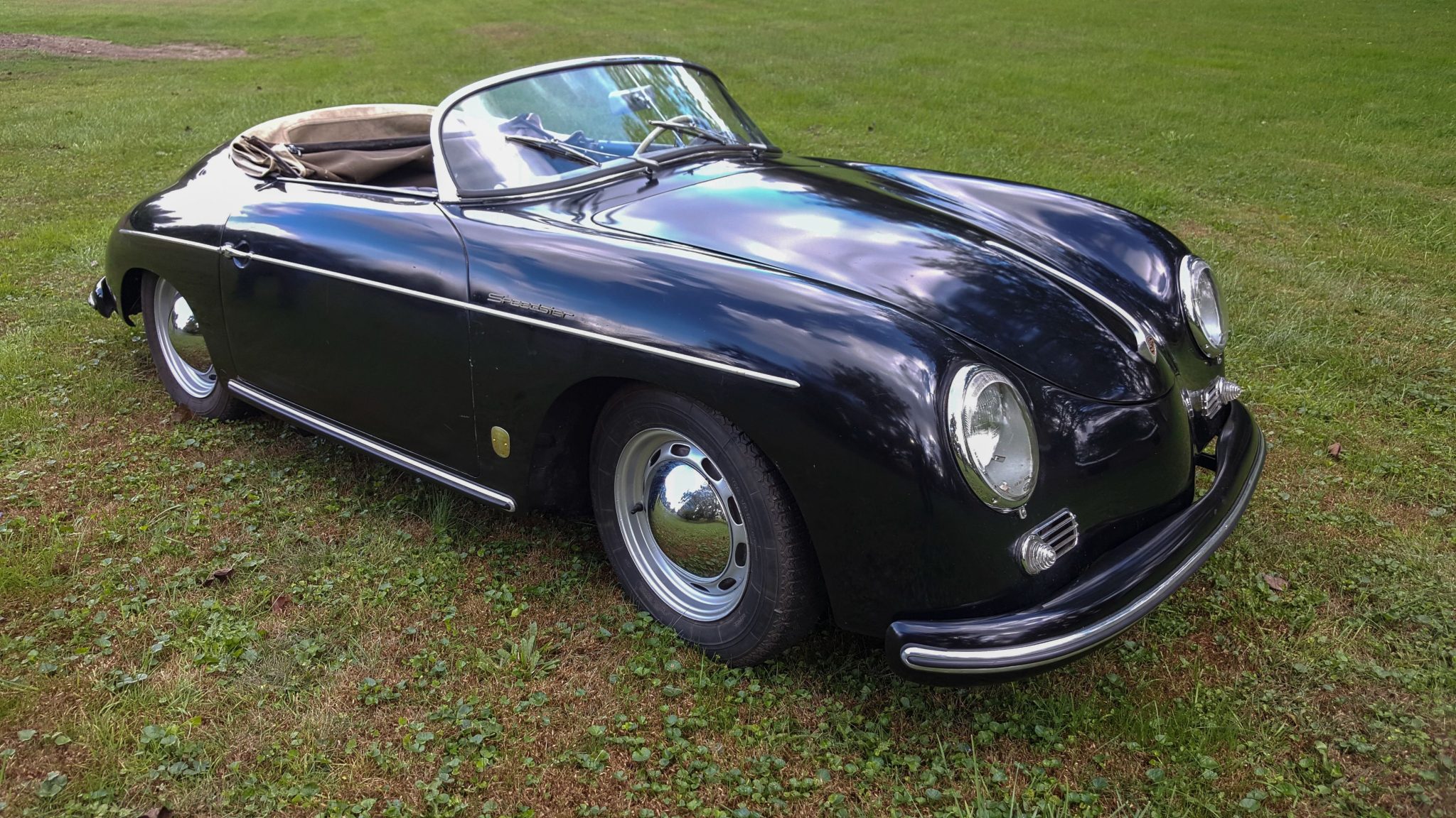 Following the sheet metal repairs, the body was repainted in black lacquer in lieu of the car’s original shade of red. Various chips, cracks, and other imperfections in the finish are shown up close in the gallery below. Exterior features include quadruple-beehive taillights, square-edge door handles, body-color bumpers without overriders, gold lettering, a Reutter badge riveted to the right-front fender, and a cream soft top with matching side curtains. A 1968 Pennsylvania inspection sticker is retained on the windshield.
