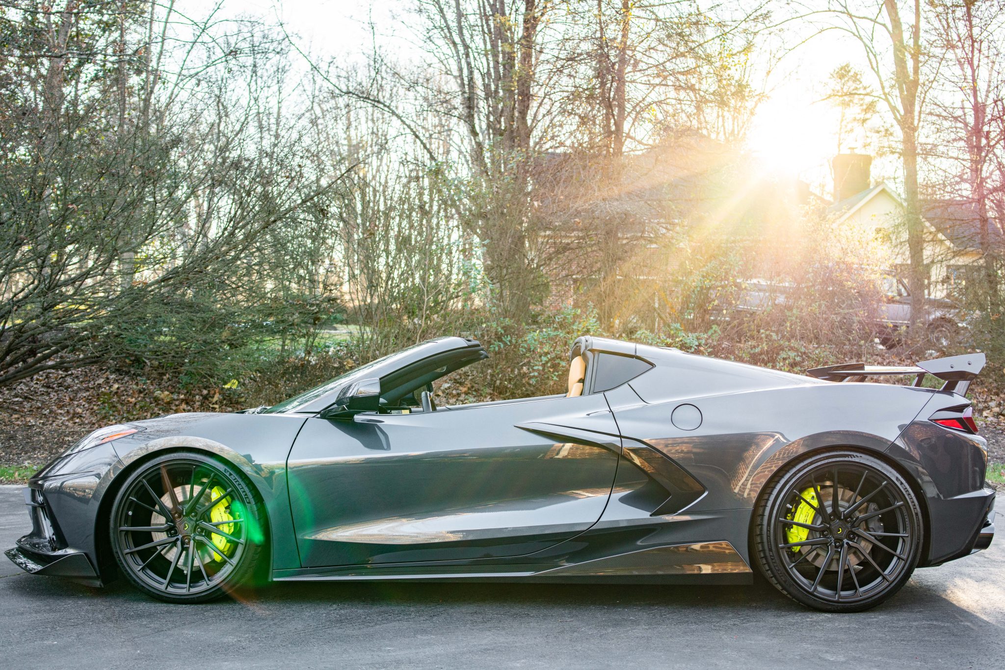 Gray-finish Vossen 20″ and 21″ wheels are wrapped in 245/30 front and 325/25 rear Michelin Pilot Sport 4S tires. The suspension is said to have been modified with ECW coilovers and a four-wheel hydraulic lift system. Green-painted calipers clamp down on larger-diameter rotors specified as part of the Z51 package.