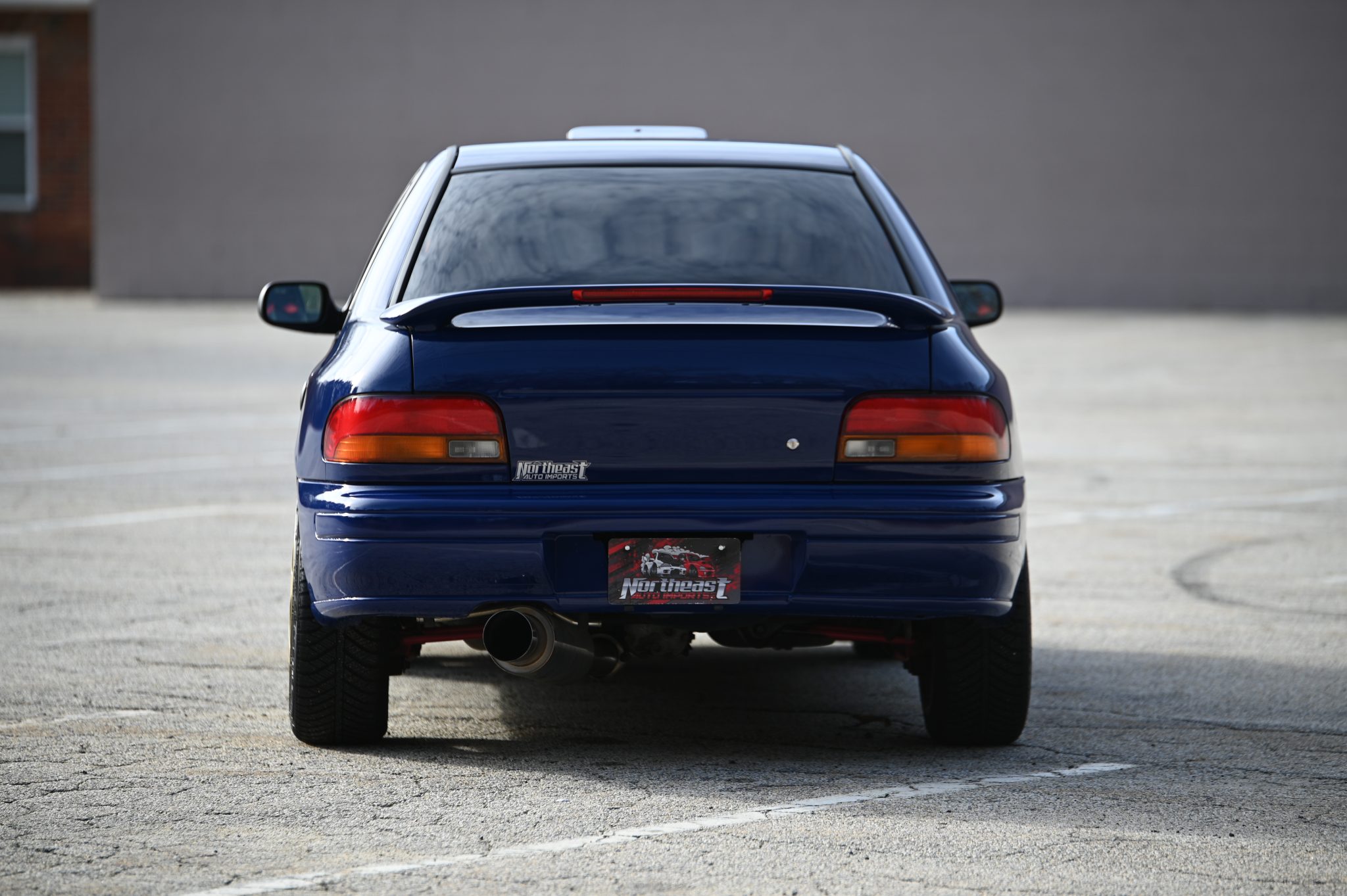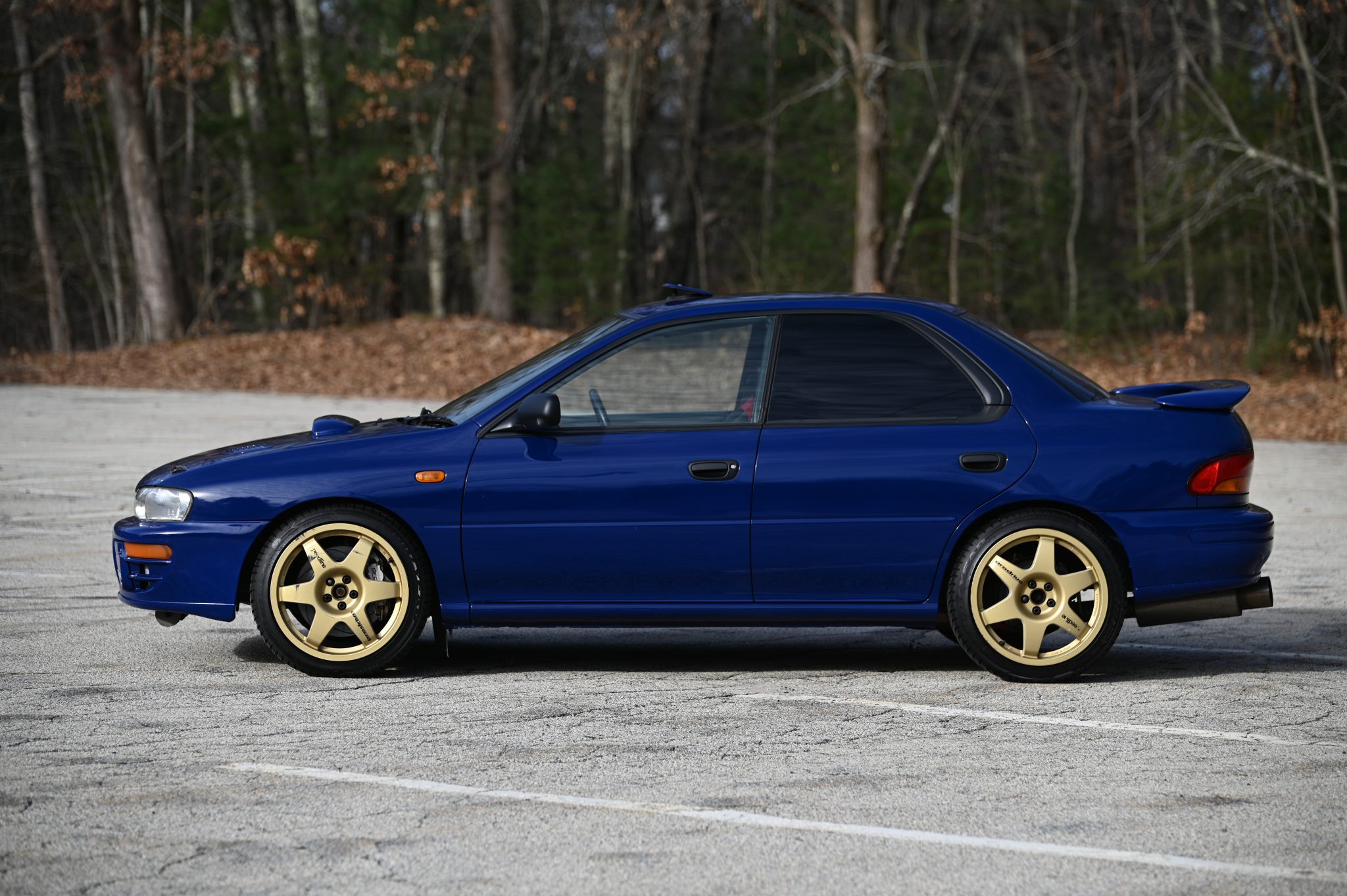 Gold-finished 18″ Speedline alloy wheels are wrapped in 215/45 Goodyear Vector 4Seasons tires. Braking is handled by a Prodrive big brake kit with slotted rotors up front along with factory rear discs. The suspension has been fitted with camber and height-adjustable coilovers and a carbon fiber strut tower brace. Curb rash on one of the wheels is visible in the gallery below.