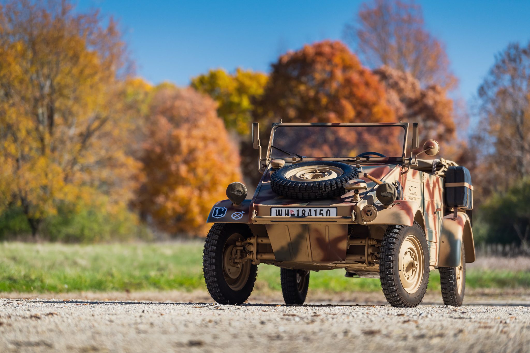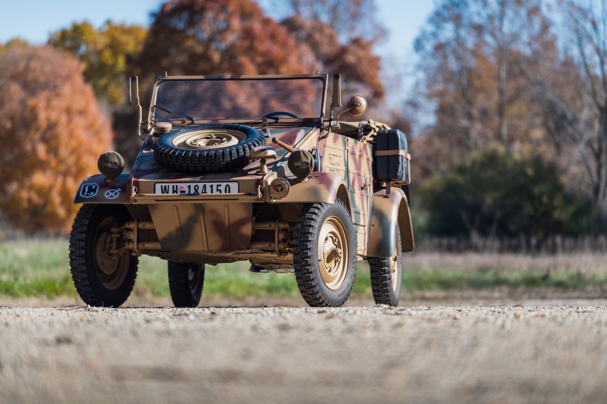 The refurbishment performed by Dave Crompton in Clio, Michigan, between 2015 and 2016 included repairs to several of the body’s steel panels prior to a repaint in Wehrmacht beige. Metal work entailed welding repairs, removal of dents and old body filler, replacement of the fenders, and correction of various details to correspond with 1943 specifications. A brown and green camouflage pattern was painted over the exterior of the body, and various period markings were recreated. The seller also added the Panzer Lehr “L” insignia on the front right fender and rear engine lid.