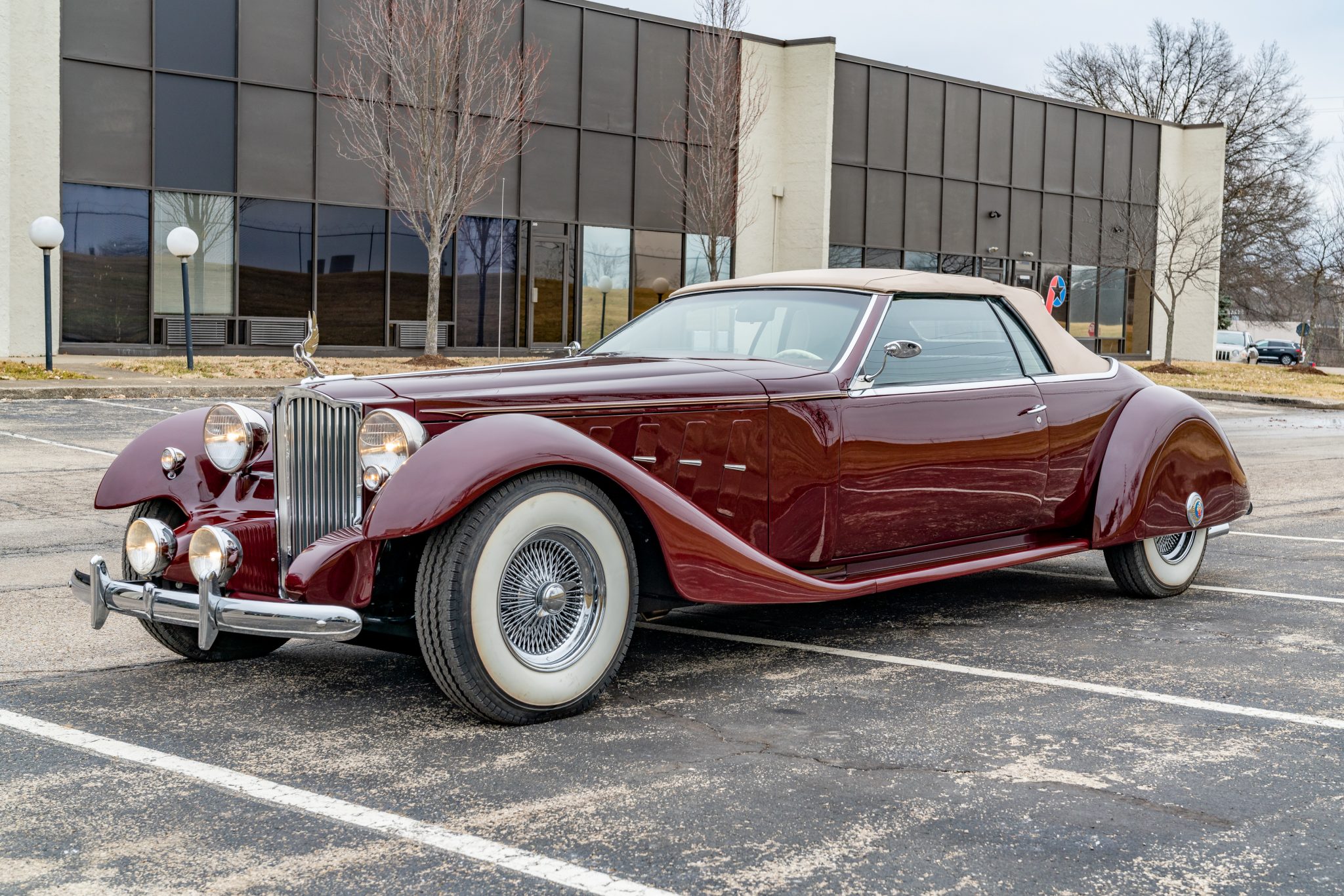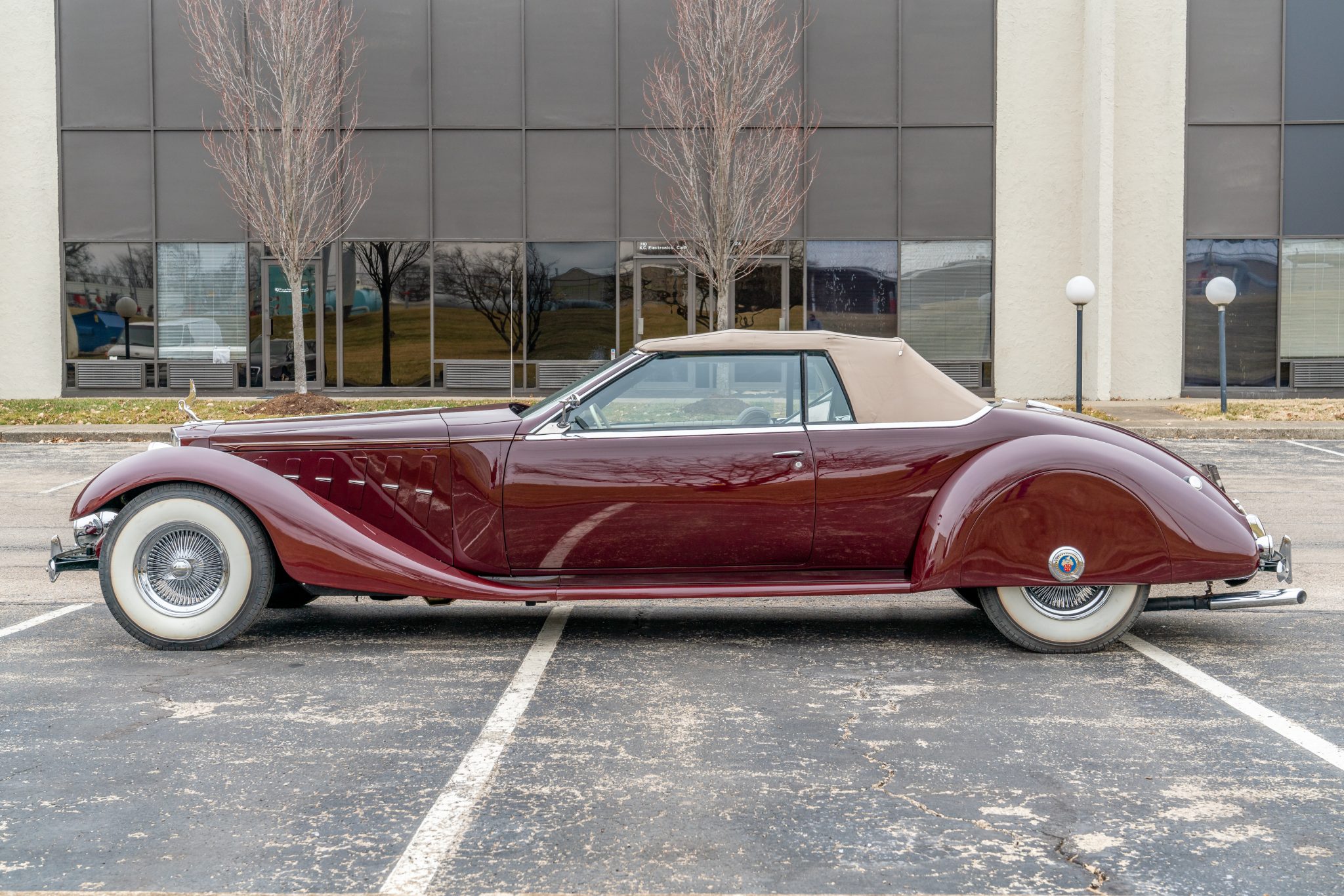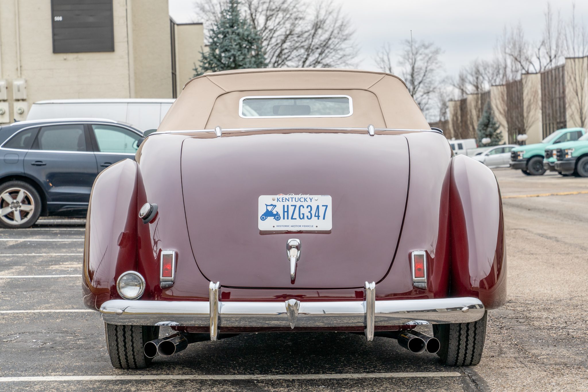 The 16″ chrome wire wheels are secured with two-eared knock-offs and are mounted with T50 Coker Classic whitewall tires. A full-size spare is mounted in the trunk. The car is equipped with power steering, and braking is handled by power-assisted front discs and rear drums.
