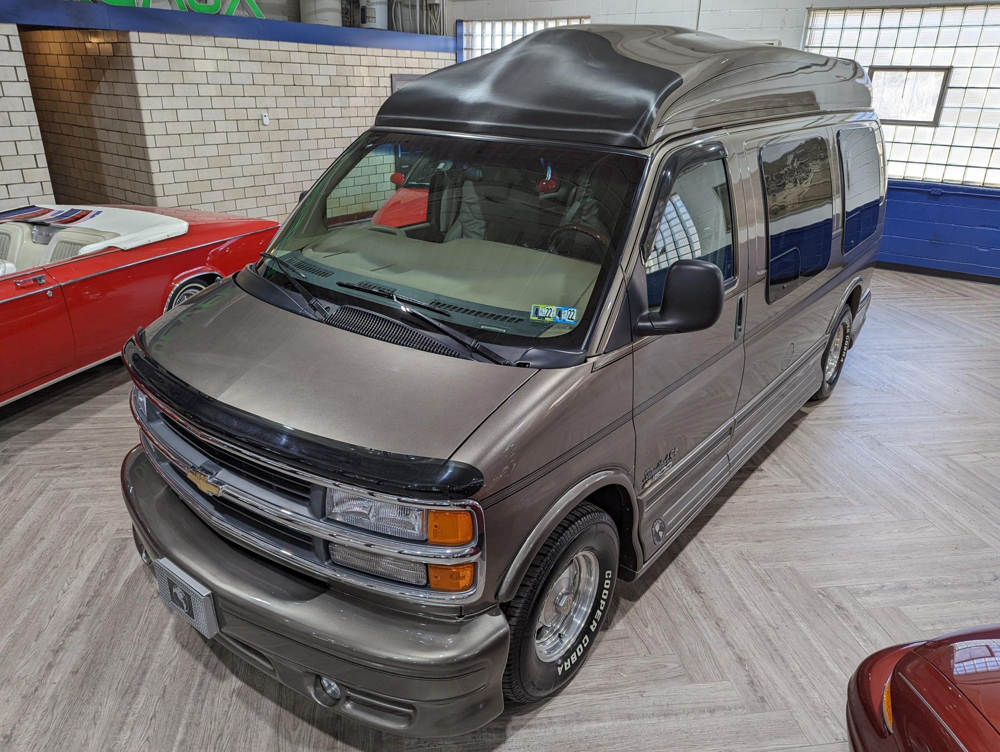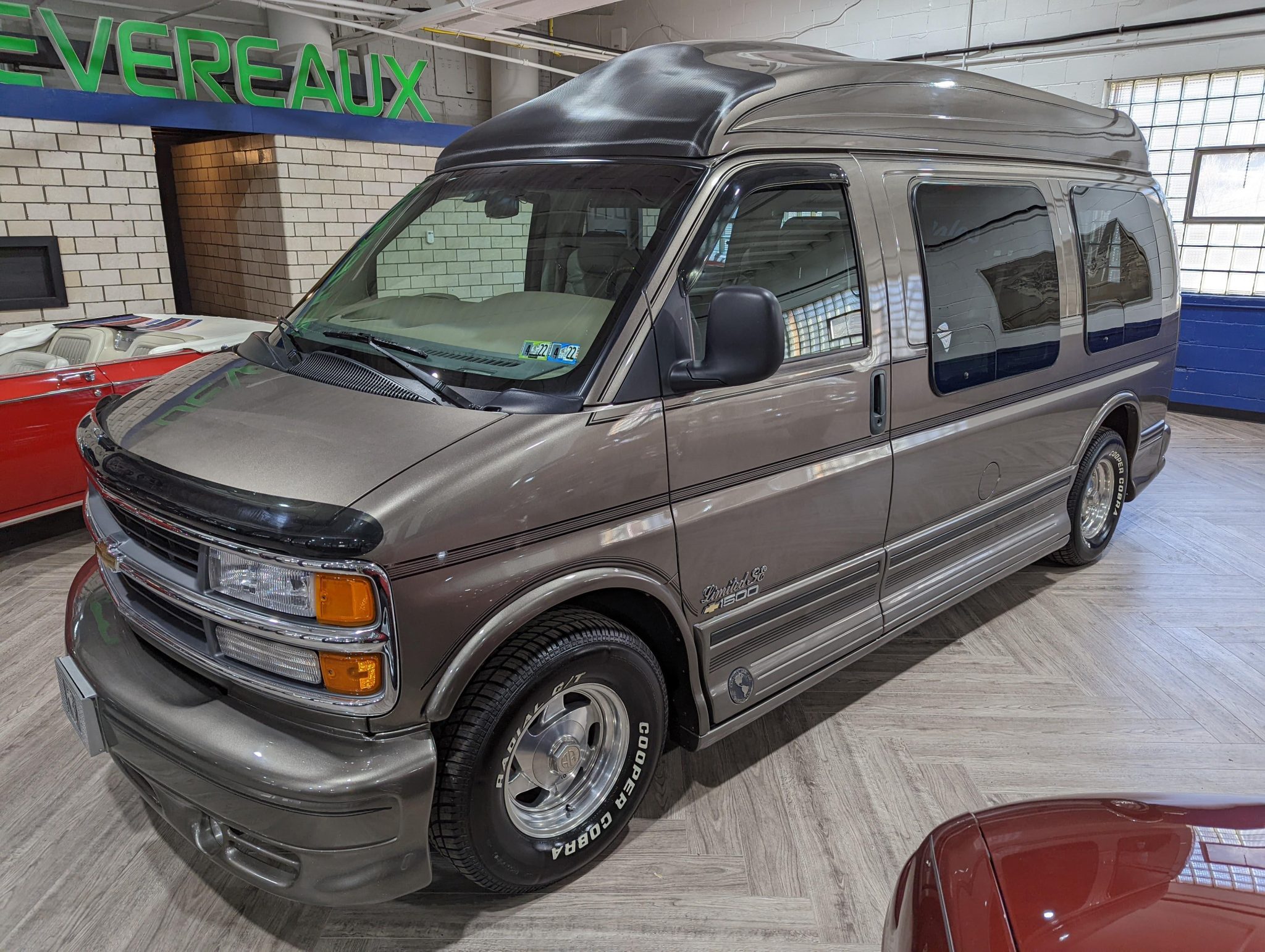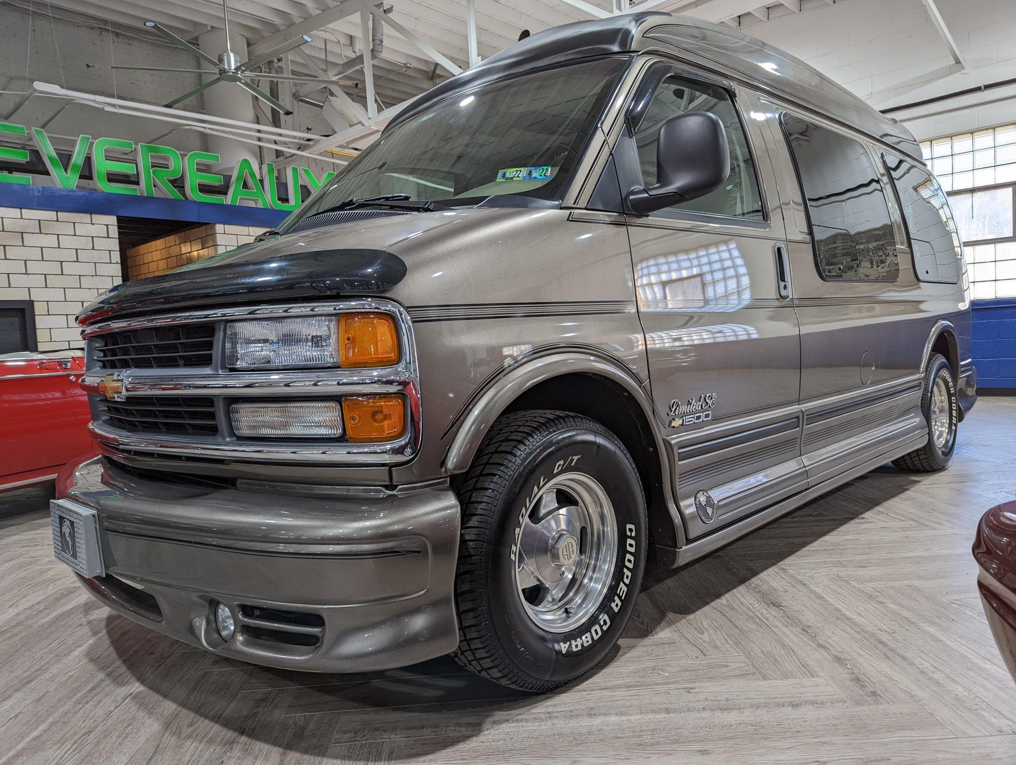 Polished 15″ American Racing alloy wheels wear 255/70 Cooper Cobra Radial G/T tires, and stopping power is provided by front disc and rear drum brakes.