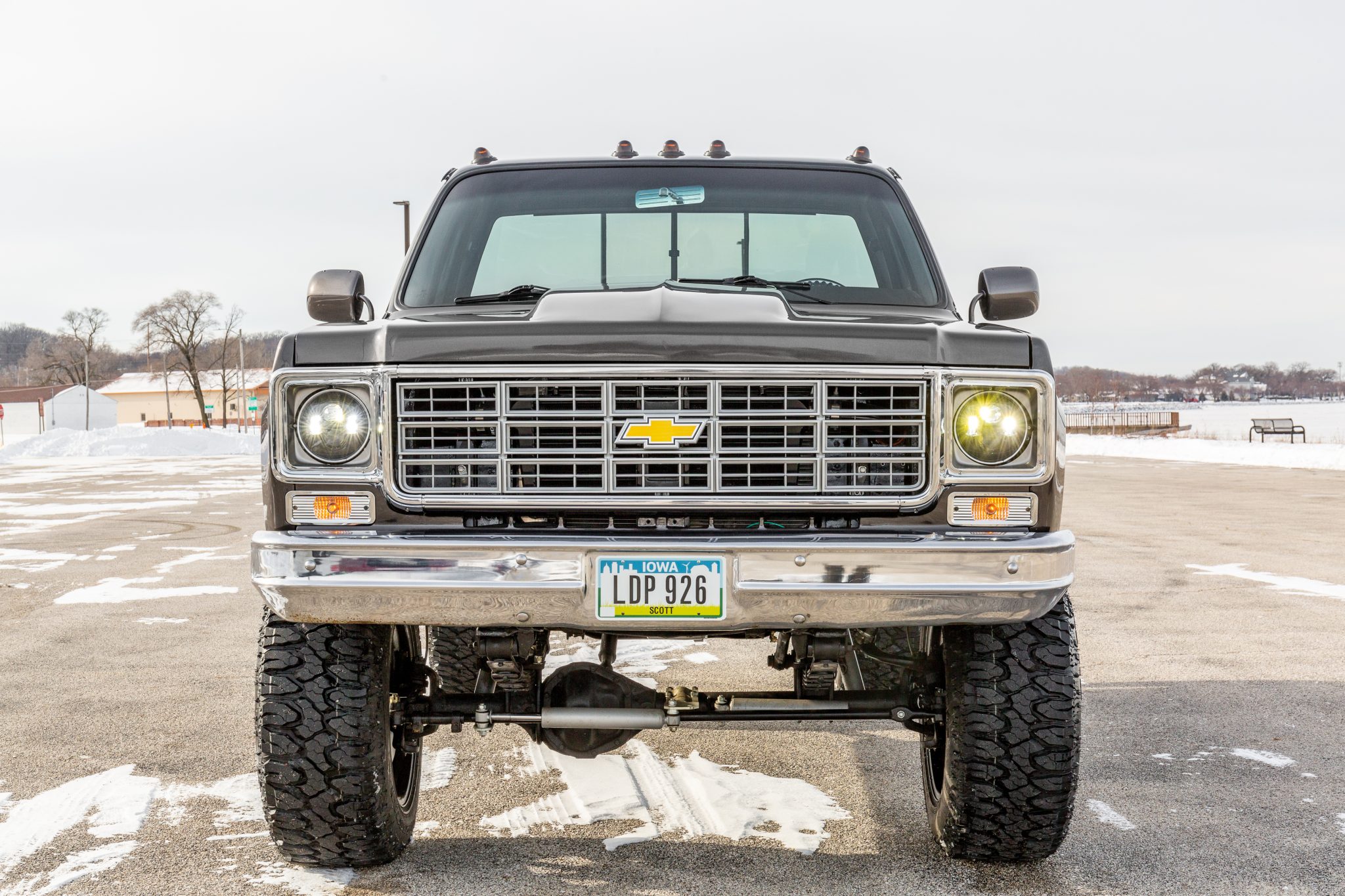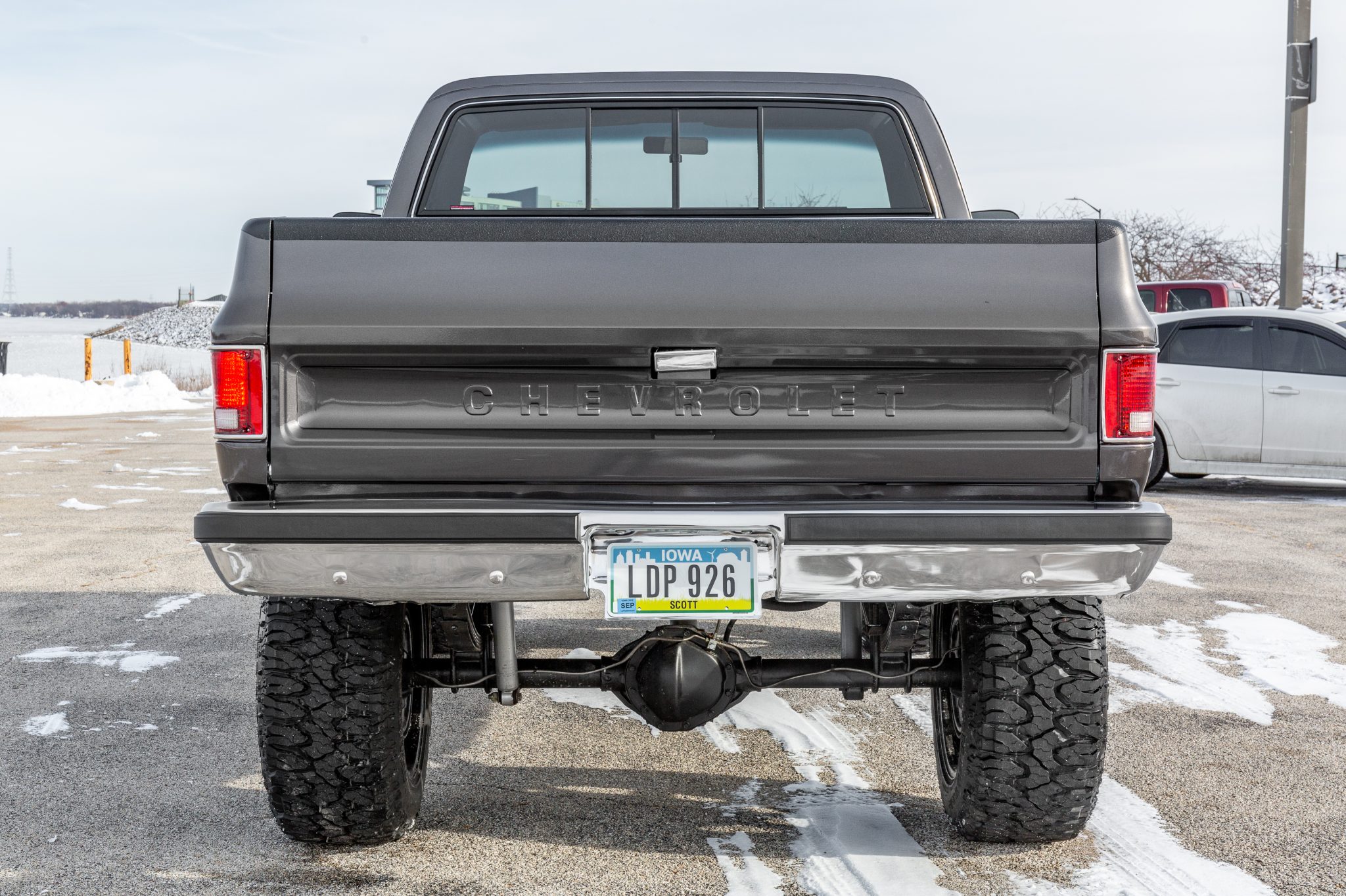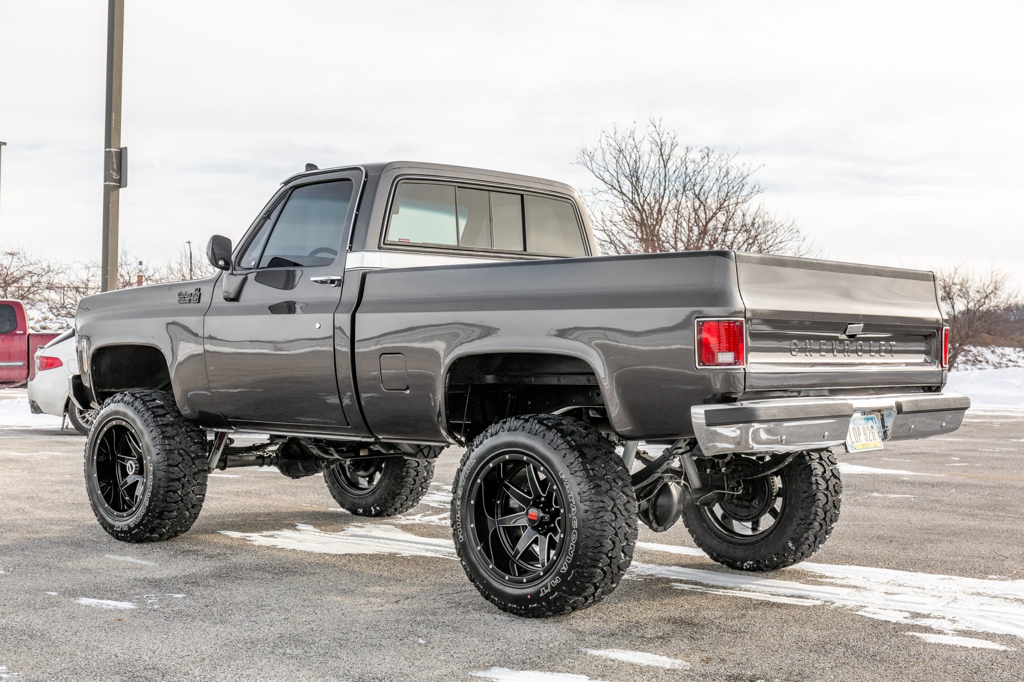 The 20″ Havok H112 wheels are mounted with 35×12.5″ Milestar Patagonia M/T tires. The truck is equipped with a Rough Country 6″ suspension lift kit and power steering, and braking is provided by power-assisted front discs and rear drums. The seller notes the frame was sandblasted and repainted and the suspension was replaced during the refurbishment.