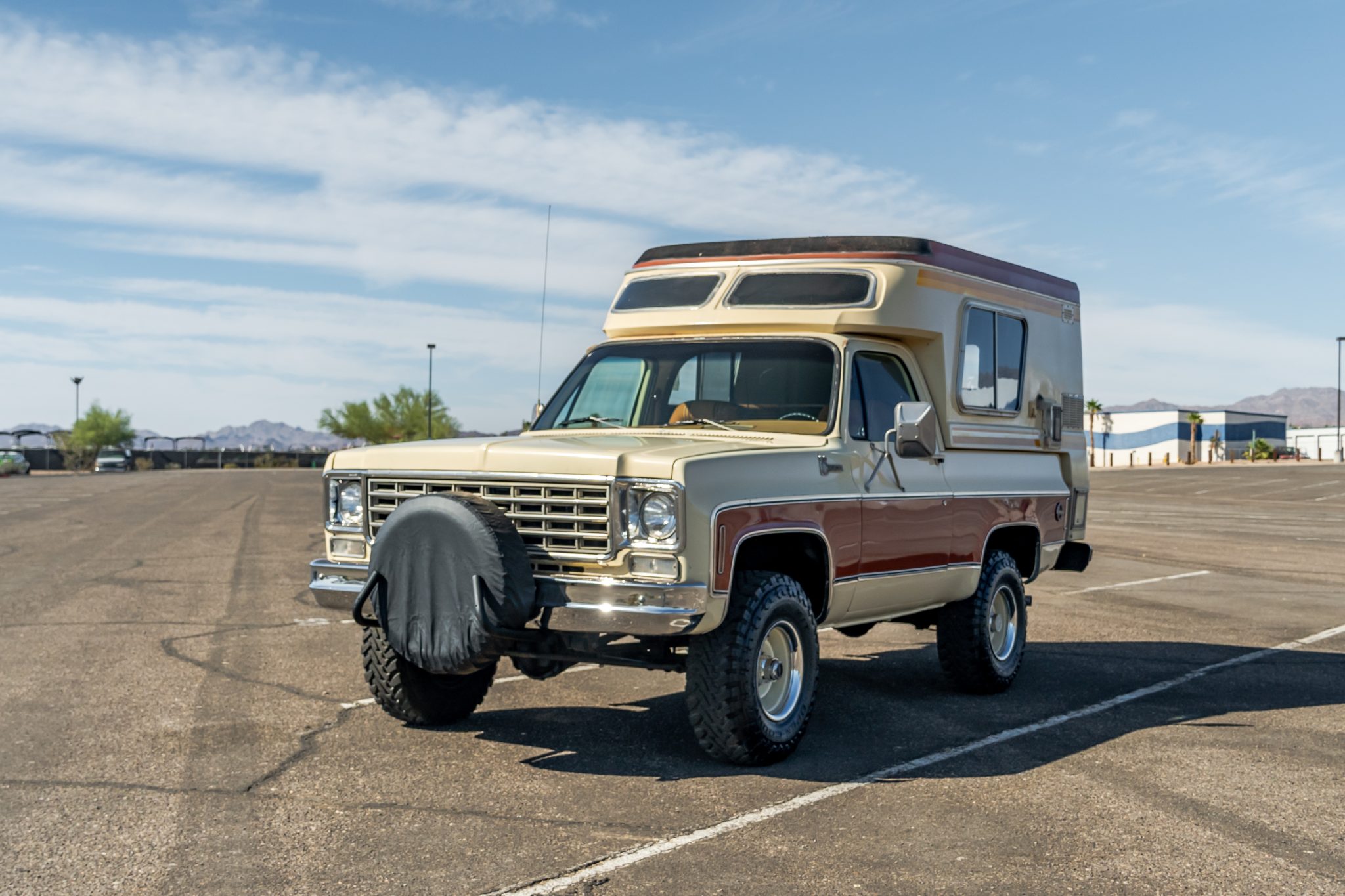 Tan-painted 15″ rally wheels with chrome trim rings wear 33×10.5″ Toyo Open Country M/T tires, and a spare wheel and tire are mounted to the front of the truck. The front axle is equipped with manually-locking hubs. Braking is handled by power-assisted front discs and rear drums.