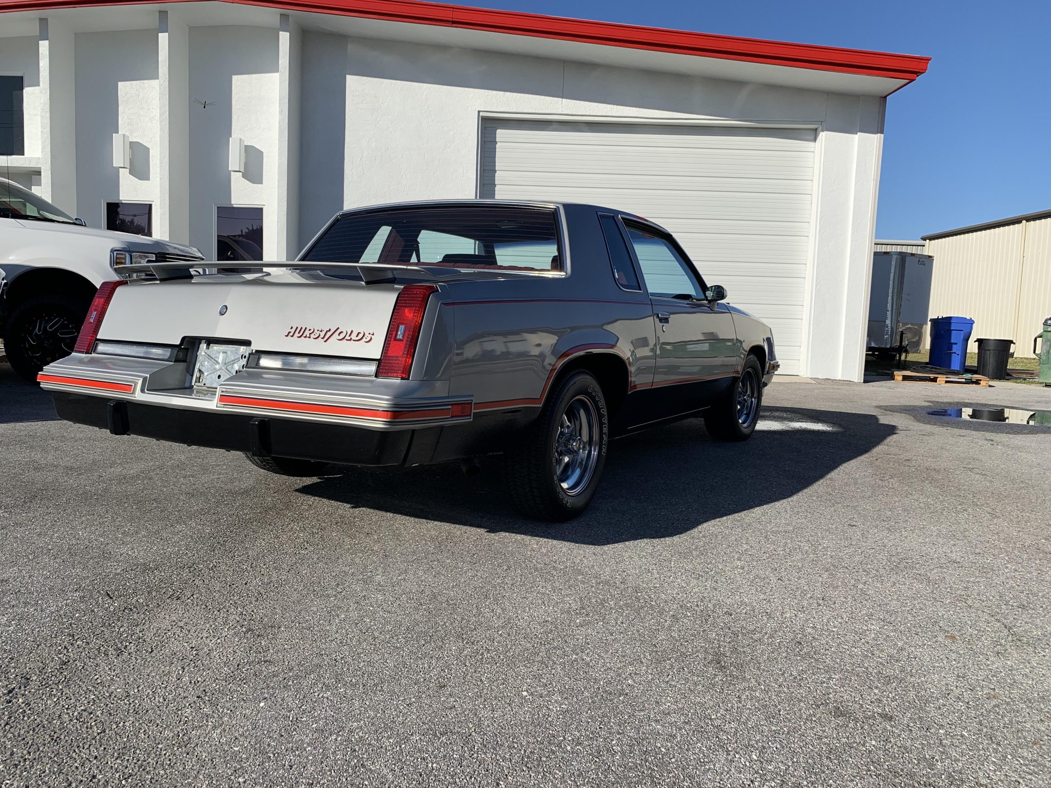 Chrome 15″ wheels feature red pin striping with Oldsmobile-logo center caps and wear 215/65 Goodyear Eagle GT tires. Hurst/Olds 15th Anniversary cars came equipped with power-assisted front disc brakes and heavy-duty suspension from the factory.