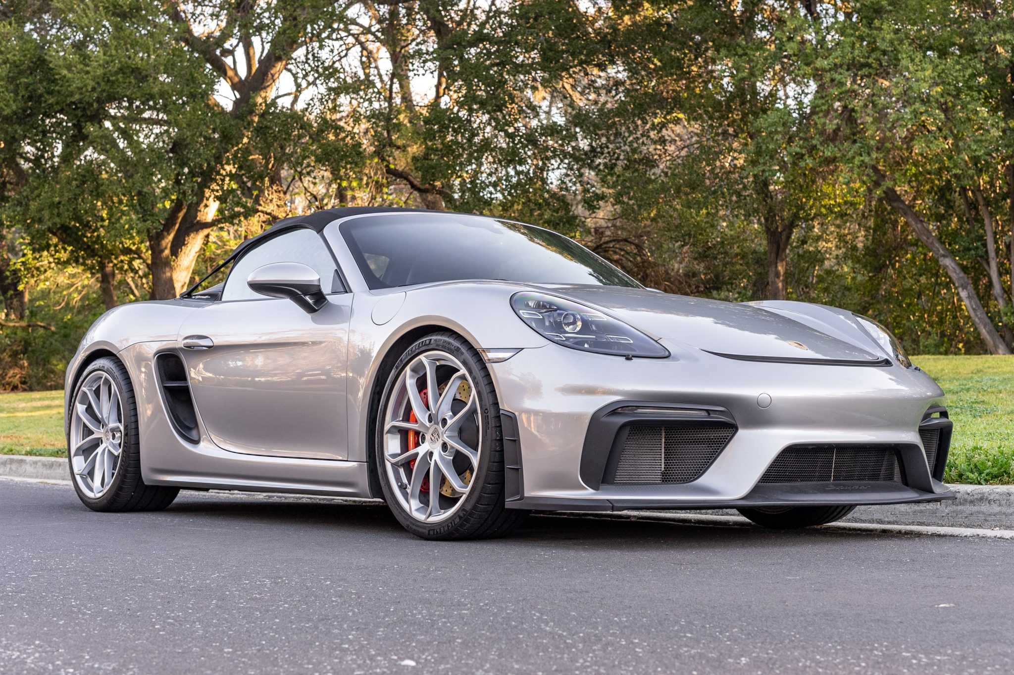 Silver-finished 20″ alloy wheels are wrapped in 245/35 front and 295/30 rear Michelin Pilot Sport 4S tires that show date codes from 2020. Braking is handled by cross-drilled discs with red Porsche-branded calipers.