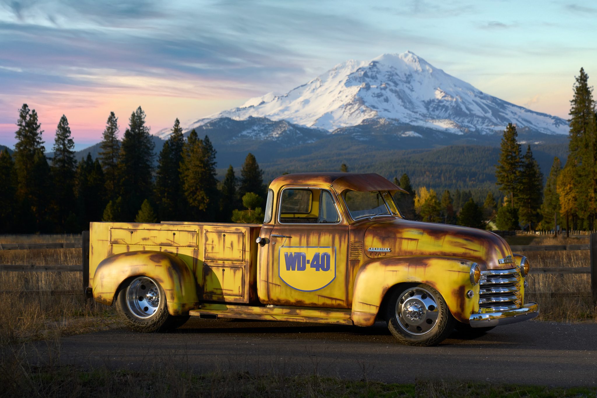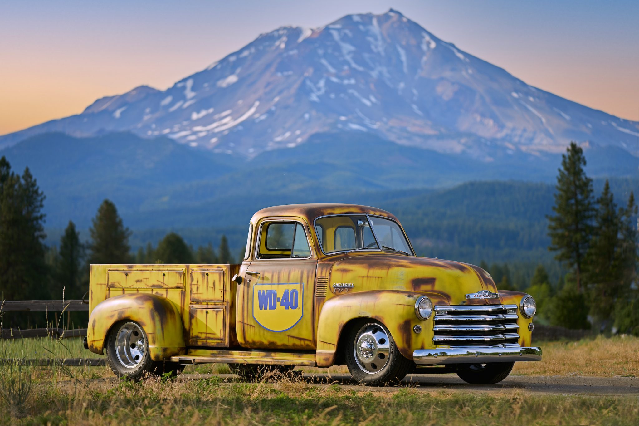 Custom paintwork by Airhead Designs in Crandon, Wisconsin, incorporates simulated corrosion and wear to mimic the appearance and texture of a weathered yellow finish. Features include a matching windshield visor, yellow headlight lenses, WD-40 branding on each door, and custom “TRAD” badges on the hood corners. Weatherstripping is said to have been refreshed during the build, while the glass was retained and is said to exhibit areas of etching. Various imperfections in panel alignment are noted, and the doors are said to require exertion to shut.