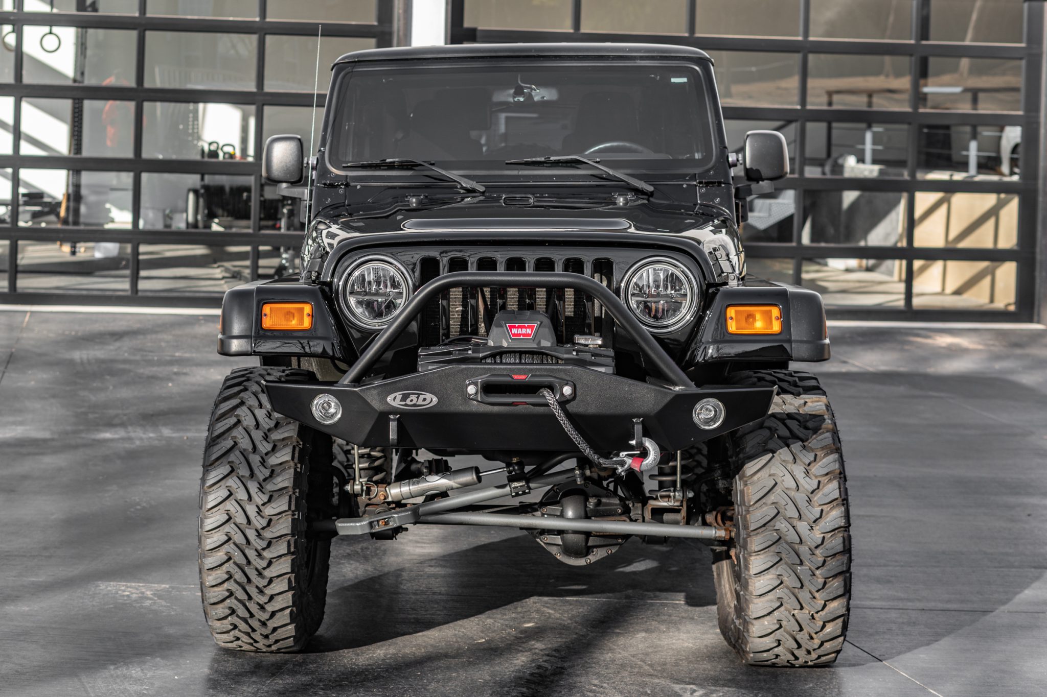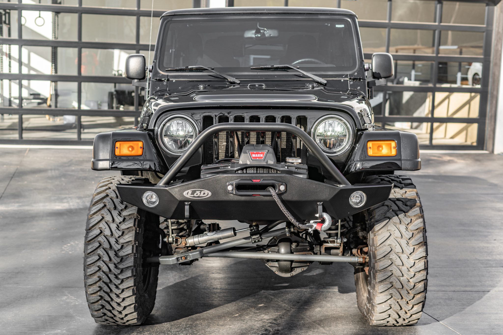 Black-finished 17″ Method alloy wheels wear 35×12.5″ Toyo Open Country M/T tires, and a matching spare is mounted on a rear tire carrier. A lift kit and Fox steering stabilizer have been fitted, and braking is handled by discs at each corner.