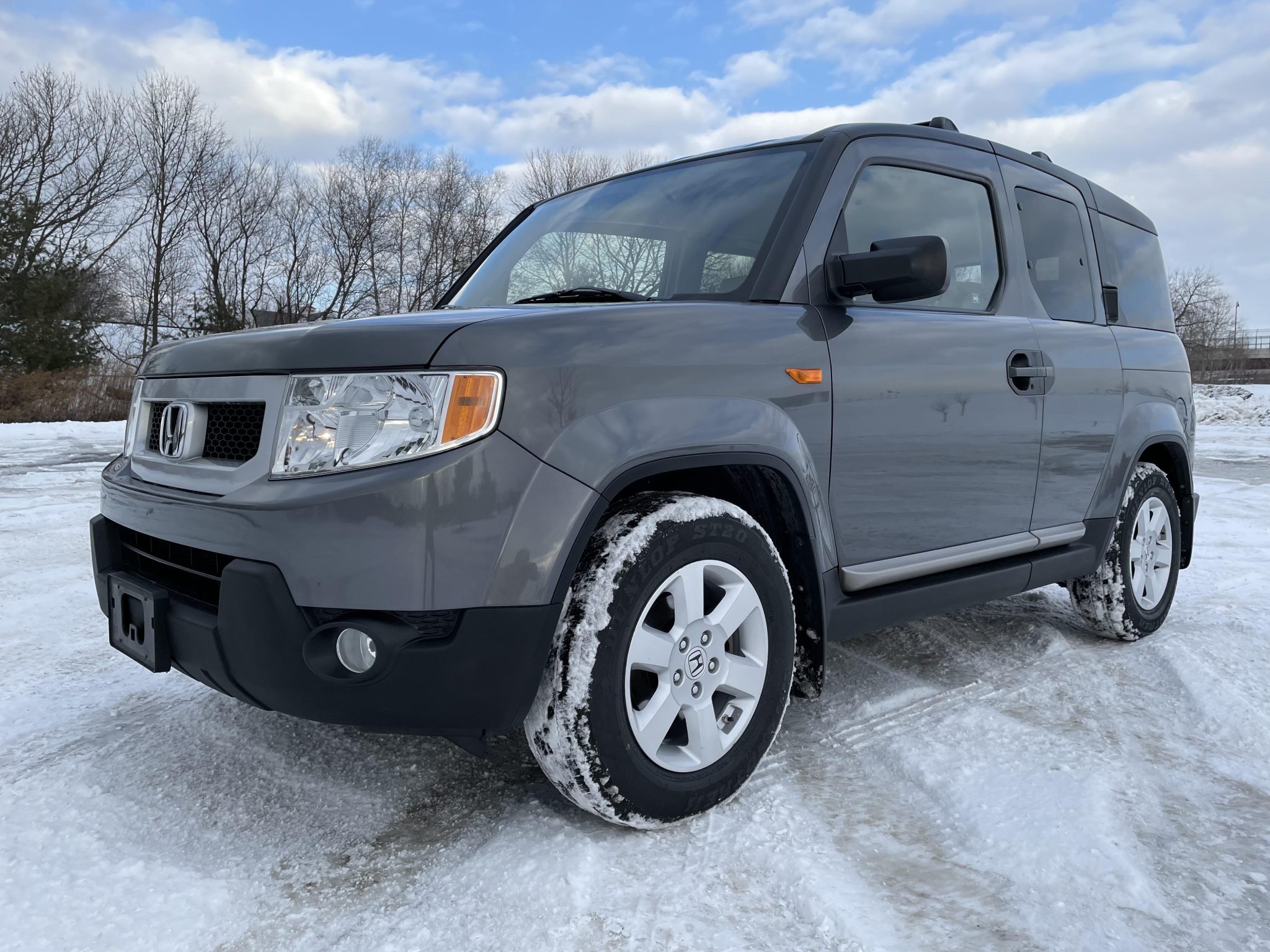 Six-spoke 16″ alloy wheels are wrapped in 215/70 Dunlop Grandtrek ST20 tires showing 2017 date codes. The Element features a MacPherson-strut front suspension and a double-wishbone rear setup. Stopping power is provided by four-wheel anti-lock discs, which the Carfax report indicates were serviced in November 2019.