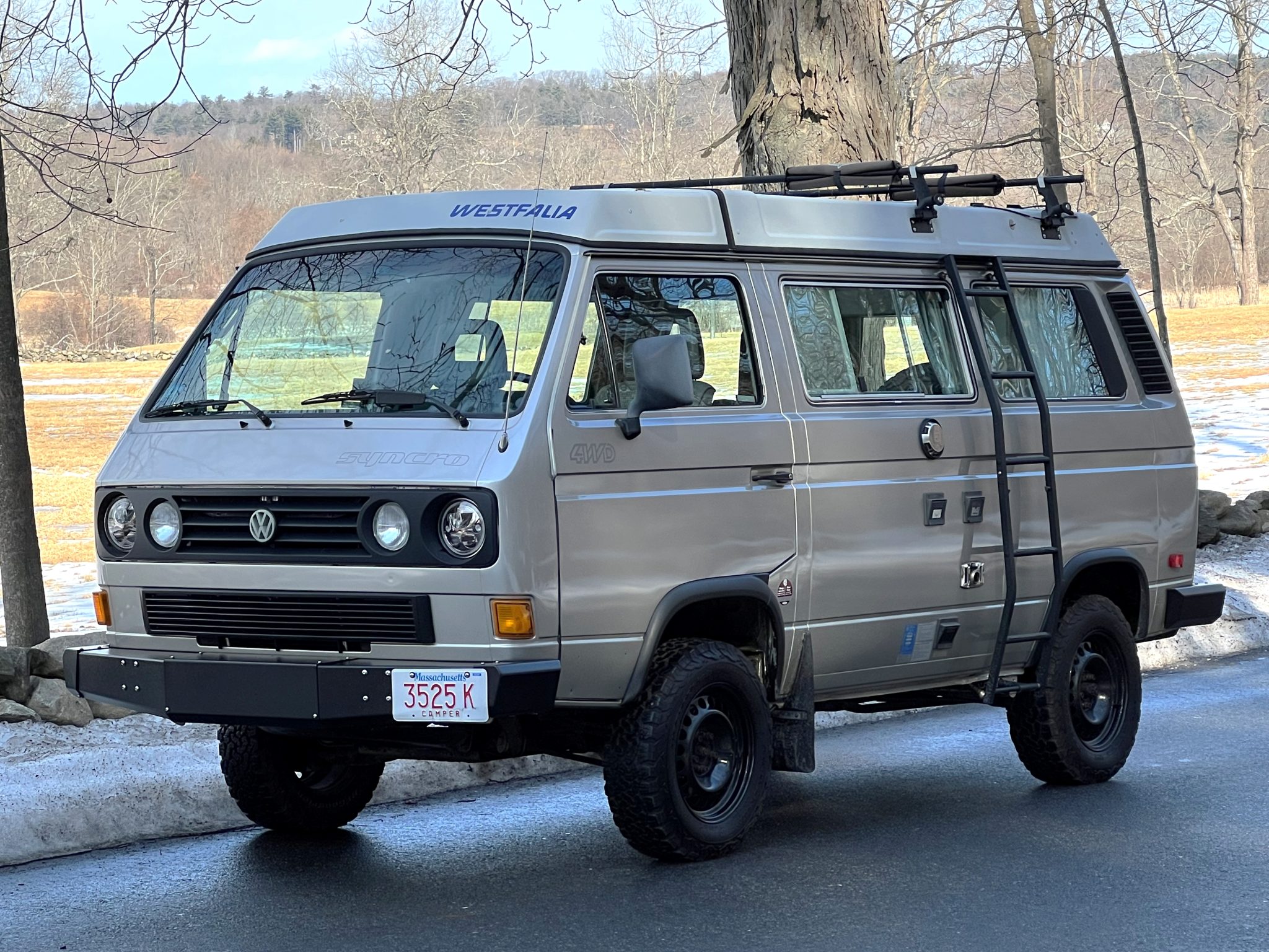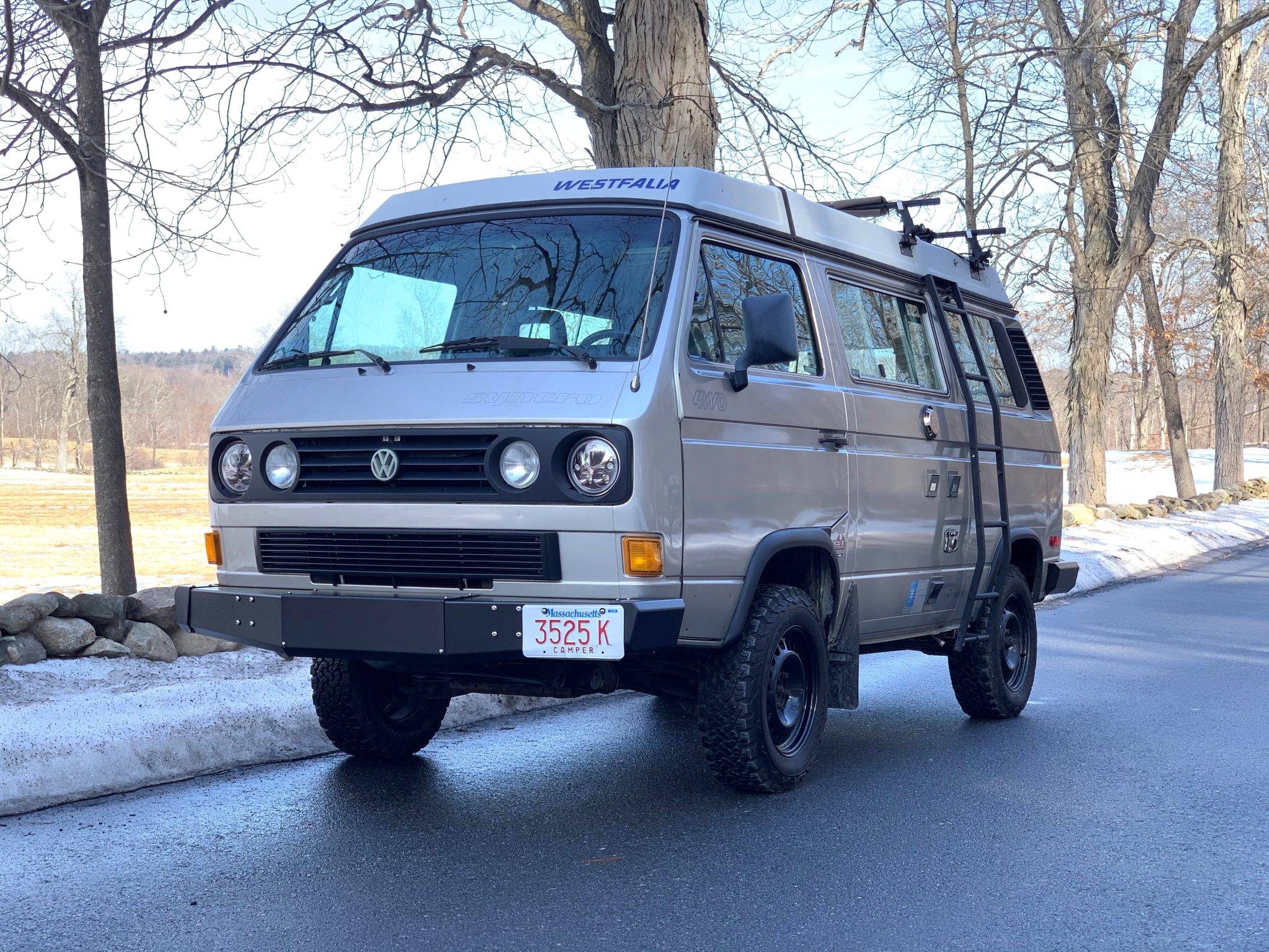 Black 16″ ALCAR Stahlrad wheels are wrapped in 215/70 BFGoodrich All-Terrain T/A KO2 tires. The suspension and brakes have been modified with Old Man Emu shock absorbers and a North Westy Big Brake kit. The CV boots, upper and lower control arm bushings, power steering pump, and steering rack bushings were replaced in January 2019. The spare wheel and tire are mounted to an RMW swing-away carrier.