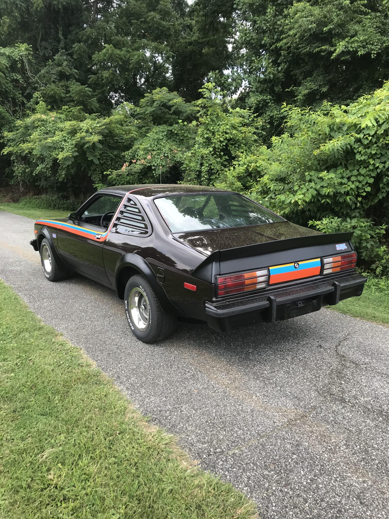 The 15″ GT wheels wear chrome beauty rings and are mounted with BFGoodrich Radial T/A white-letter tires, reportedly installed in 2021. The car is equipped with transverse torsion bars and a sway bar at the front, plus leaf springs and a sway bar at the rear. Braking is handled by front discs and rear drums.