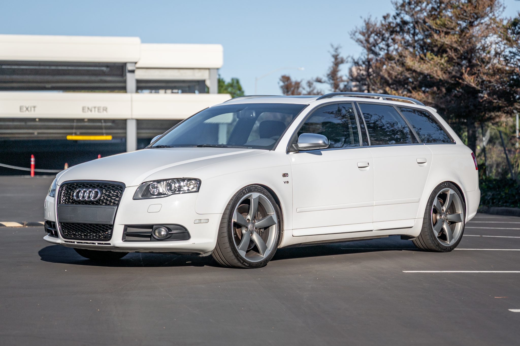 Five-spoke 19″ wheels from an RS5 are wrapped in 245/35 Michelin Pilot Super Sport tires. A Stasis-Ohlins adjustable coilover suspension system is fitted along with a Neuspeed rear sway bar.