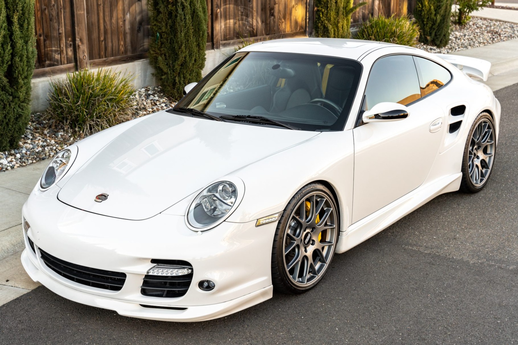 Satin titanium-finished 20″ BBS CH-R wheels are mounted with Michelin Pilot Super Sport tires measuring 245/30 up front and 325/25 out back. Braking is handled by yellow-finished six- and four-piston front and rear calipers over ceramic-composite rotors. The suspension has been modified with a DSC Sport V1 Porsche Active Suspension Management (PASM) controller and H&R Sport springs.