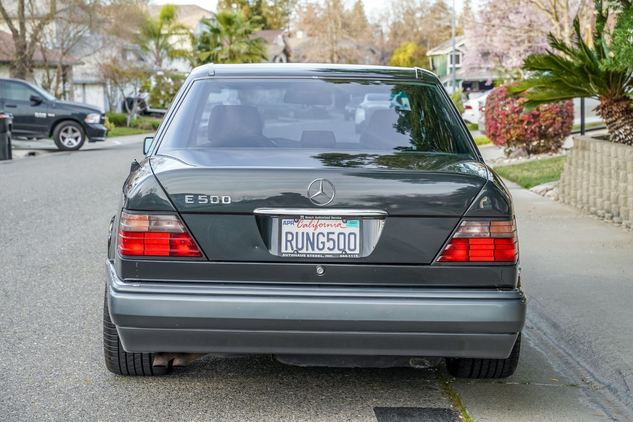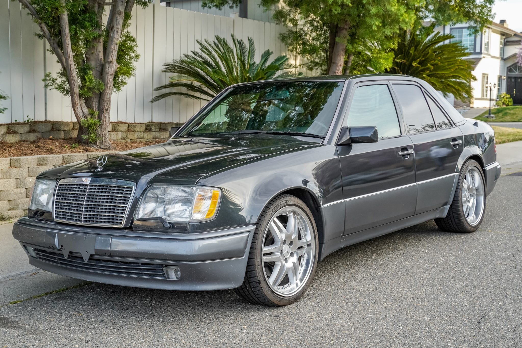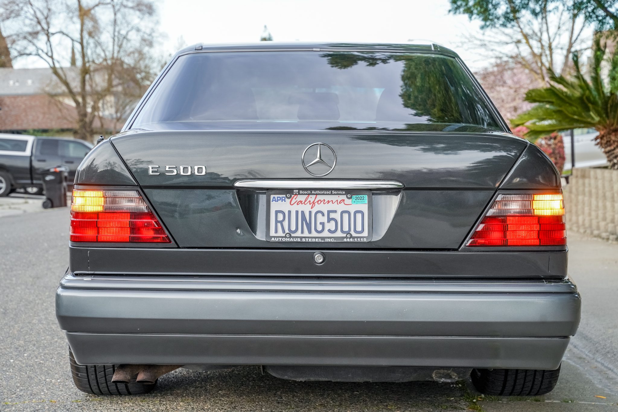 Silver-finished 19″ aftermarket wheels are mounted with 245/35 front and 285/30 rear Michelin Pilot Sport A/S 3+ tires that show 2019 date codes. The E500 featured a wider track and a lowered suspension compared to other W124 models. Equipment includes four-wheel disc brakes, Acceleration Slip Regulation, and a self-leveling suspension system. Blemishes on the wheels can be seen in the gallery below.