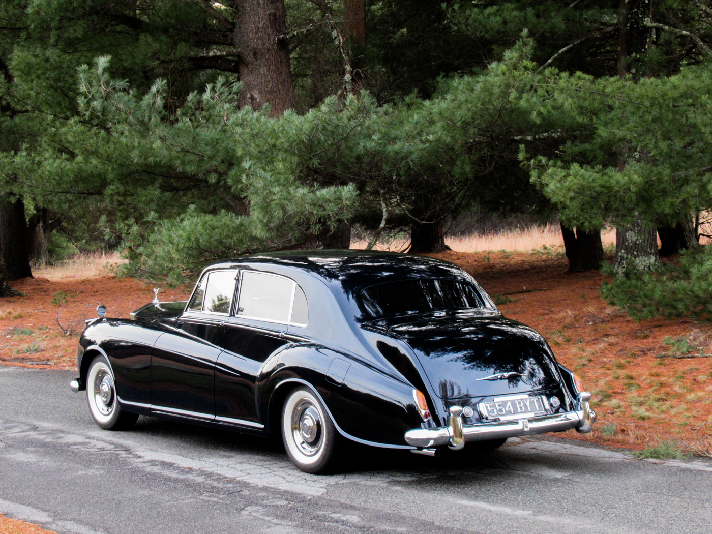 The steel wheels wear chrome trim rings and Rolls-Royce-branded hubcaps and are mounted with BFGoodrich Silvertown Radial whitewall tires. A matching spare is stowed in the trunk.