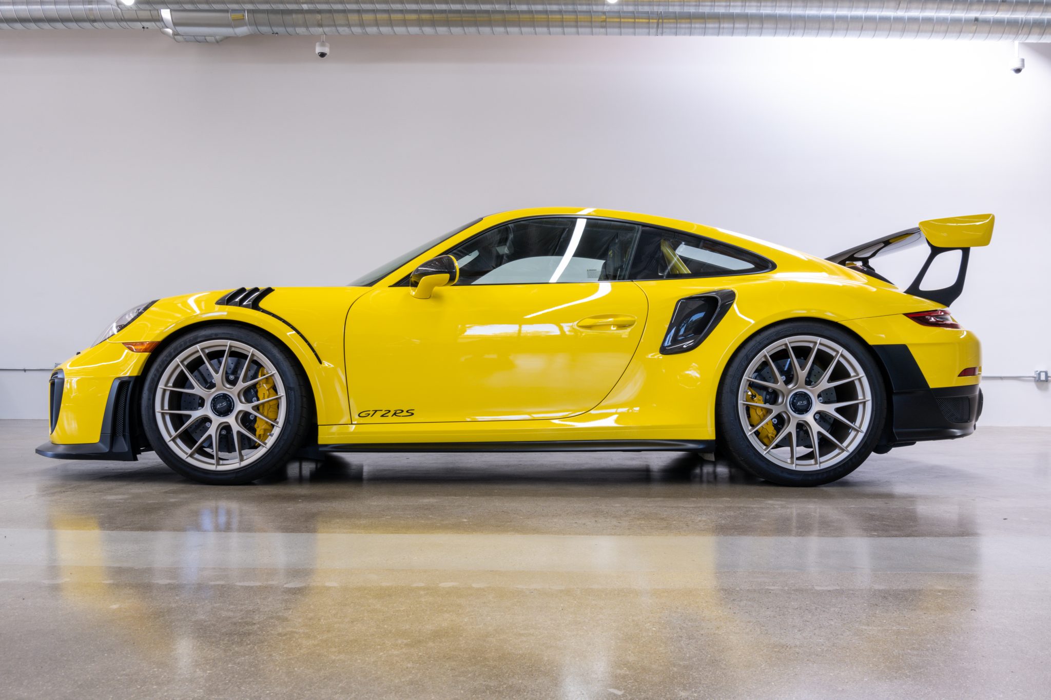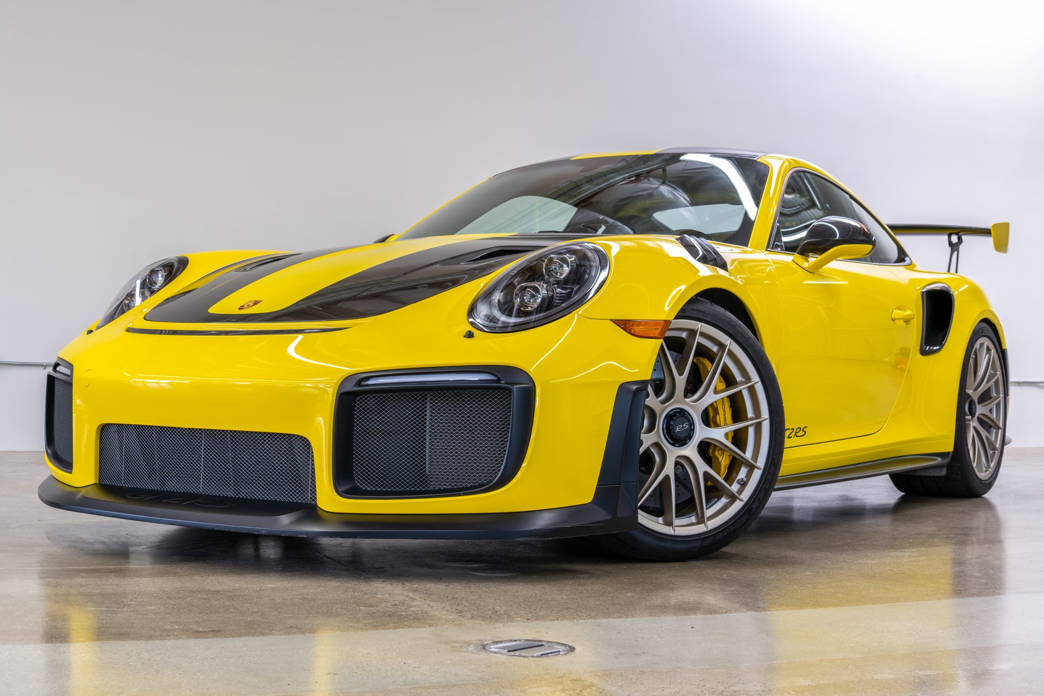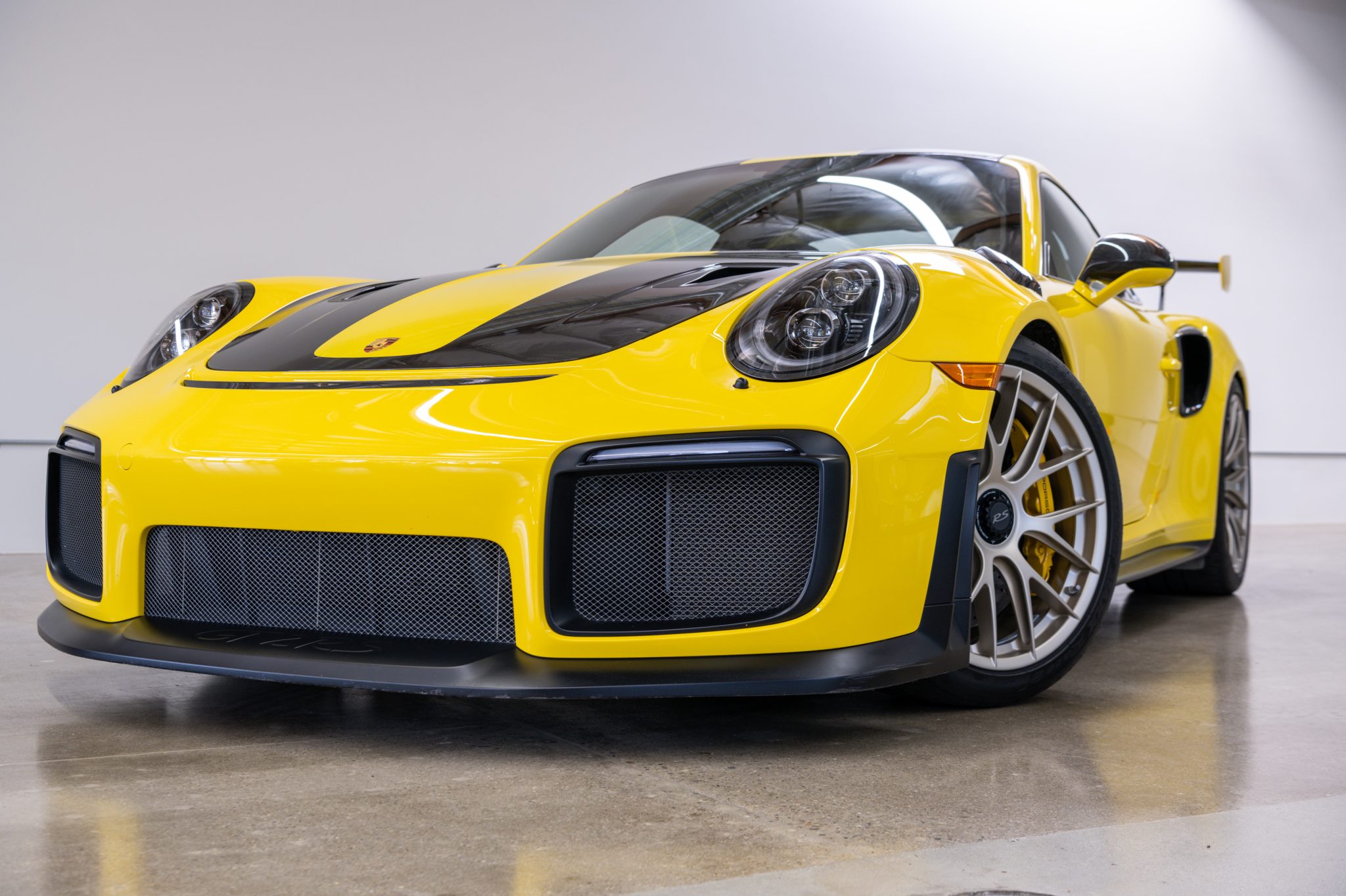 Magnesium center-locking wheels, which measure 20” up front and 21” out back, wear Dunlop Sport Maxx 265/35 front and 325/30 rear tires. The Porsche Ceramic Composite Brake system employs yellow six-piston front and four-piston rear calipers, and the GT2 RS suspension utilizes ball joints in place of bushings to allow for individually adjustable ride height, camber, caster, and toe. The Weissach package adds carbon-fiber sway bars and end links.