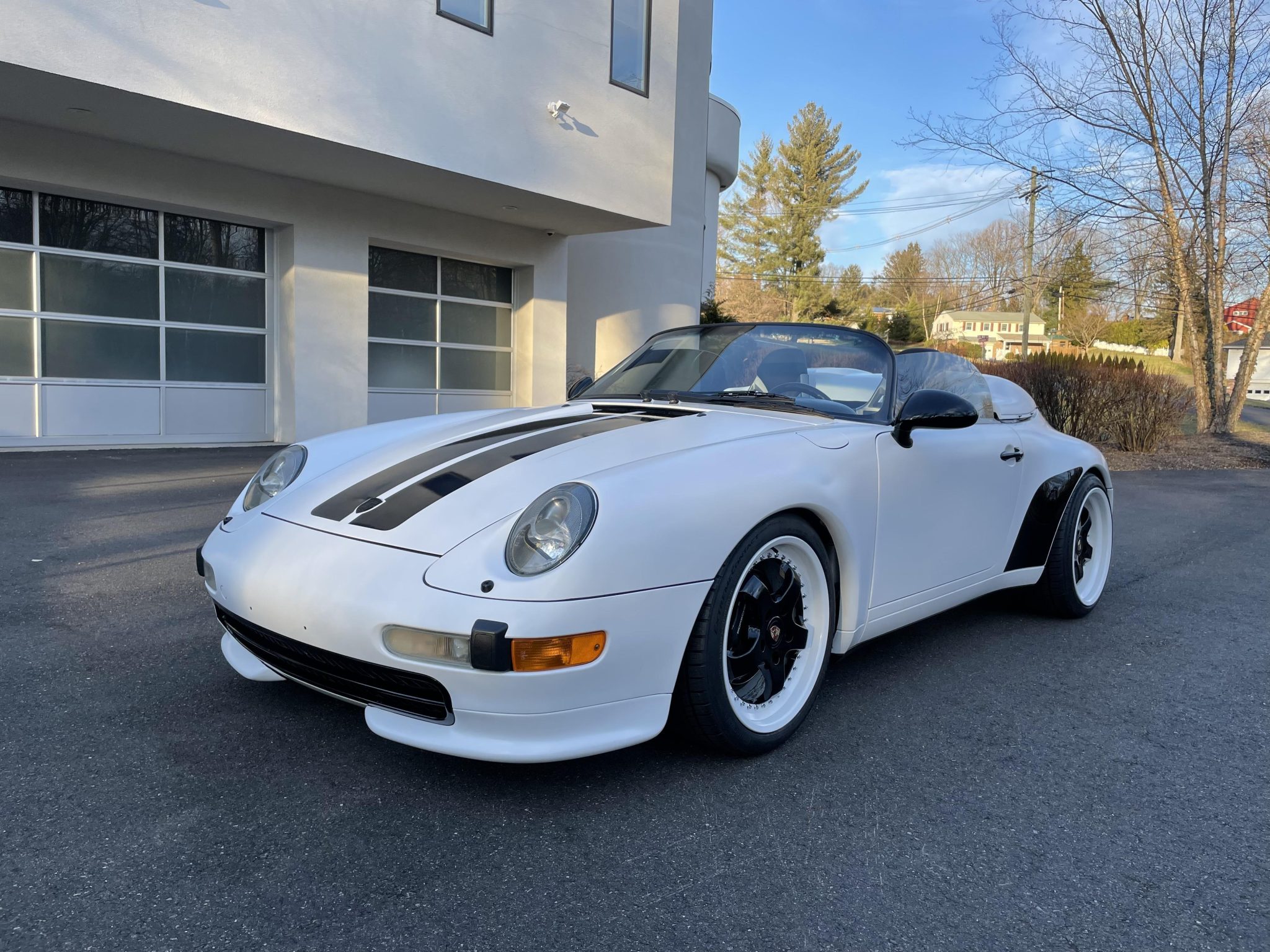 Speedline 18″ wheels equipped with black centers, white barrels, and Porsche crest center caps are wrapped in Continental ExtremeContact DWS 06 Plus tires that were reportedly installed in 2021 and measure 225/40 up front and 255/35 in the rear. A spare tire is located in the front storage compartment. Braking is handled by four-wheel discs with black calipers and cross-drilled rotors. H&R adjustable coilovers were installed during current ownership.