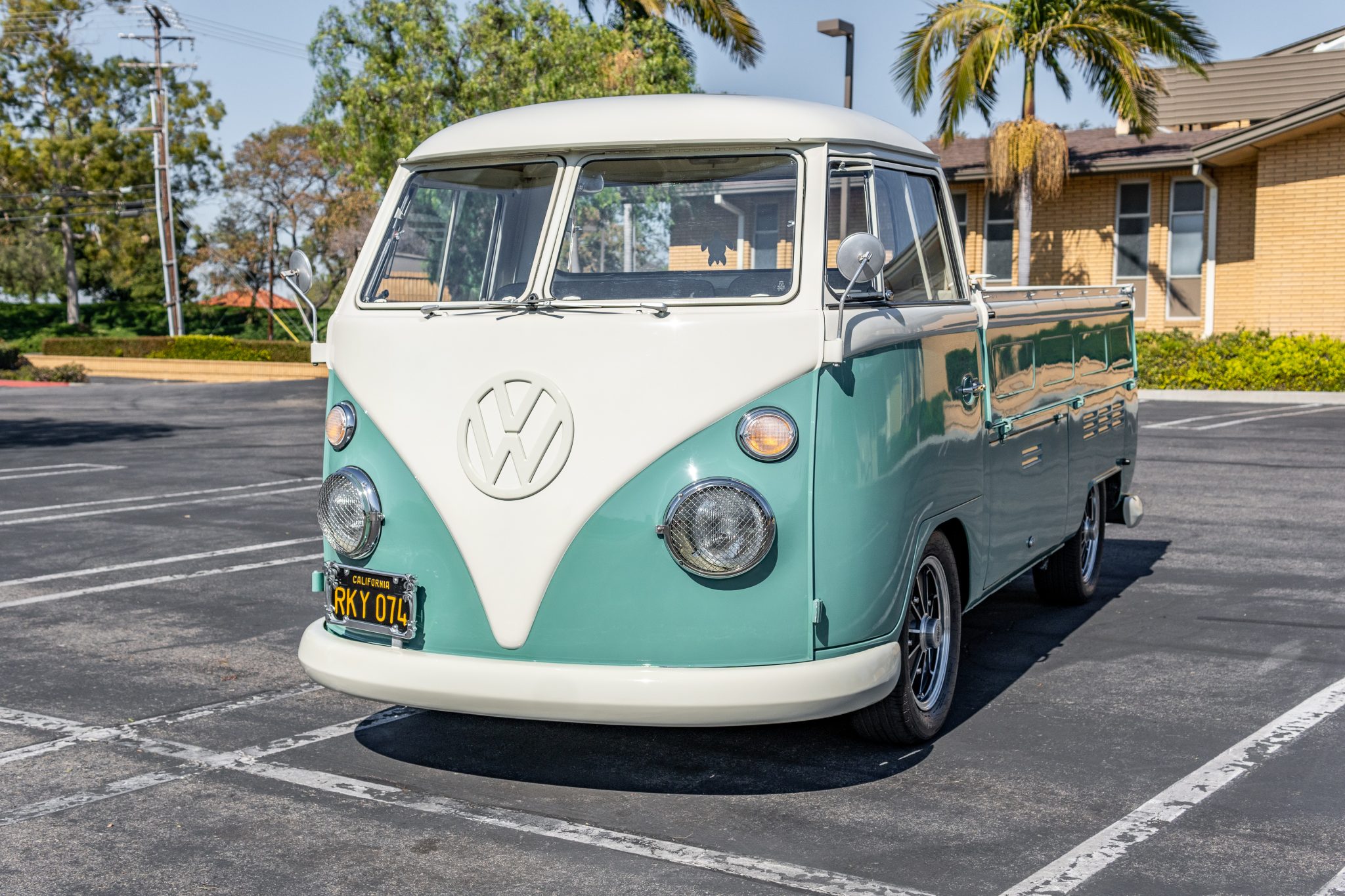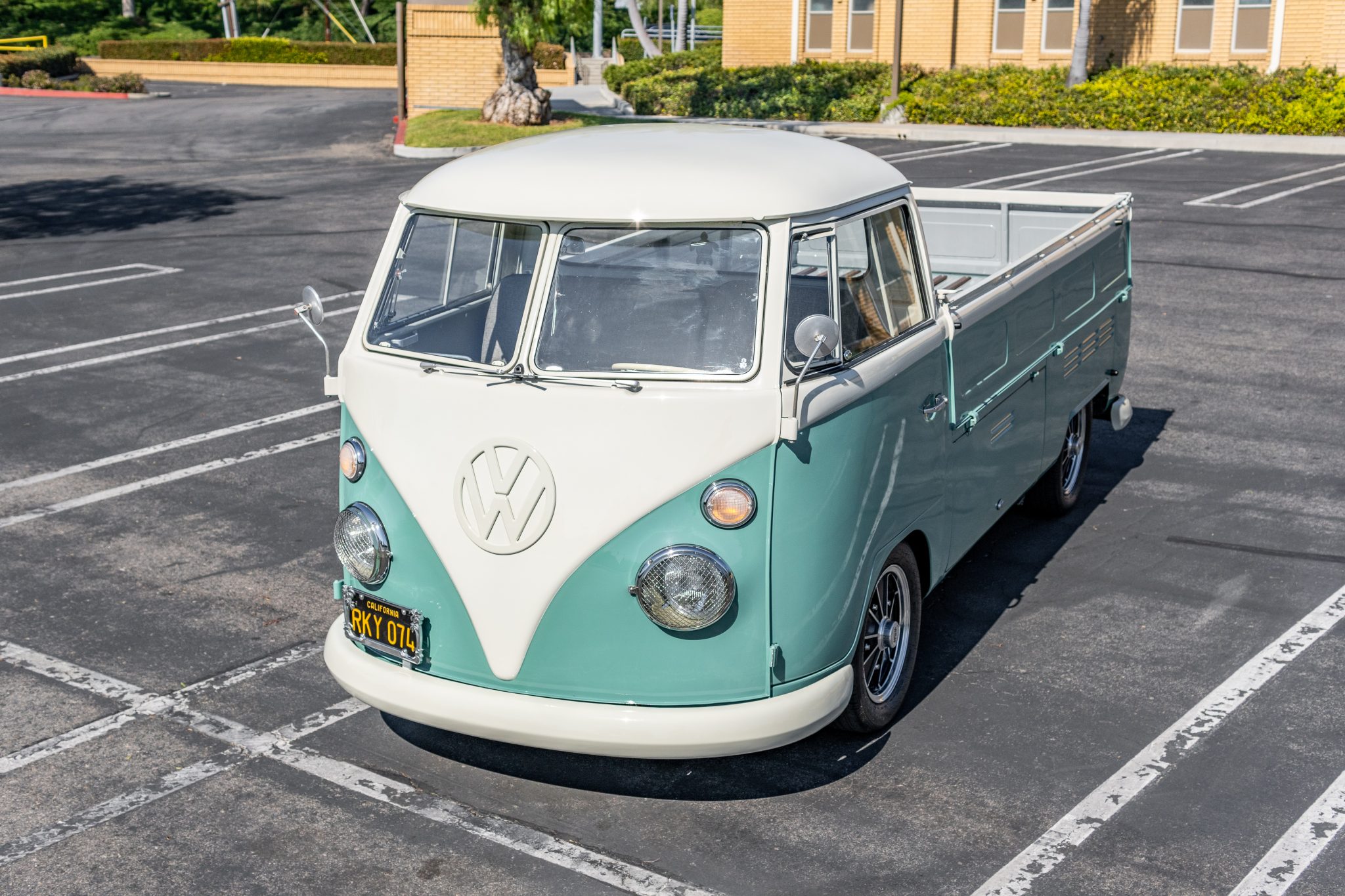 A lower storage compartment is accessible via flip-up doors. BRM-style 15″ wheels sourced from EMPI are mounted with 195/60 Uniroyal and Negotiator tires, and a spare wheel and tire is stored in the aforementioned compartment. According to the seller, the ride height has been lowered, and braking is handled by discs up front and drums out back.