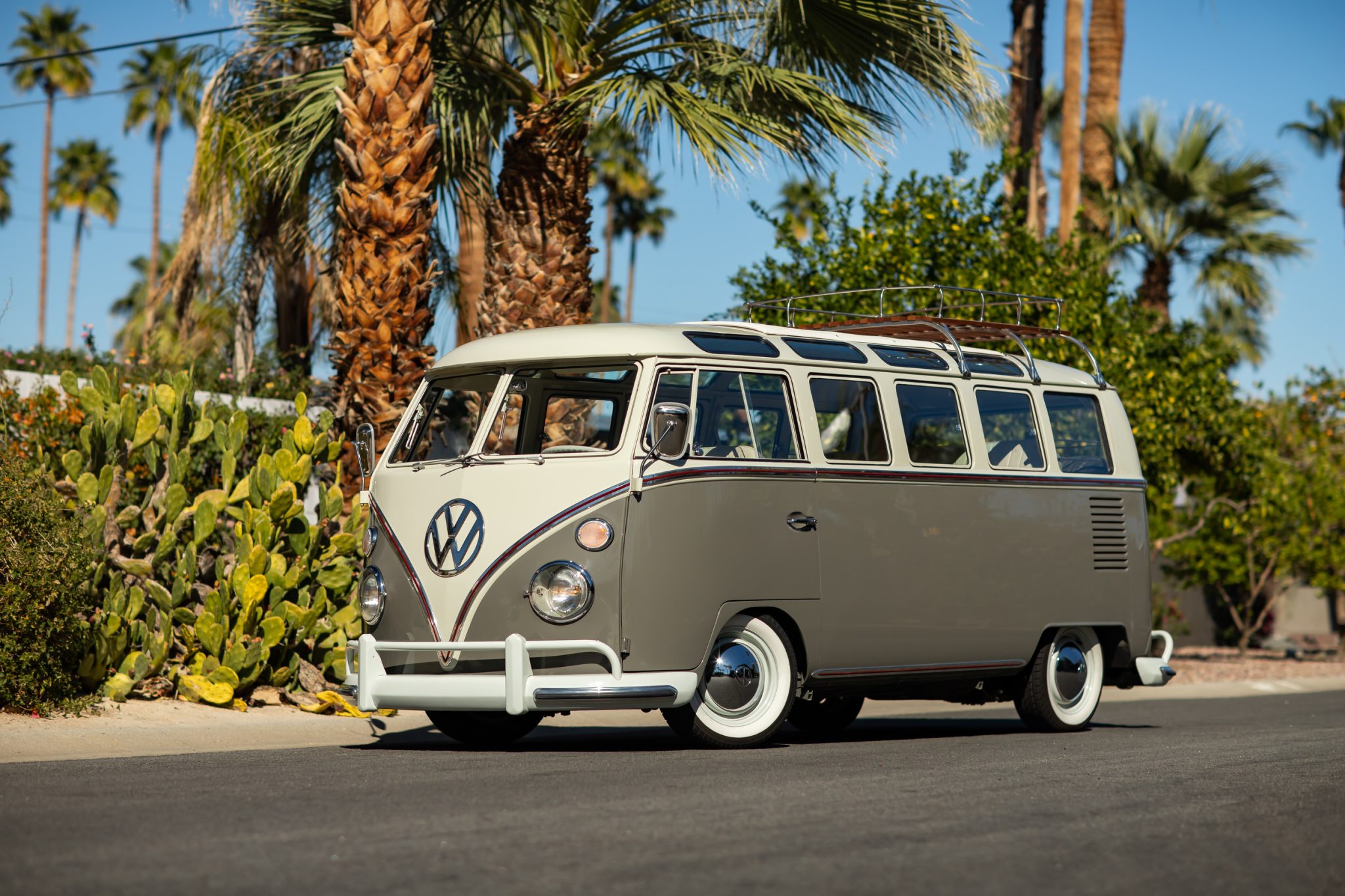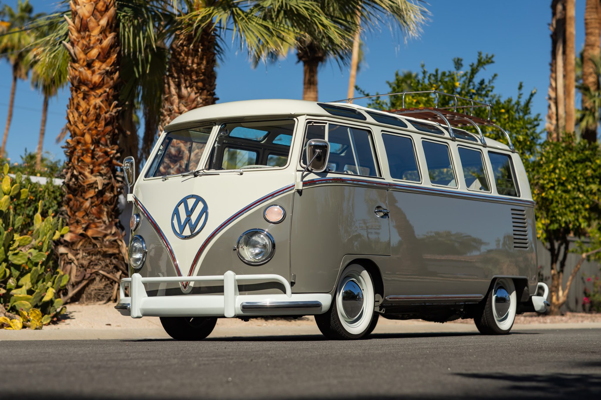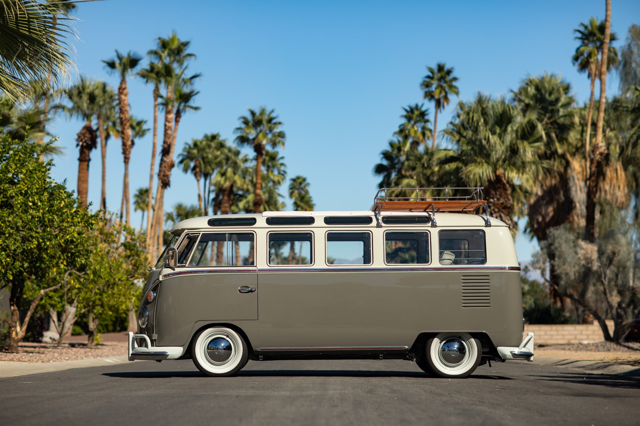 White-painted steel wheels wear chrome VW-logo hubcaps and are wrapped in wide whitewall tires. The spare is located in the cargo compartment. Work during the refurbishment included rebuilding the steering box, lowering the suspension, and installing an Wagenswest adjustable front beam, KYB shock absorbers, and Wilwood front disc brakes.