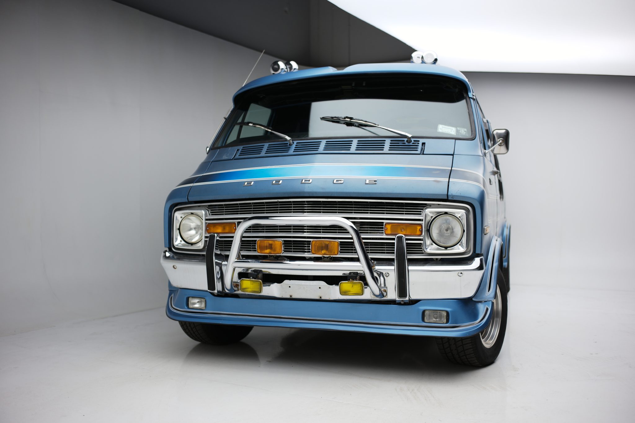 Torq Thrust–style wheels are fitted with Mopar-logo faux spinners and are wrapped in older 295/50 Cooper Cobra tires, and a spare is mounted to the rear door. Stopping power is from front disc and rear drum brakes. The tire sidewalls are cracked, and the seller notes the van is in need of a front-end alignment.