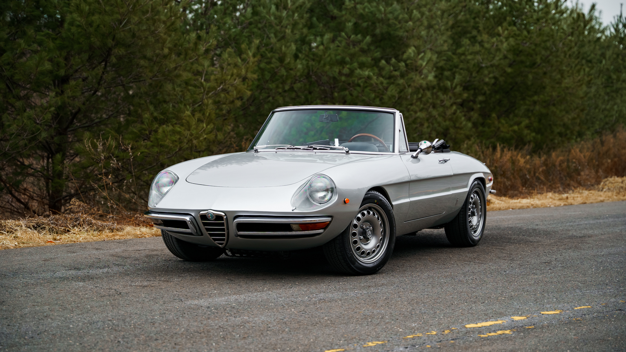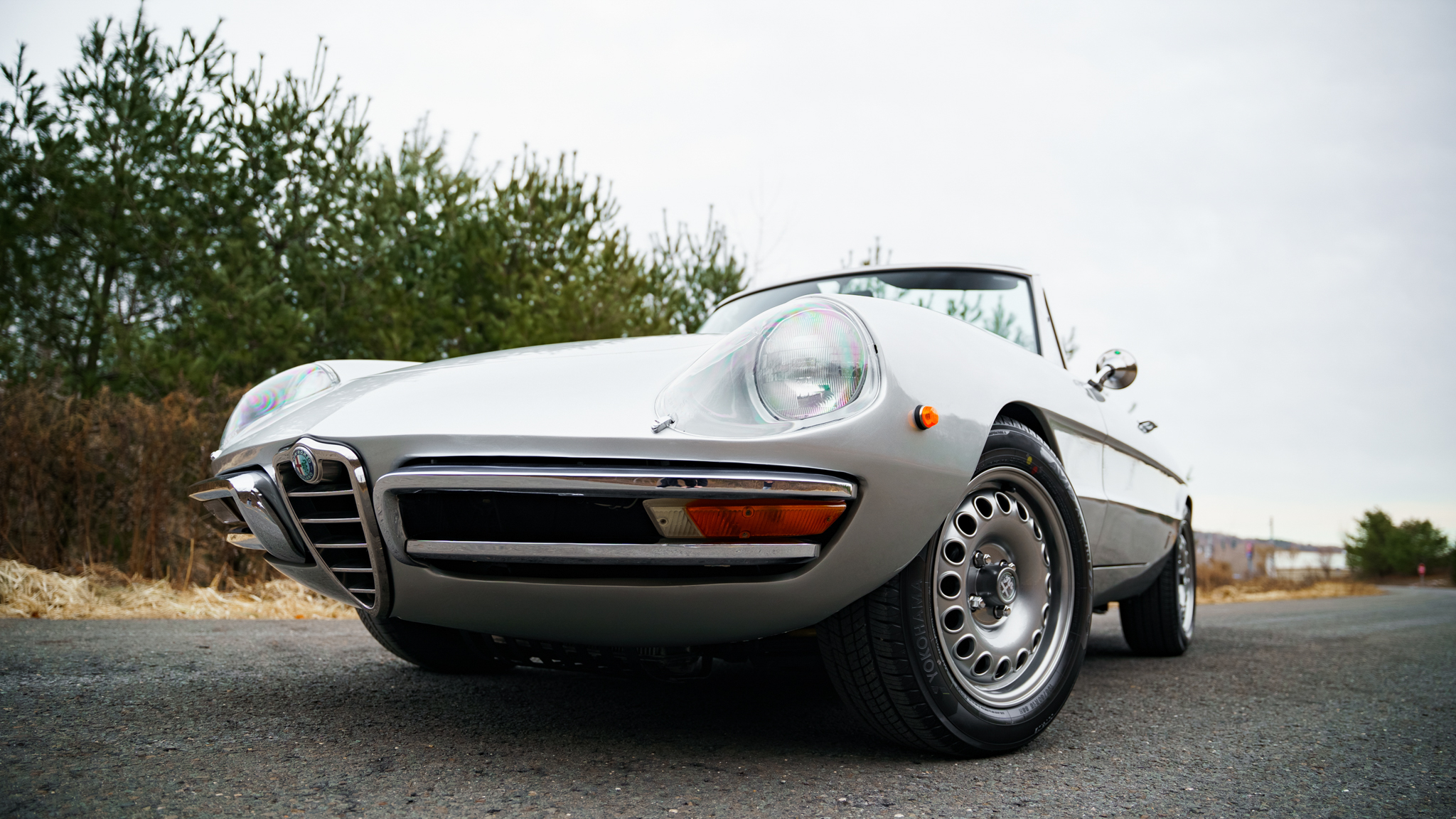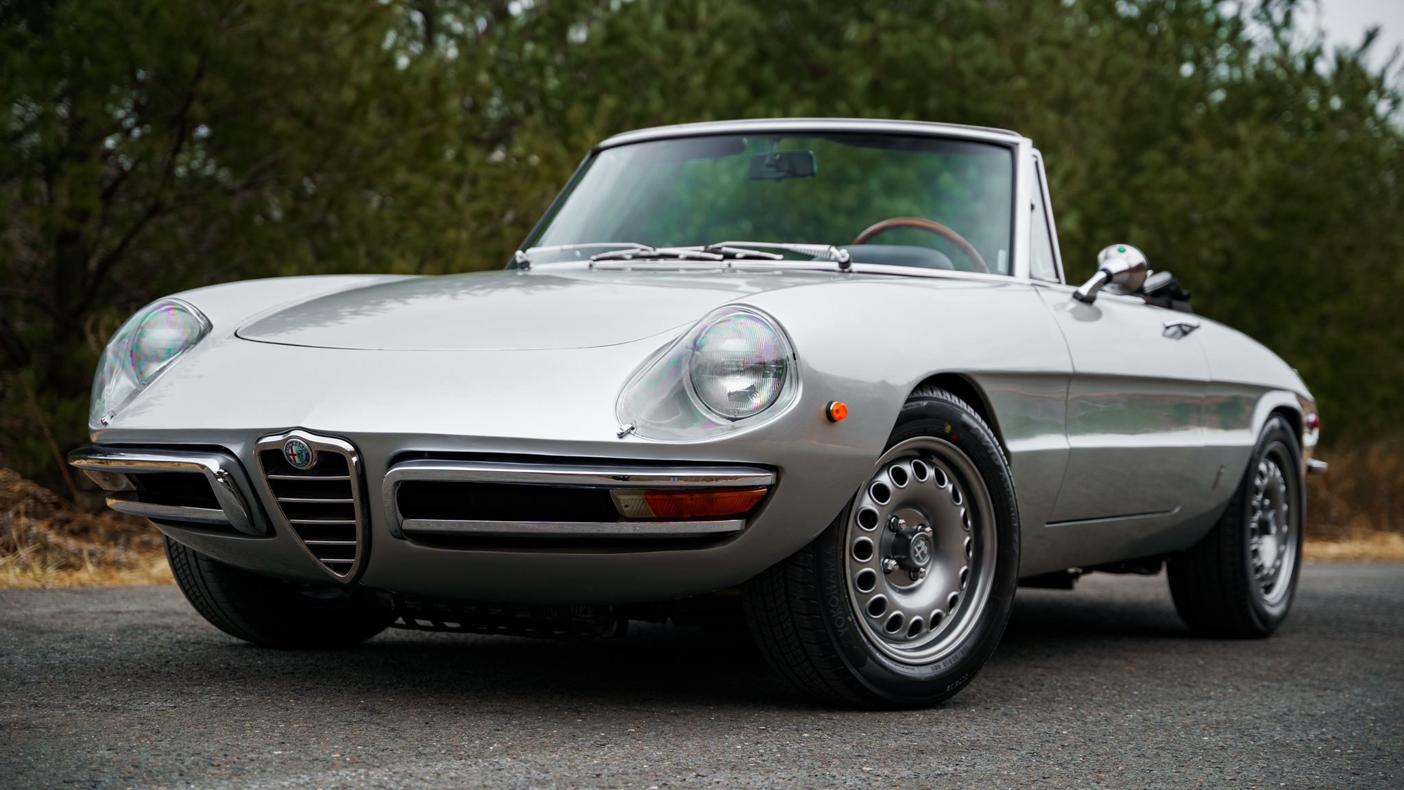 GTA-style 15″ wheels were reportedly sourced from Alfaholics and are wrapped in 195/60 Yokohama Avid Ascend GT tires showing 2021 date codes. A spare is housed in the trunk and mounted with an older Michelin tire. The car is equipped with Koni shocks and GTA trailing arms, and stopping power is provided by four-wheel disc brakes.