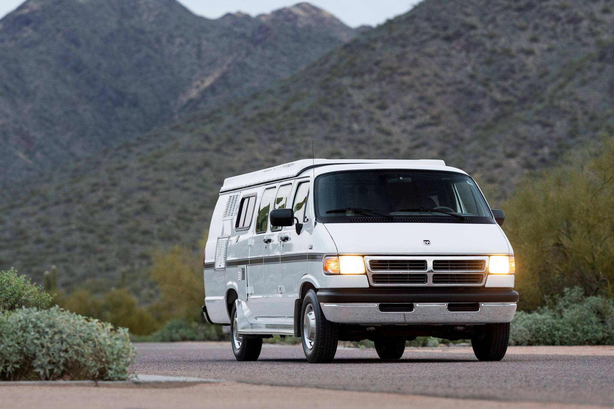 The Sportsmobile pop-top is shown in the gallery in both its raised and lowered positions as well as from the inside. Additional details include connections for electrical and water supply along with panels for appliance service and propane tank access. Steel 16″ wheels with silver hubcaps and bright trim rings are wrapped in 225/75 BFGoodrich tires.