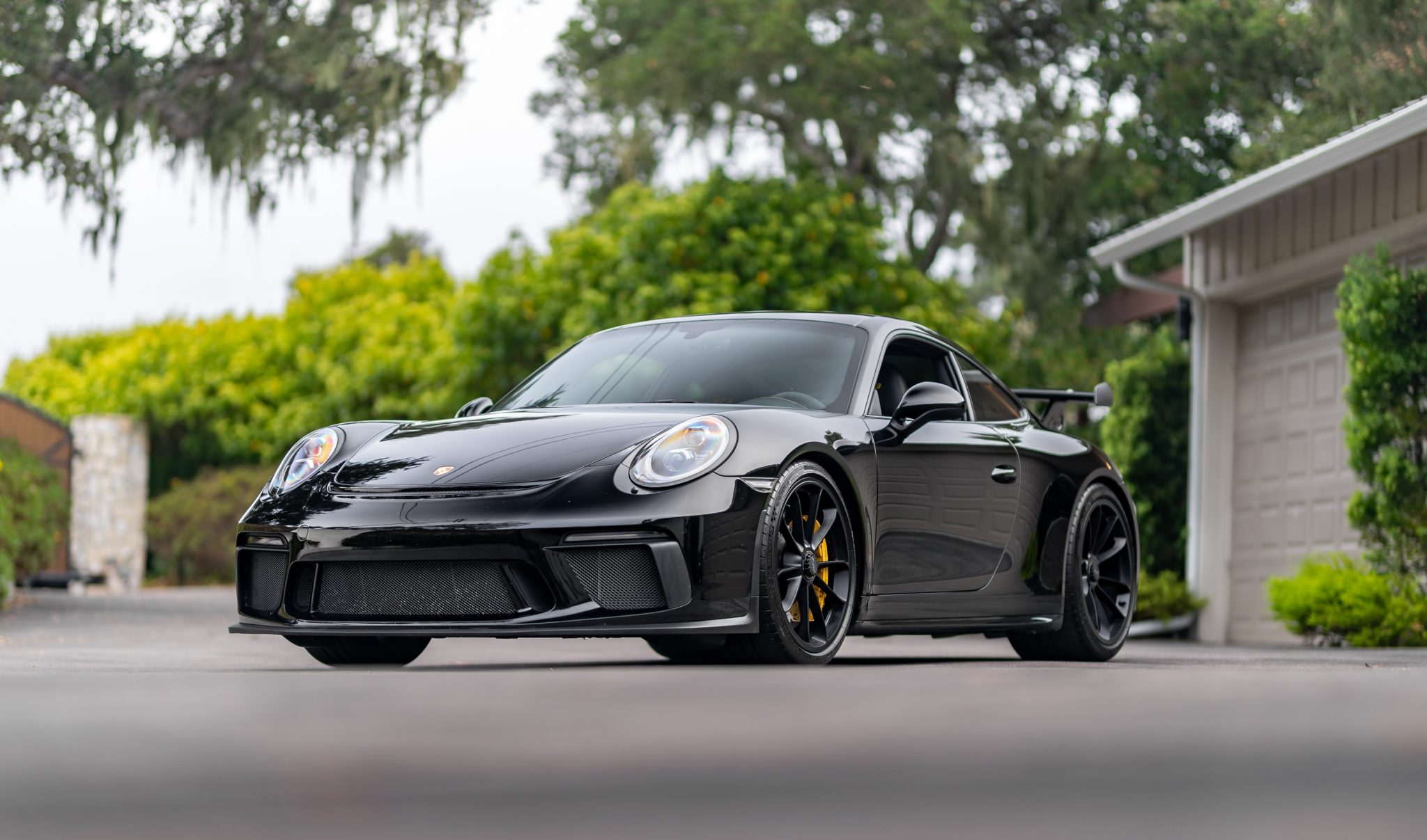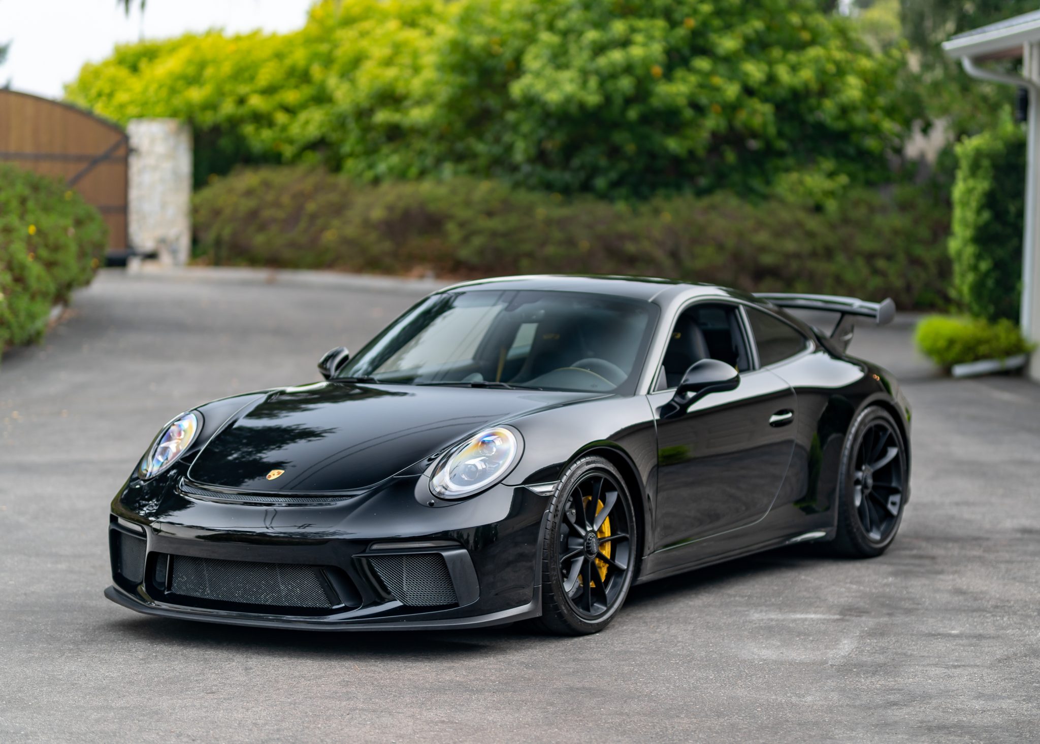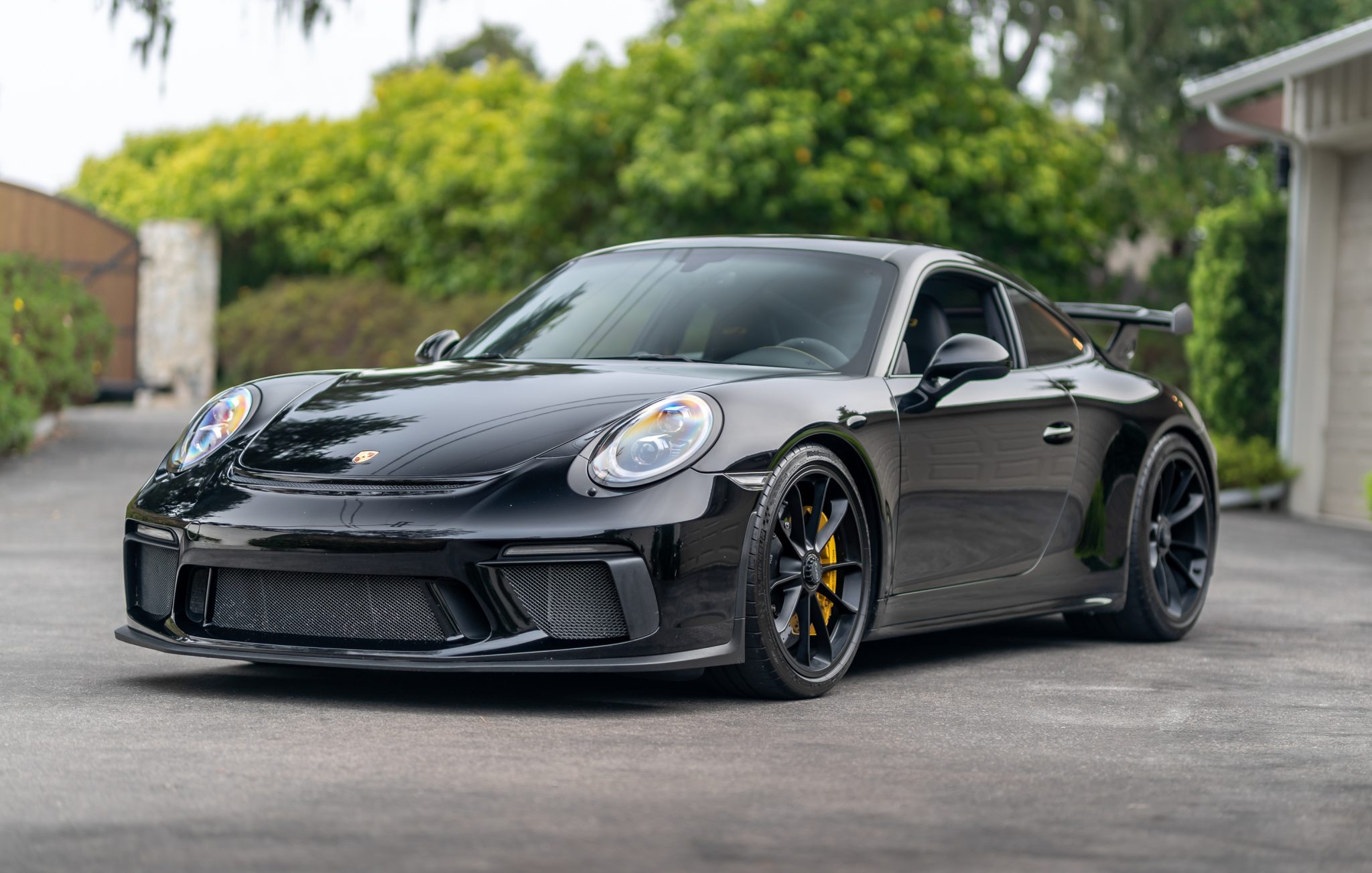 Staggered-width 20″ center-lock wheels are finished in Satin Black and are mounted with Michelin Pilot Sport Cup 2 tires that show 2018 date codes. The car is equipped with optional Porsche Ceramic Composite Brakes (PCCB) and a front-axle-lift system.