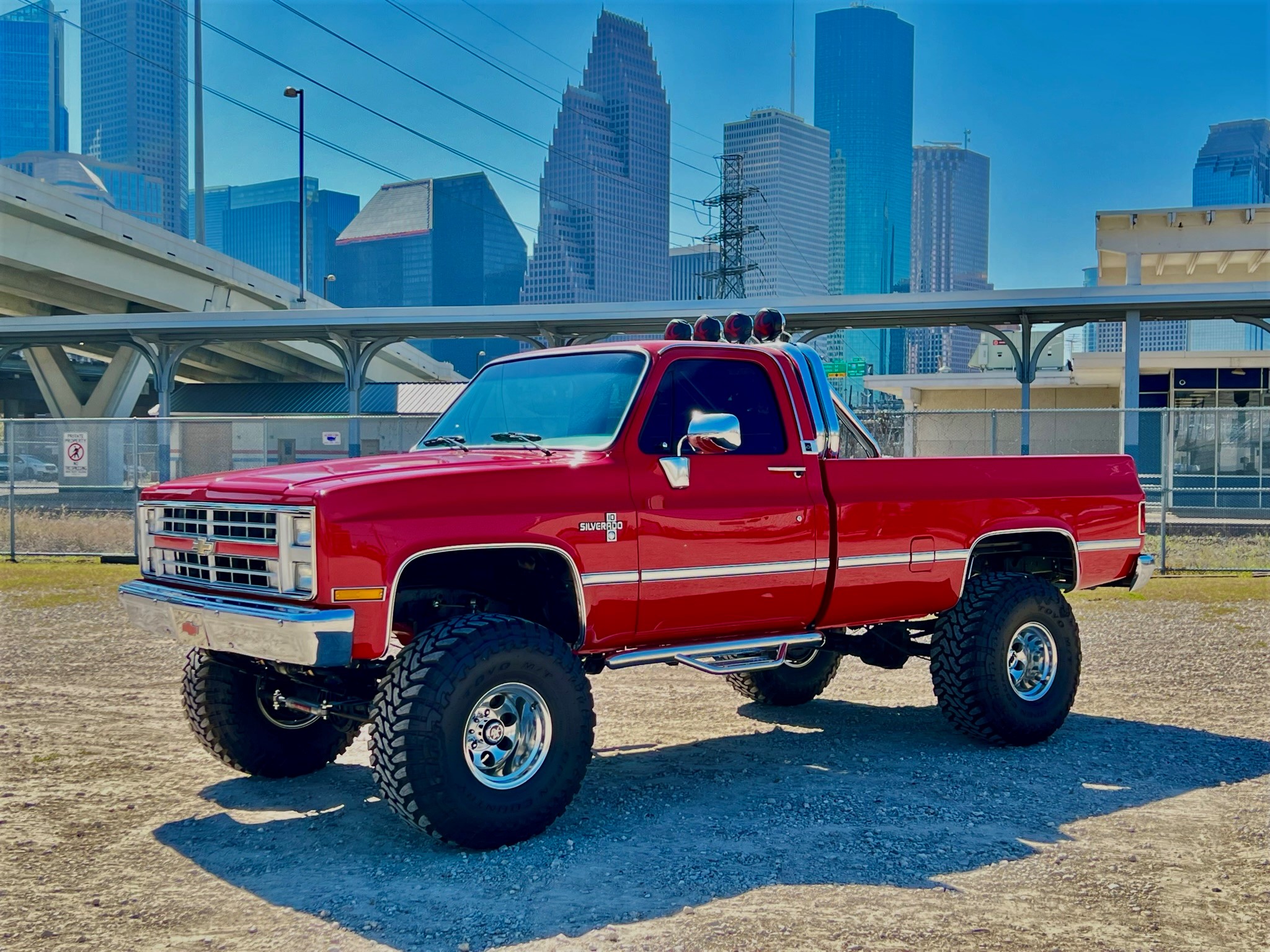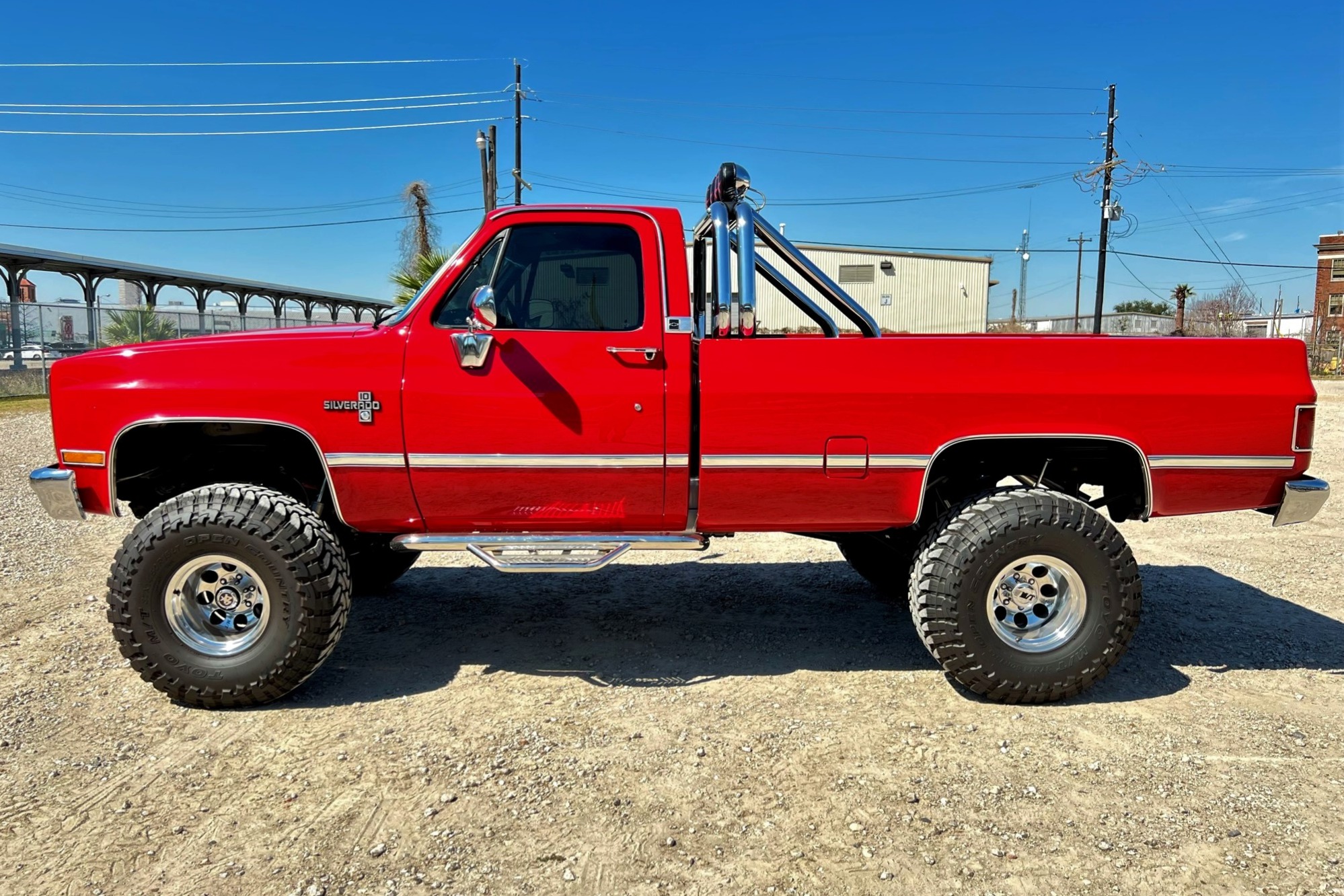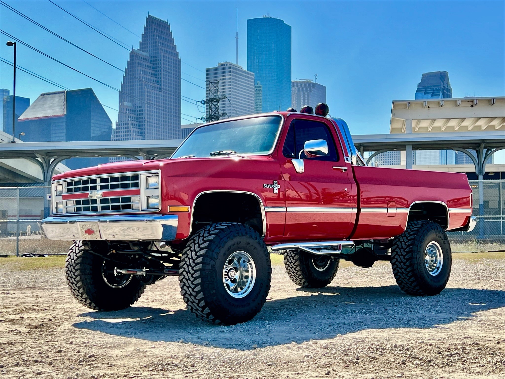 Mickey Thompson 15″ wheels are mounted with 37×14.5″ Toyo Open Country M/T tires at each corner. The ride height is raised approximately 4″ using Rough Country components according to the selling dealer.