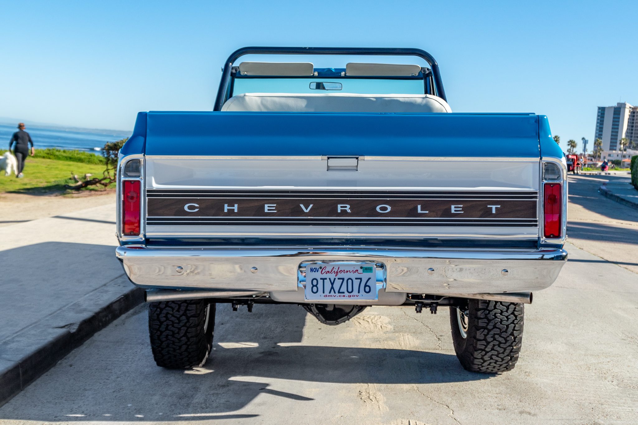 White-painted 15″ steel wheels chrome wear hubcaps as well as 32×11.5″ BFGoodrich All-Terrain T/A KO2 tires that show date codes from 2019. The shocks have also been replaced, and the front axle is equipped with manually locking front hubs.
