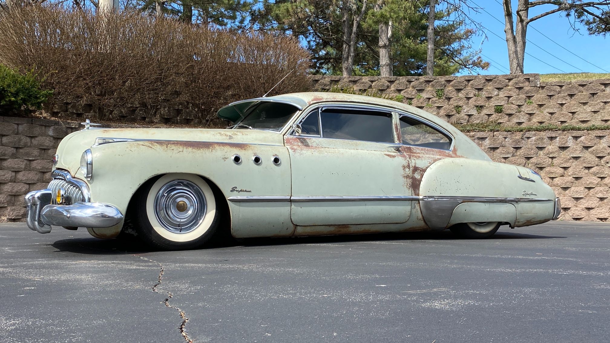 The steel wheels feature polished Cadillac covers and are mounted with whitewall tires. The car rides on a digitally-controlled AccuAir air suspension system. Braking is through power-assisted Wilwood four-wheel discs.