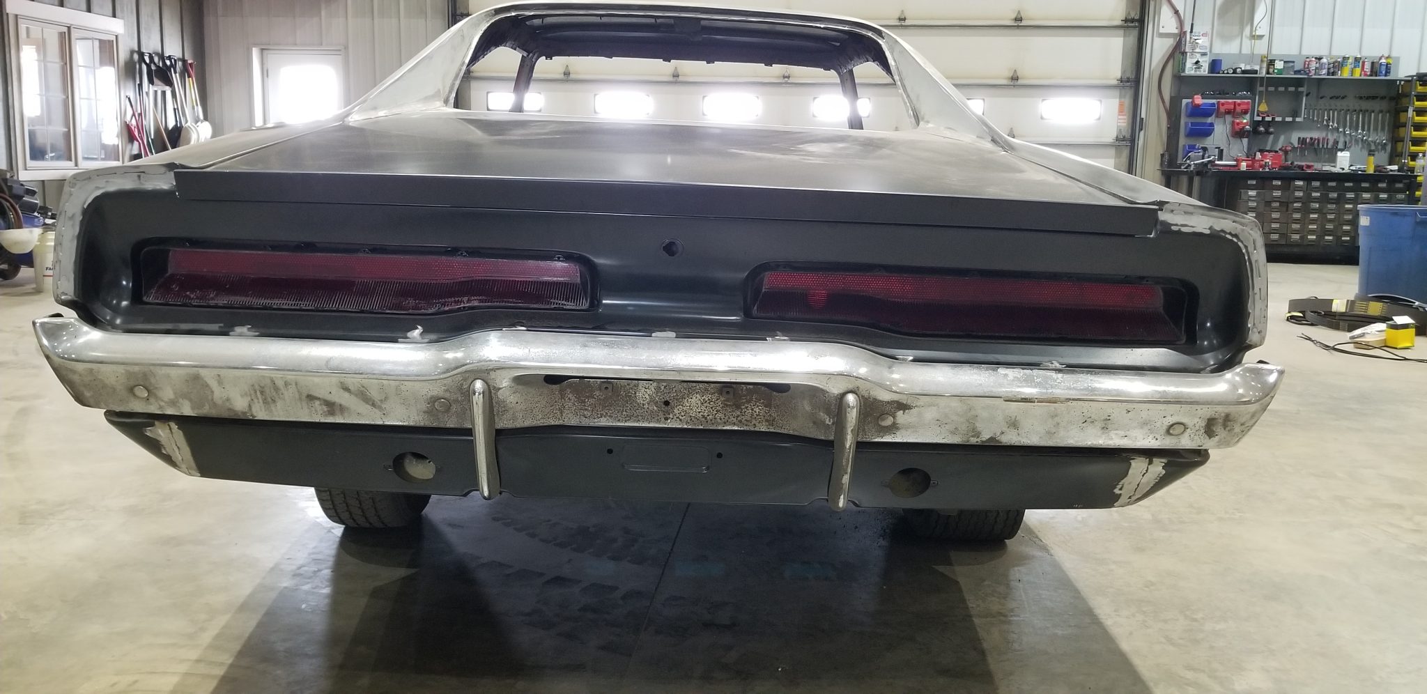 The Magnum 500–style wheels are mounted with a mix of older tires that are in need of replacement. The suspension remains fitted, along with four-wheel drum brakes that are inoperable.