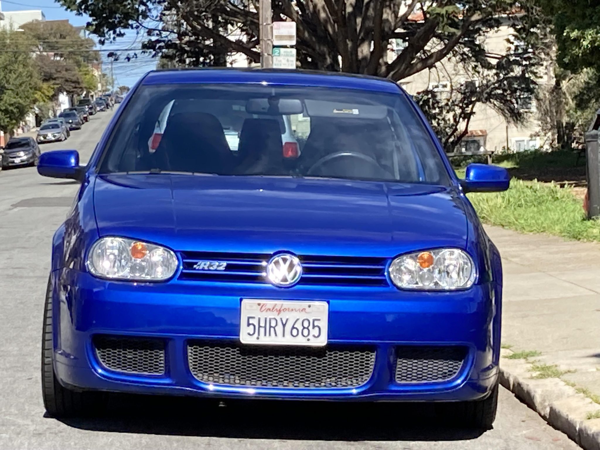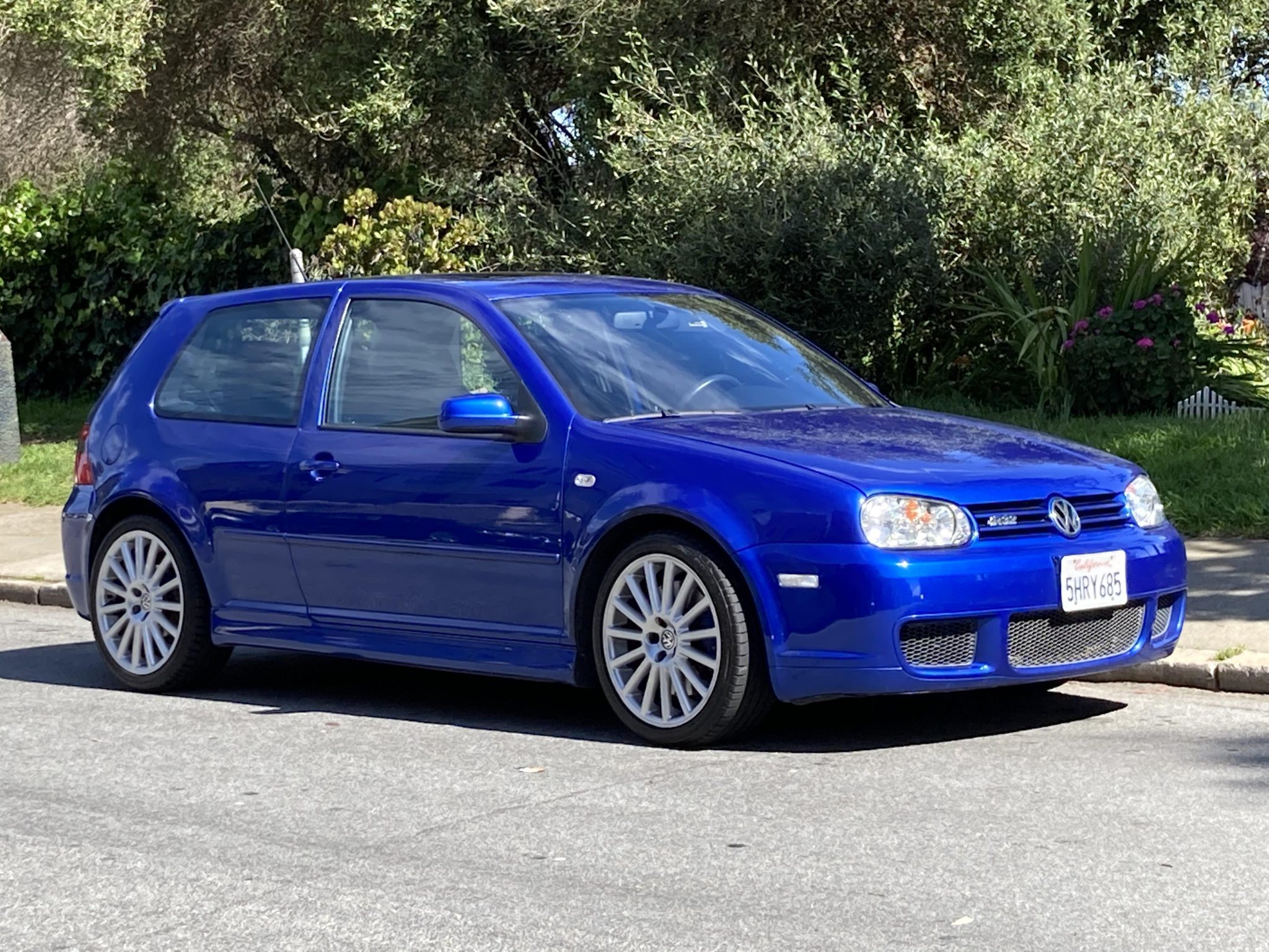 OZ Racing 18″ alloy wheels are mounted with Bridgestone Potenza 225/40 tires that show 2018 date codes. The R32 received upgraded brakes compared with the GTI, including larger ventilated discs and blue-painted calipers at each corner.