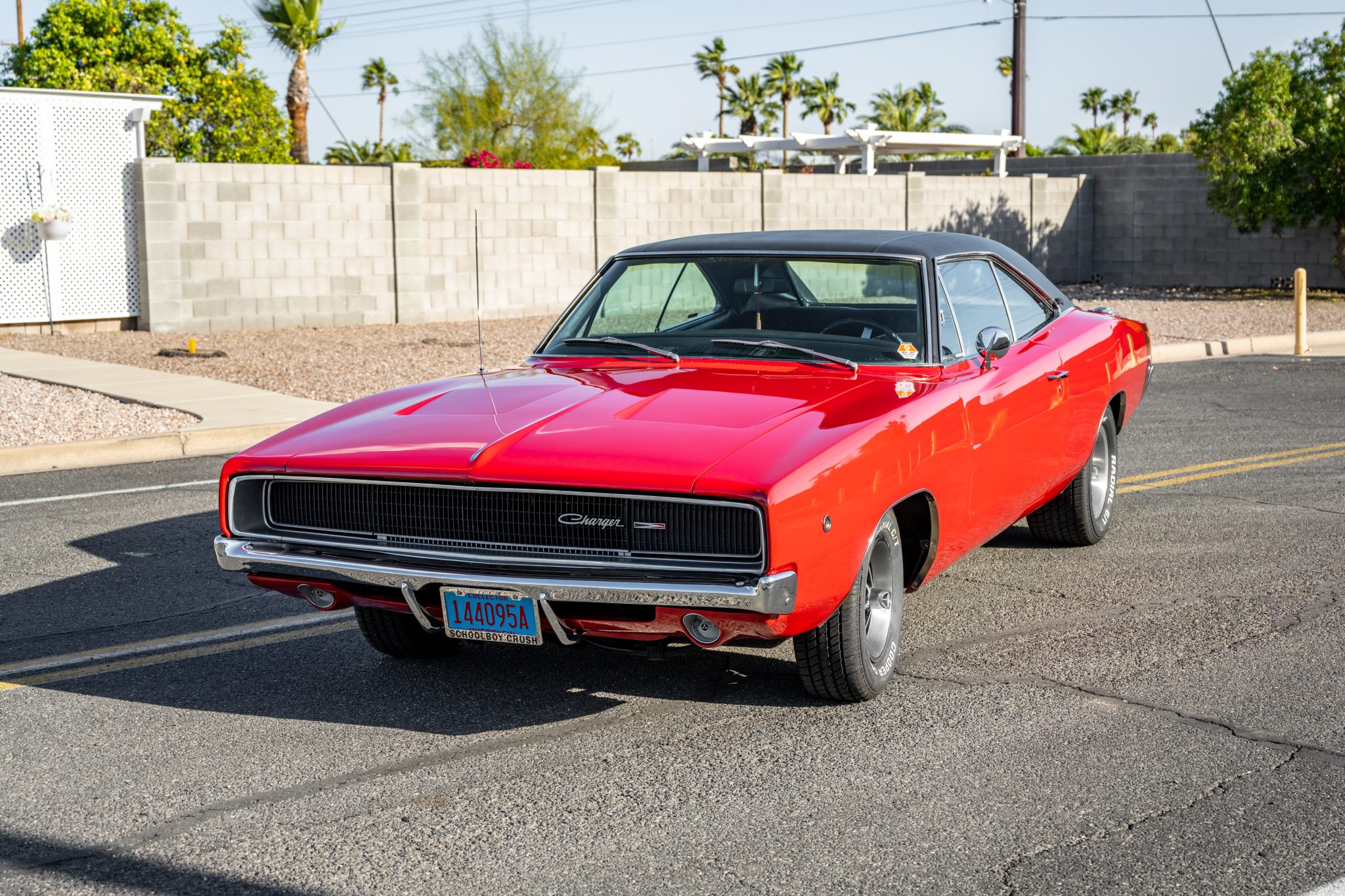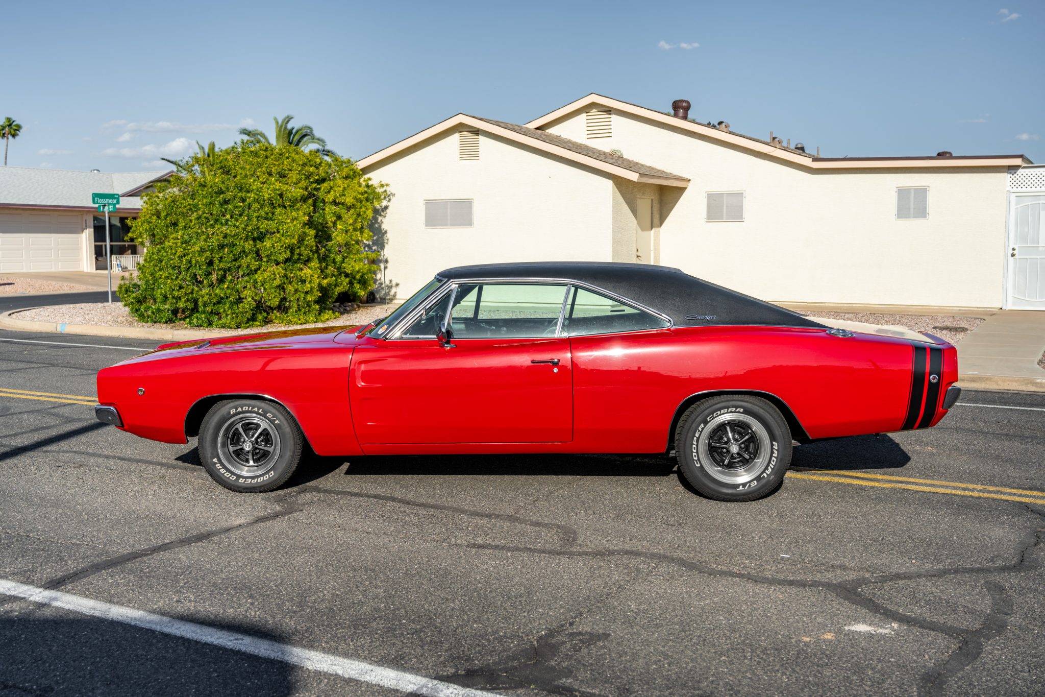 The staggered Magnum-500 style wheels are mounted with Cooper Cobra Radial G/T white-letter tires. A full-size spare is mounted in the trunk. The car is equipped with power steering, and braking is handled by power-assisted drums at all four corners. The steering gearbox and brakes are said to have been replaced during current ownership.