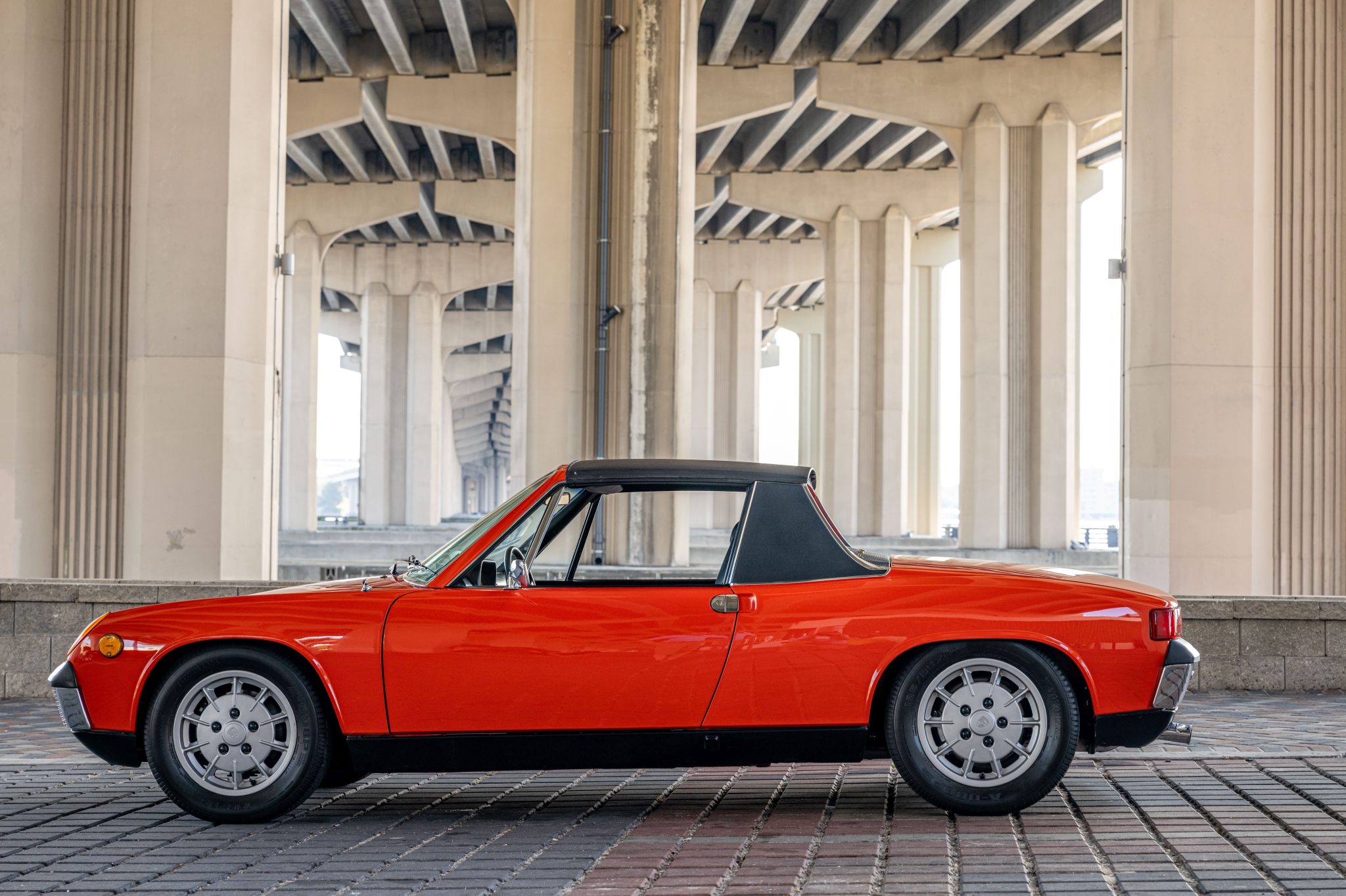 Silver-finished 15″ Mahle “gas burner” alloy wheels are mounted with 195/65 Yokohama A-008P tires, and a matching spare wheel and tire are secured in the front storage compartment. Koni shocks, Turbo-specification tie rods, a front sway bar, and 911S-sourced front calipers are said to have been installed under previous ownership. Service in 2021 included rebuilding the rear brake calipers as well as replacing the brake flex hoses and front calipers.
