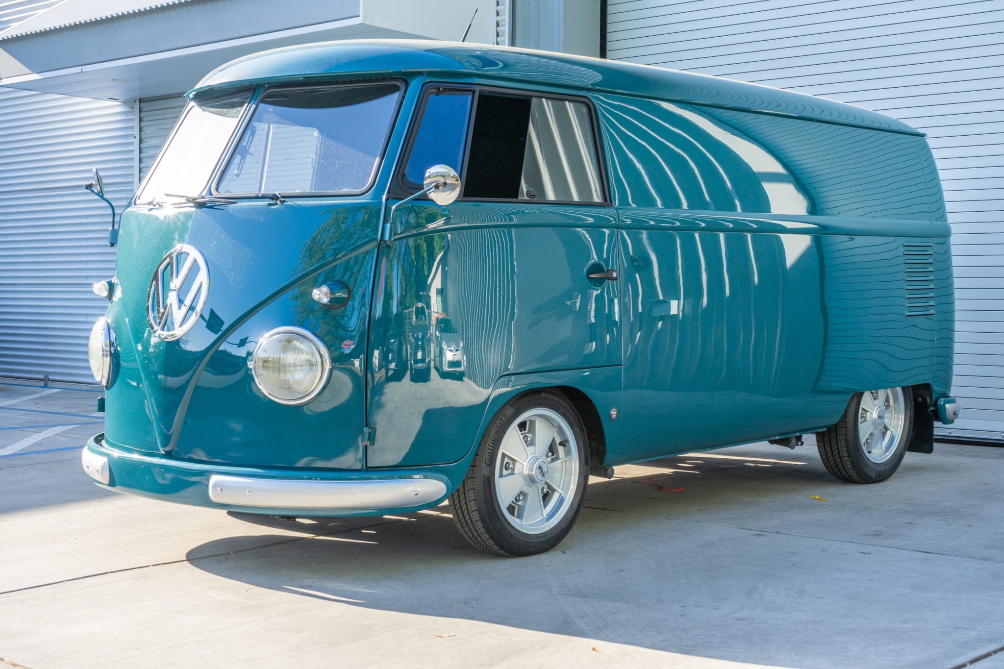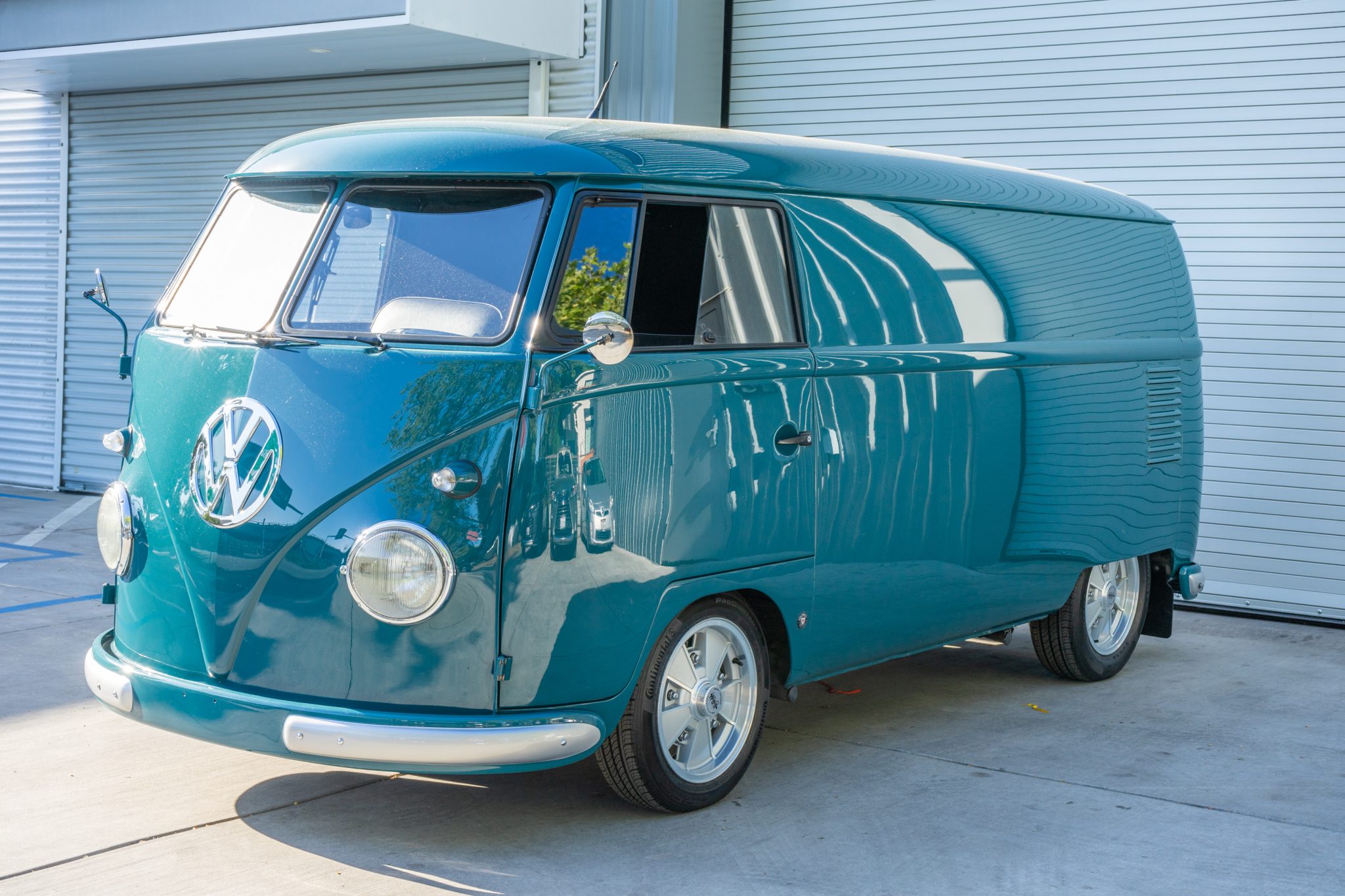 Aftermarket 15″ EMPI-style wheels wear 165/65 front and 195/65 rear Continental tires that were installed in March 2022. EMPI front disc brakes were also fitted at that time, and the van is equipped with KYB Gas-a-Just shocks.
