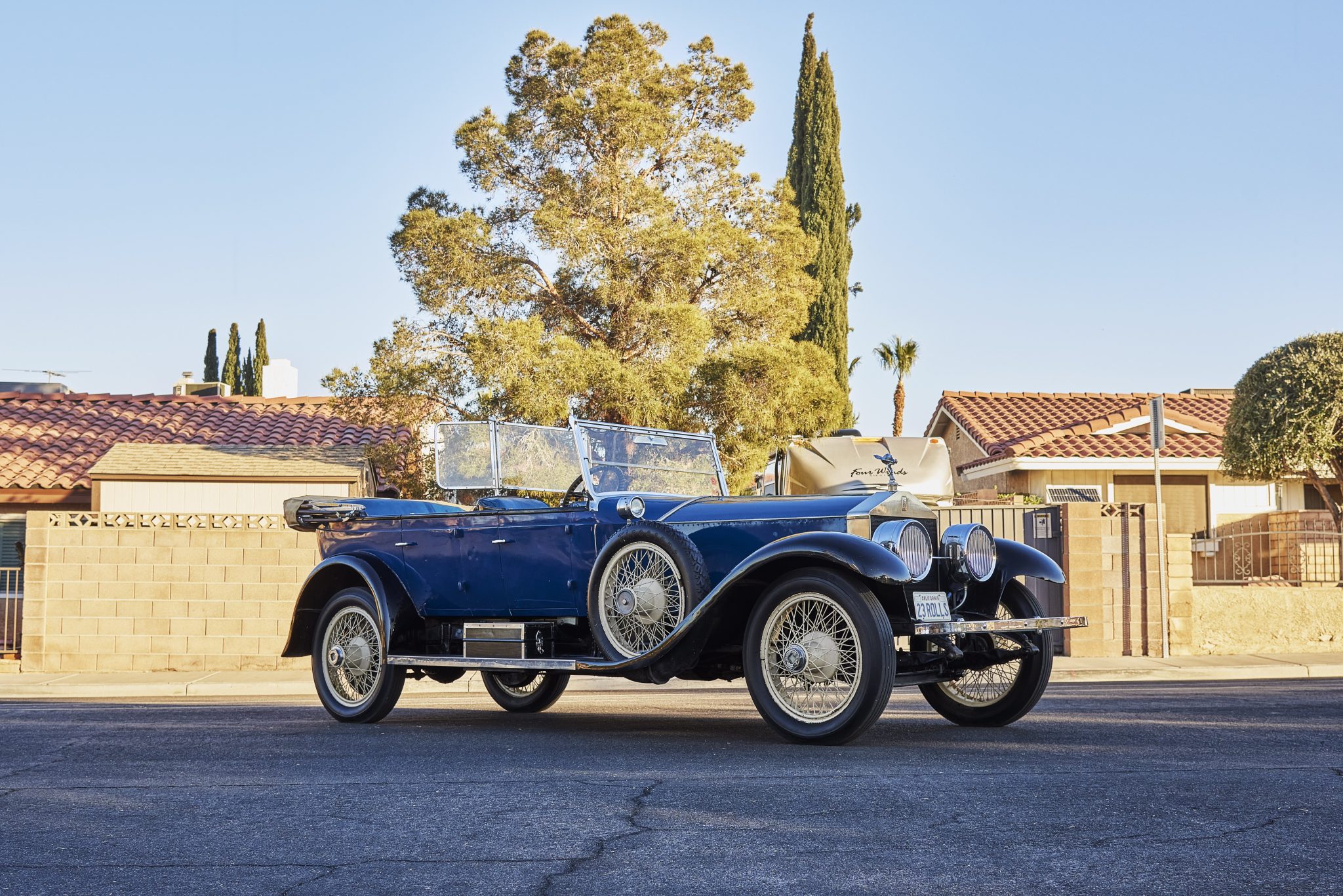 This example’s four-door open tourer styling was named the Oxford in keeping with the Springfield subsidiary’s system of naming bodywork variants after British landmarks. The body was repainted in its current shade of blue with black fenders and cockpit perimeter trim during the early years of the family’s ownership in favor of the car’s previous yellow shade. Various dings and imperfections are exhibited on areas of the body.