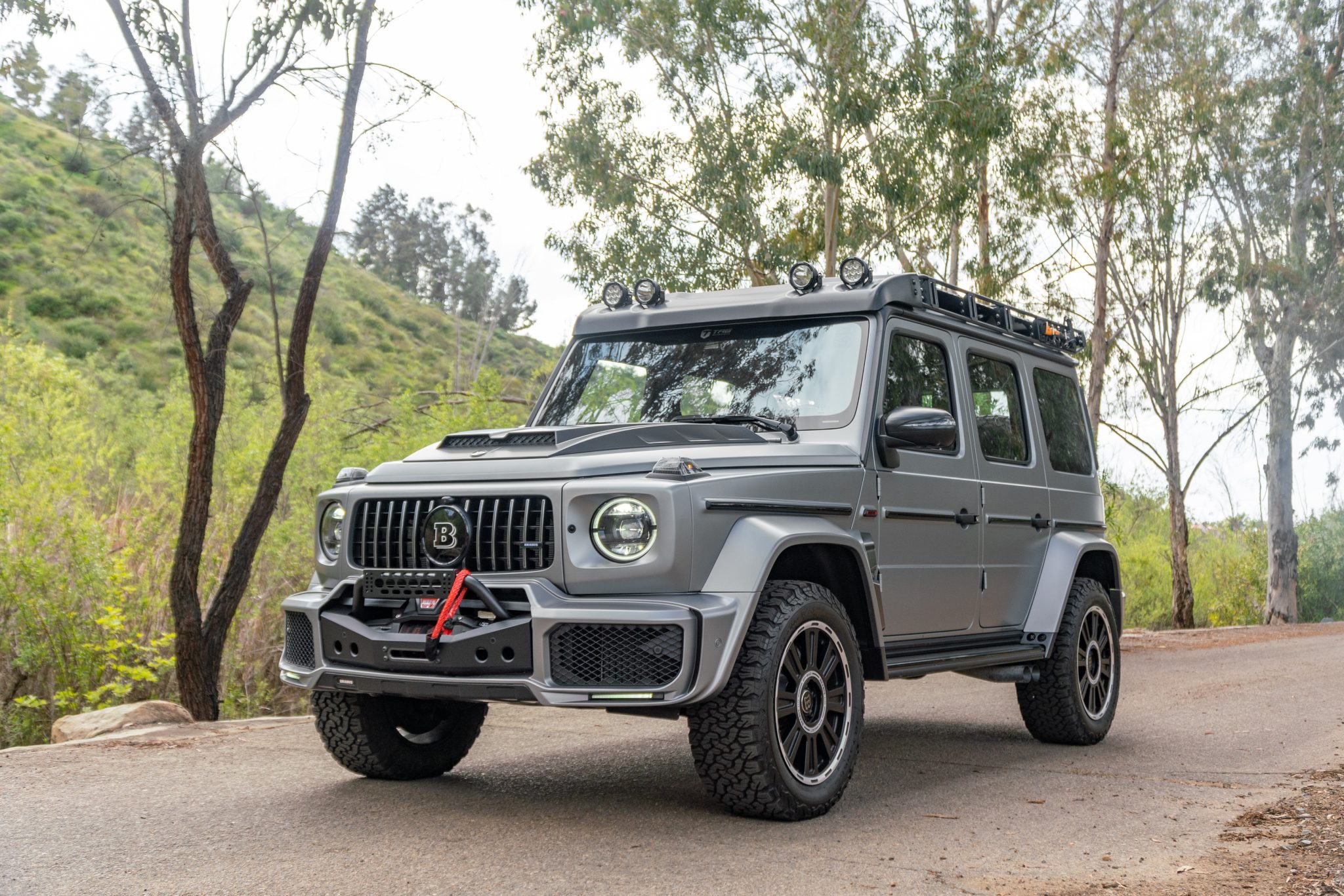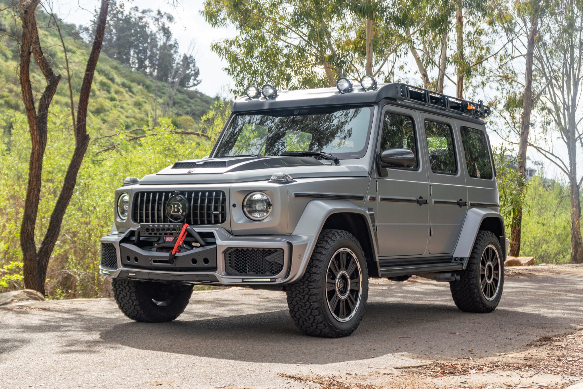 Brabus 20″ HD forged wheels are wrapped in 285/55 BFGoodrich All-Terrain T/A KO2 tires. A matching spare is fitted to a Brabus swing-away tire carrier. Braking is handled by cross-drilled and vented rotors with gray-finished AMG calipers, and Brabus suspension updates include taller springs with adjustable coilovers.